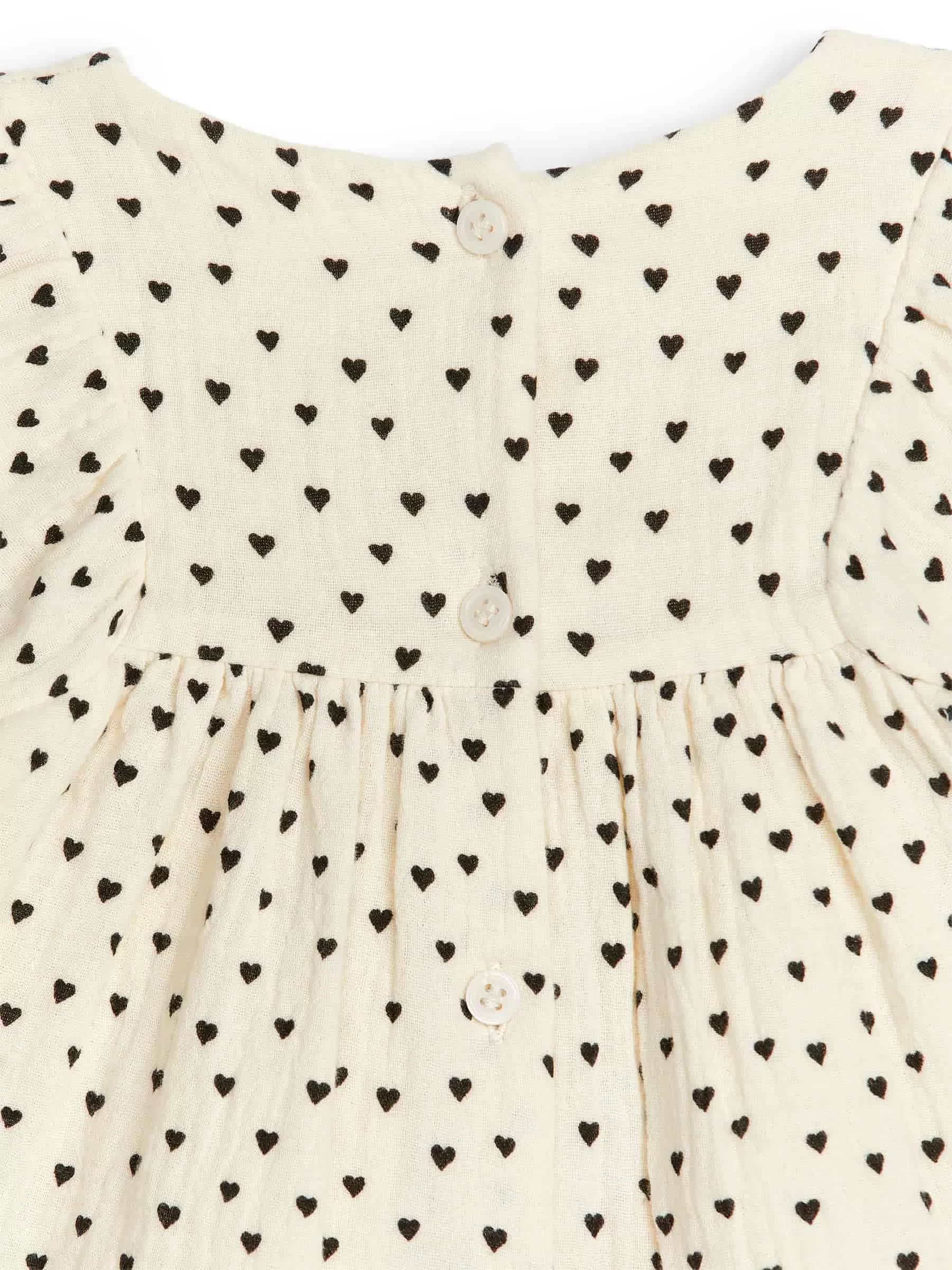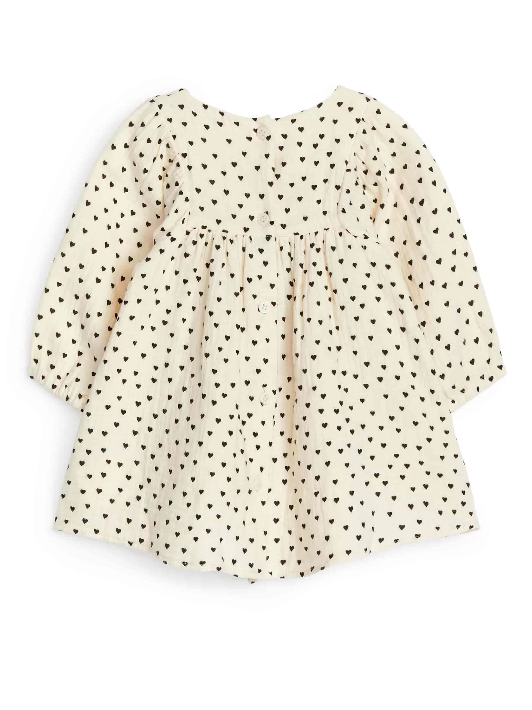 Long-sleeved dress made from soft cotton muslin with a tactile texture. An oversized style with button closure at centre back and puffy sleeves with elastics at endings.