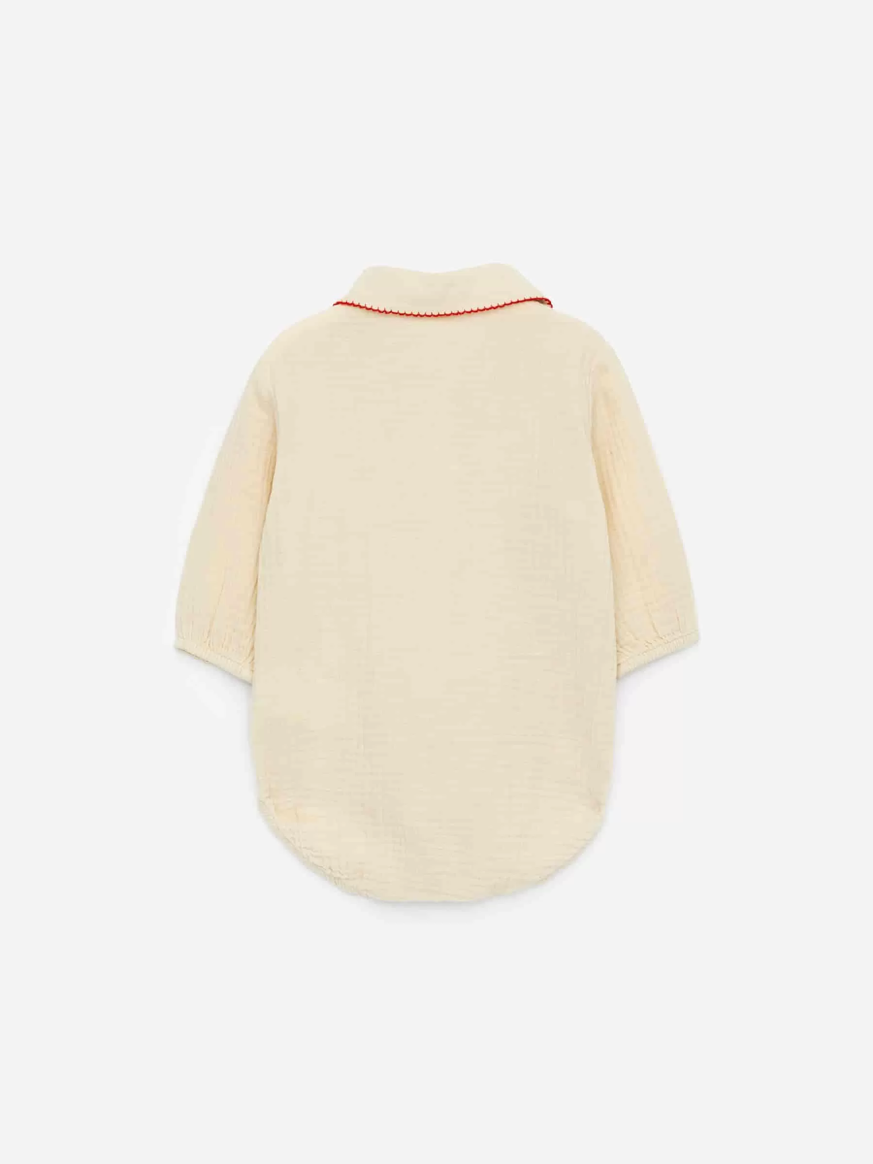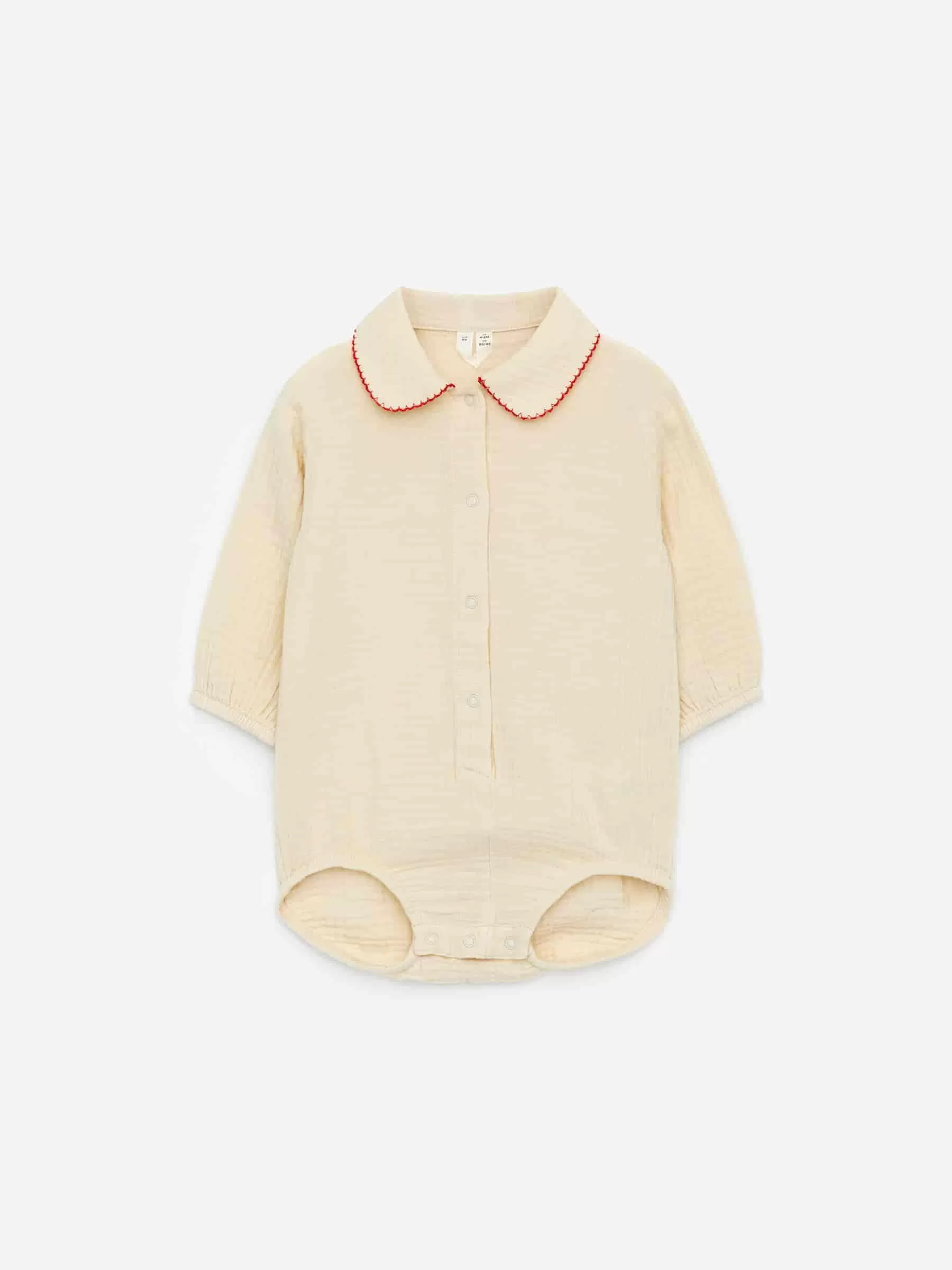 Romper in a soft muslin weave made from cotton. Styled with a rounded collar with blanket stitch detailing. Press buttons at front and at crotch.