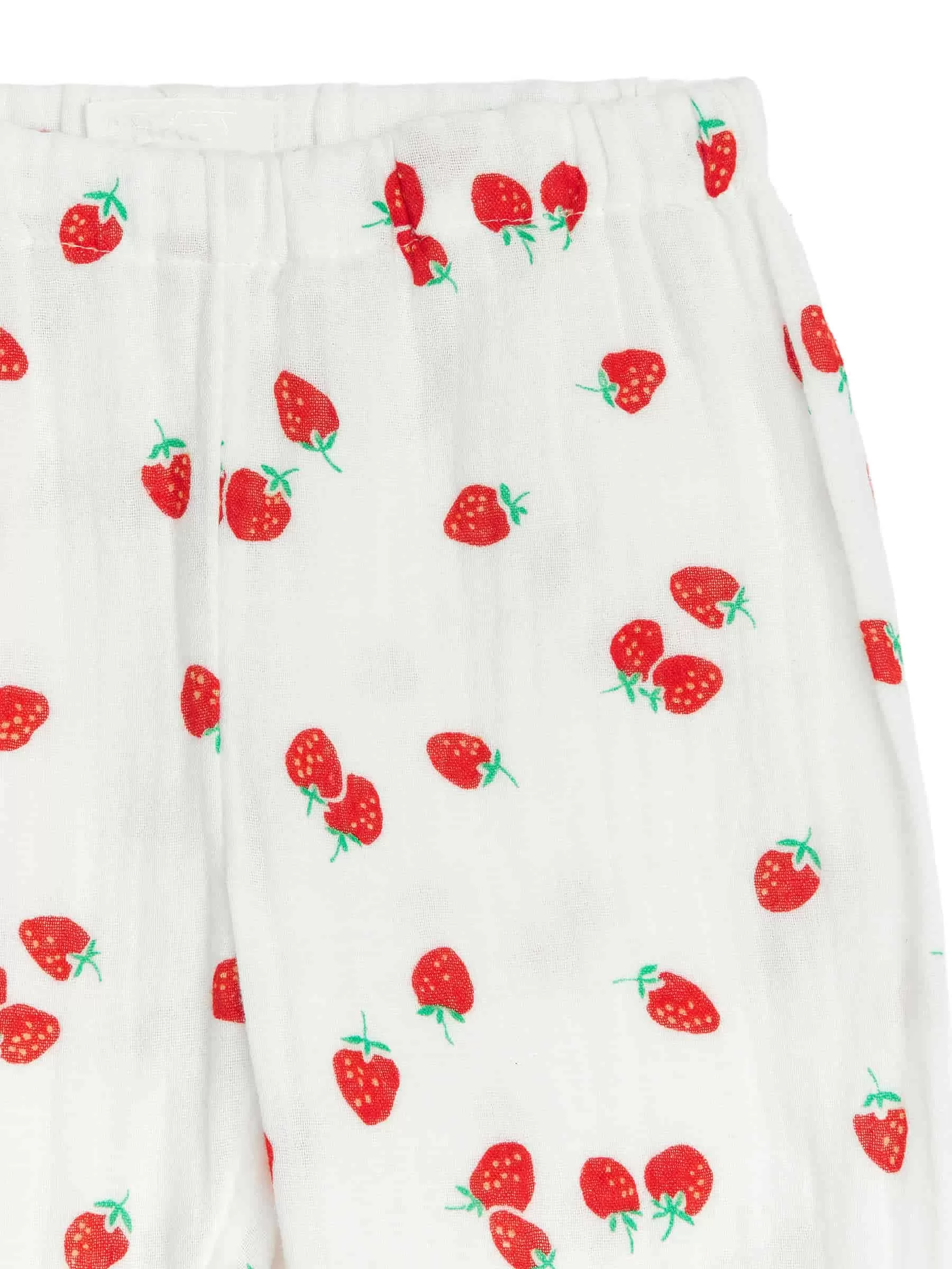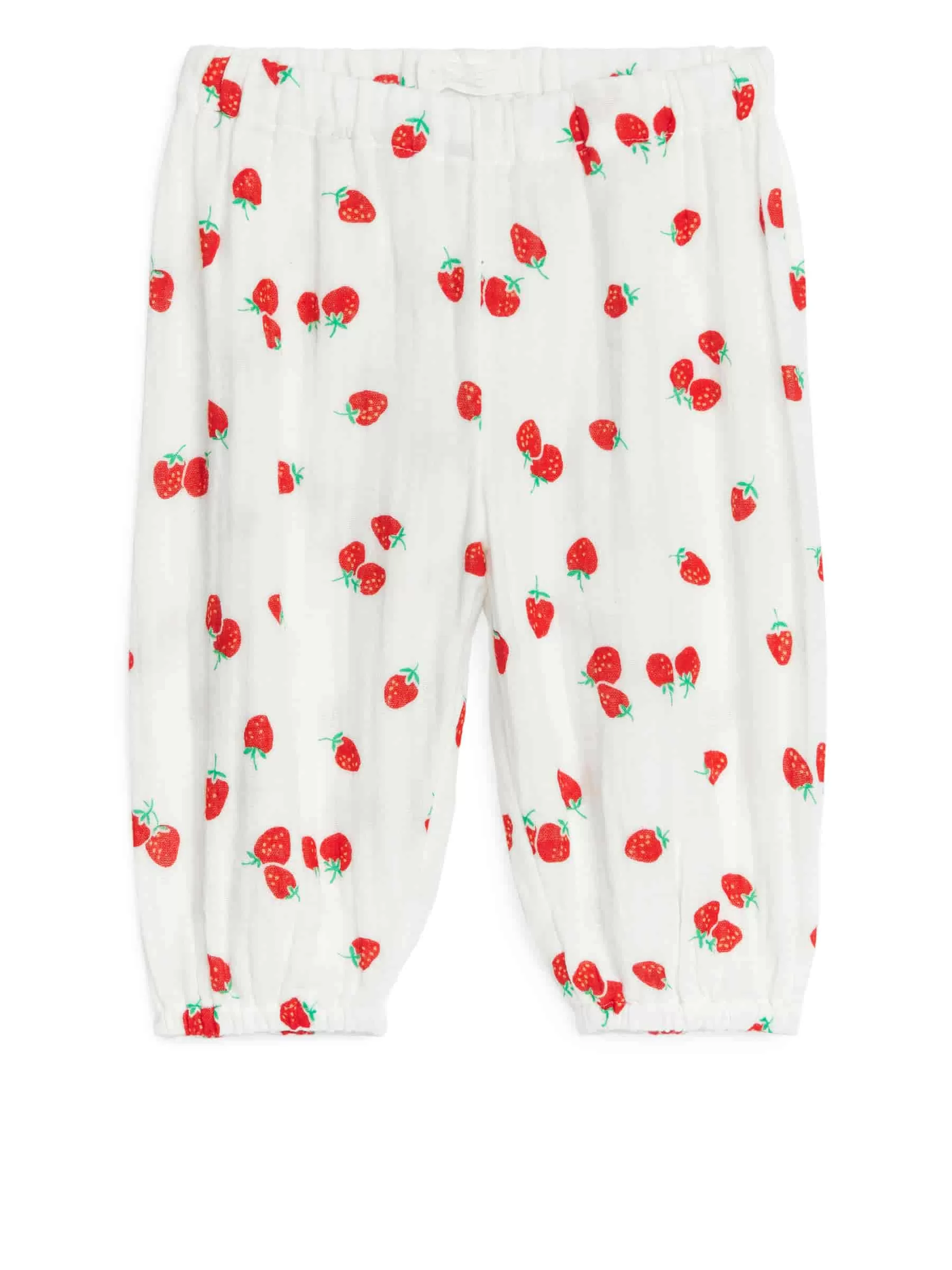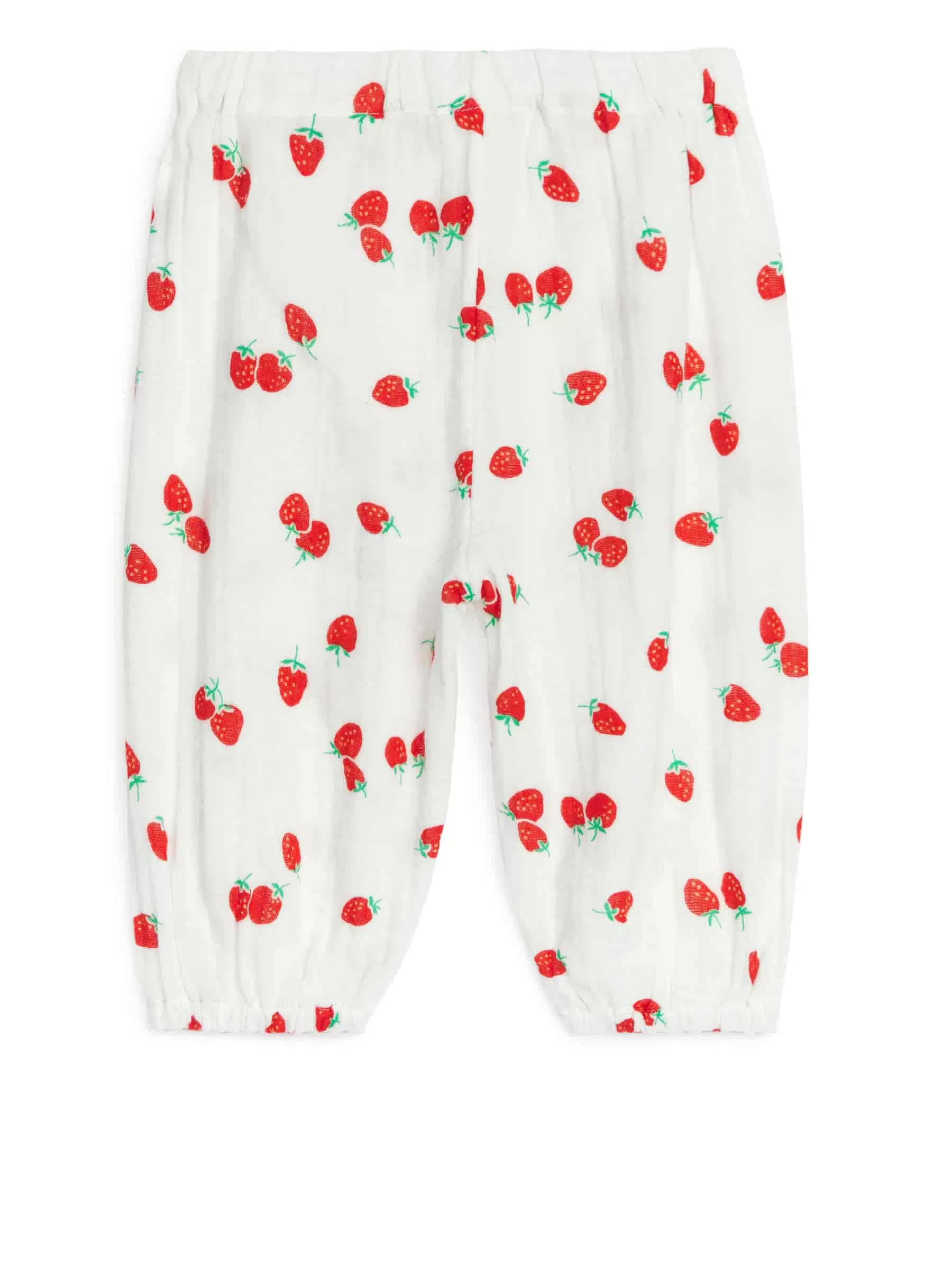 Trousers cut from soft cheesecloth material woven from cotton. A practical pull-on style with adjustable elastics at waist and end of legs.