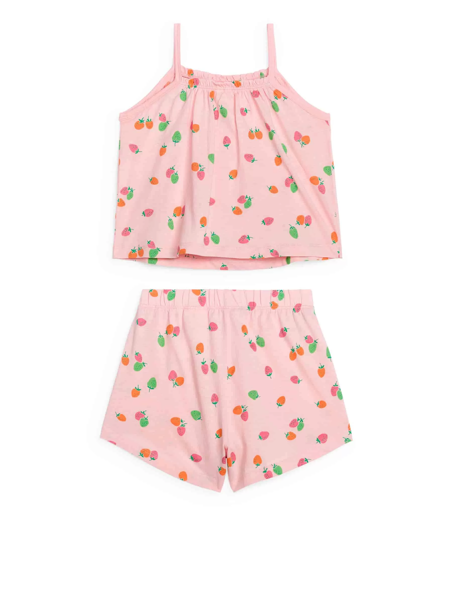 Two-piece pyjama set made of cotton. Strap top with ruched detail at front neckline and shorts with elastics at waist.