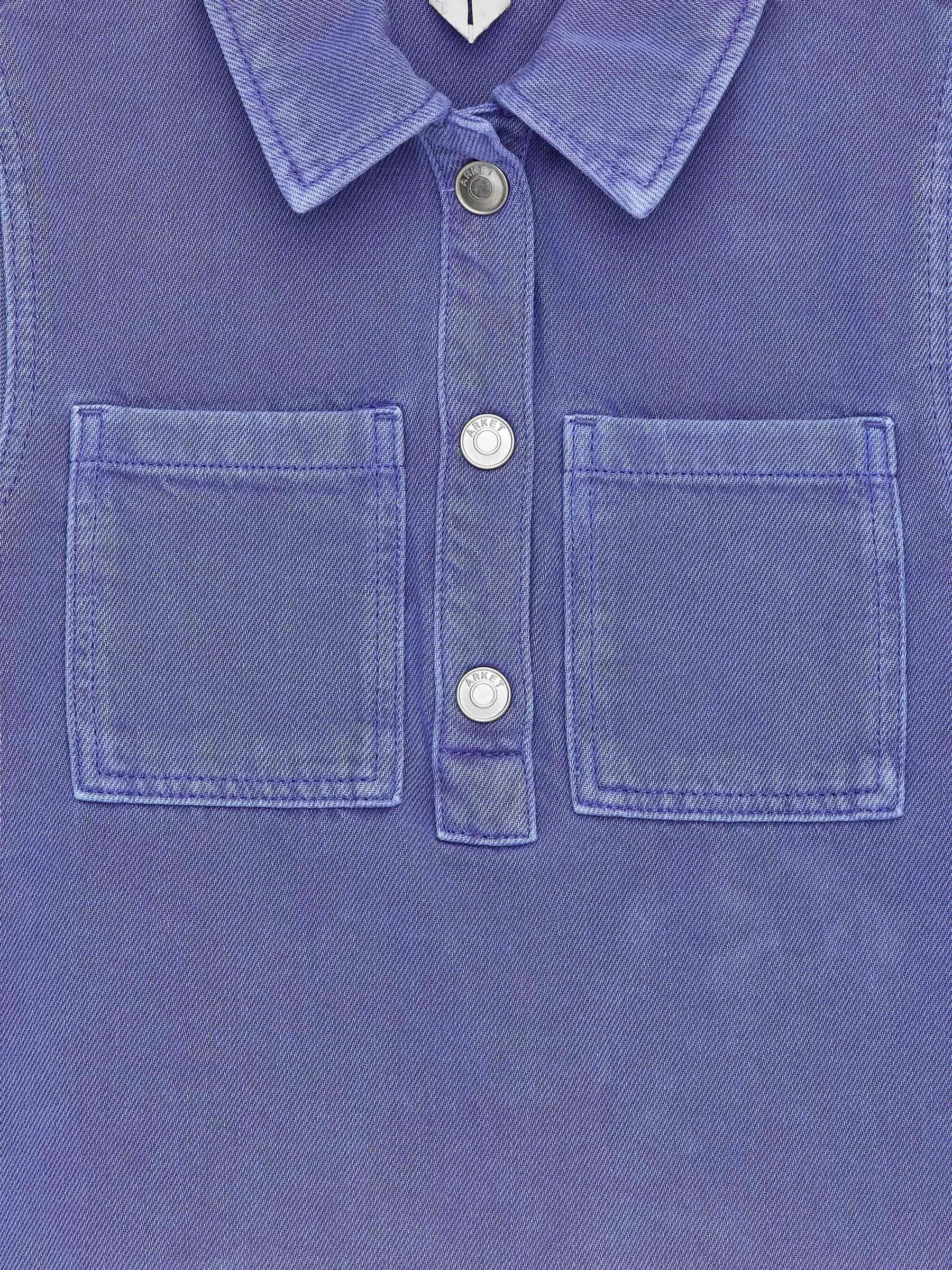 Long-sleeved denim dress crafted from cotton. Patch pockets at chest and buttoned front placket with snap buttons.