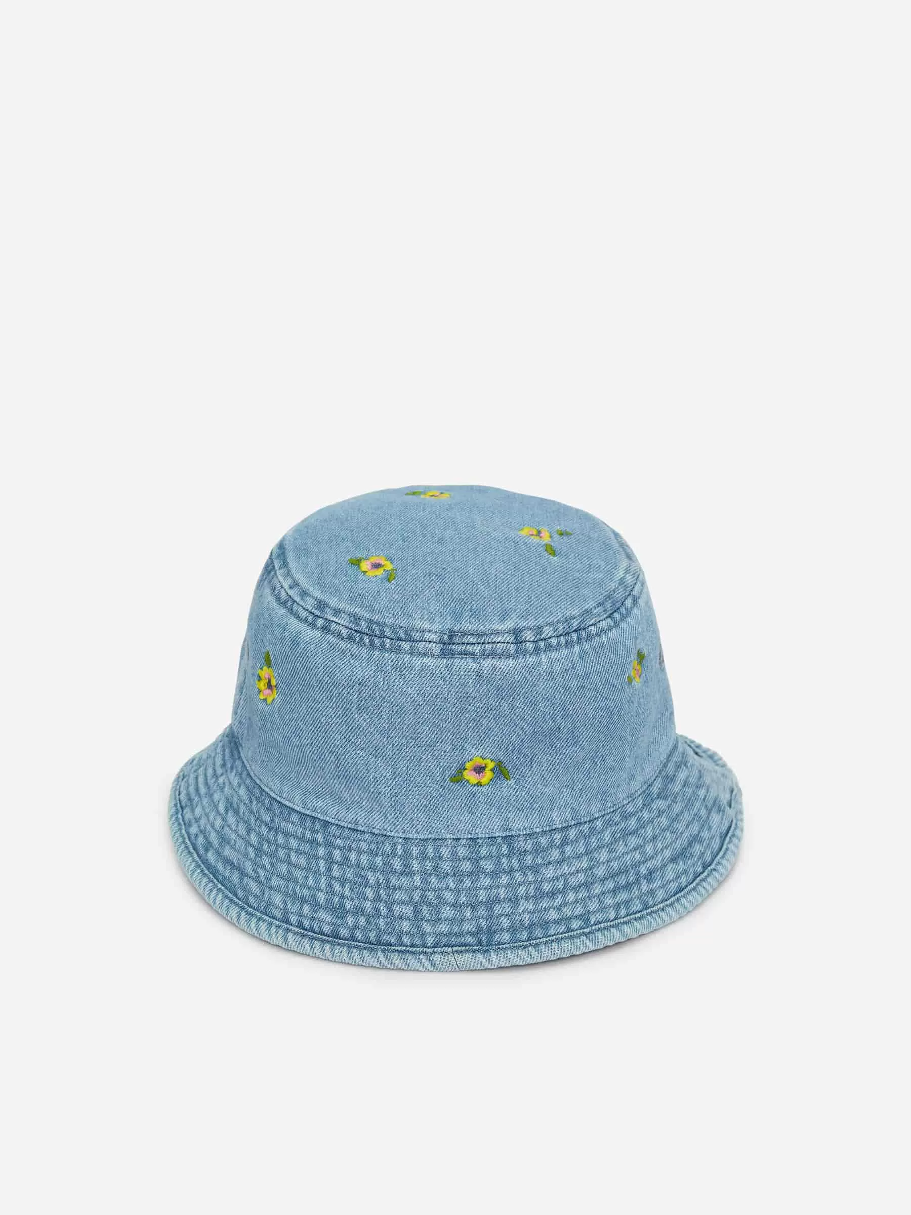 Denim bucket hat with embroidered detailing made from a durable cotton weave. Mid-length brim that offers protection from the sun.
