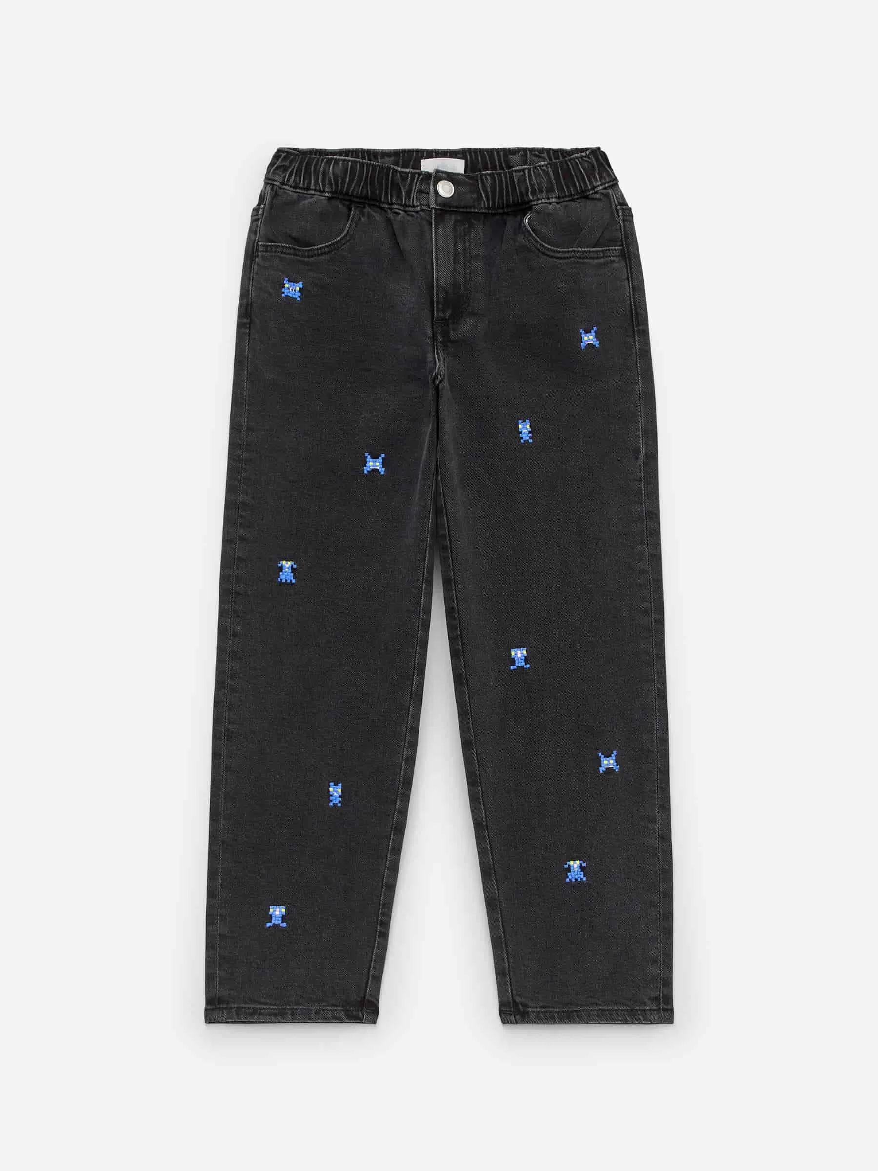 Pull-on cotton denim trousers with elastics and press button at waist. Styled with embroidered detailing and front and back pockets. Tapered legs.