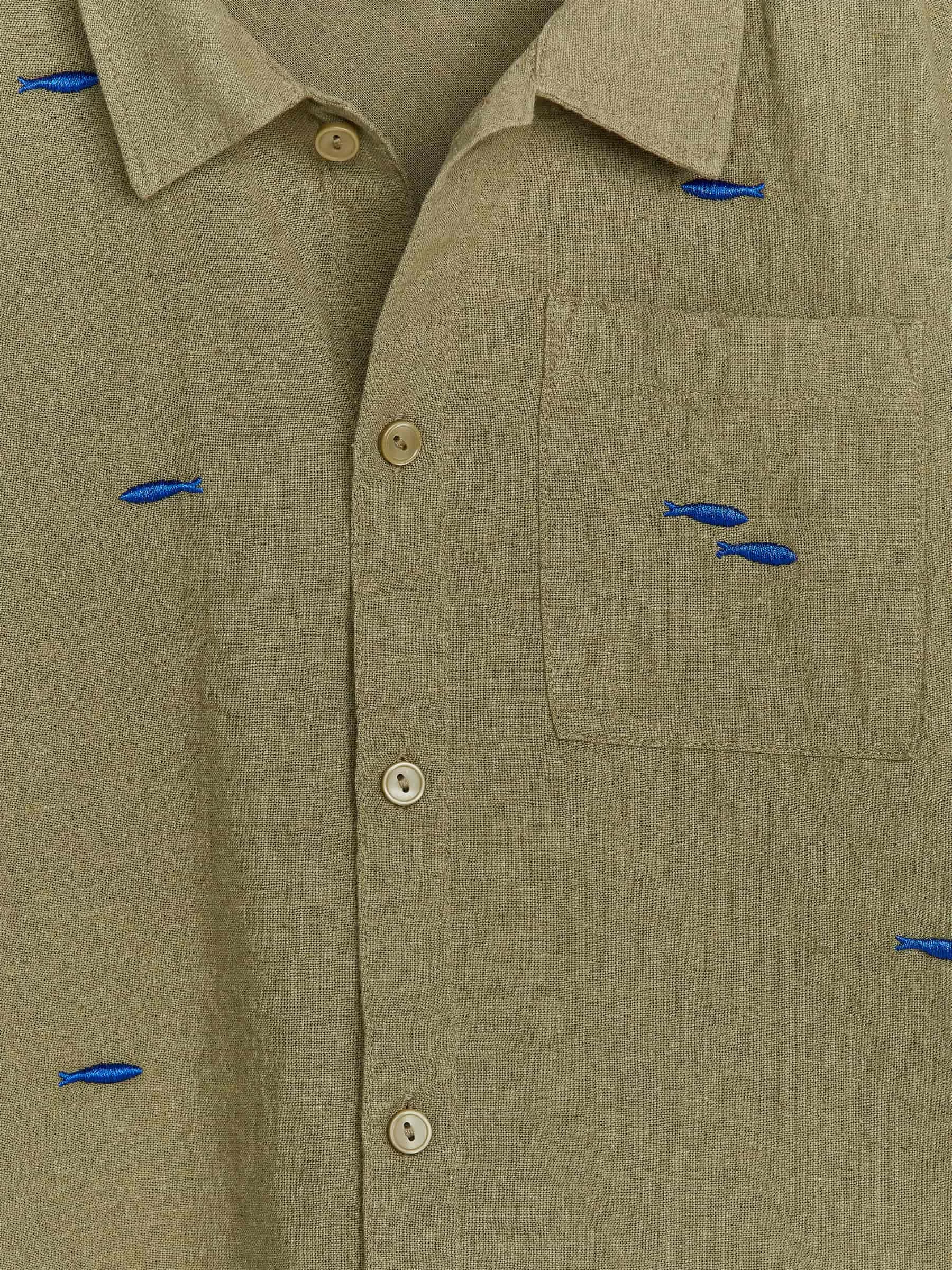Short-sleeved linen-cotton shirt with embroidered detailing. Styled with a front patch pocket and side slits. Regular fit. Part of set.