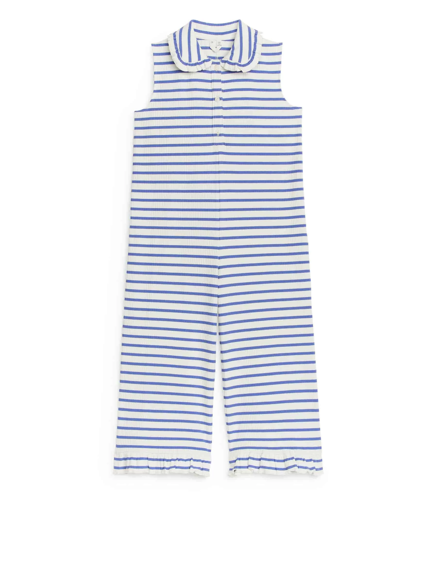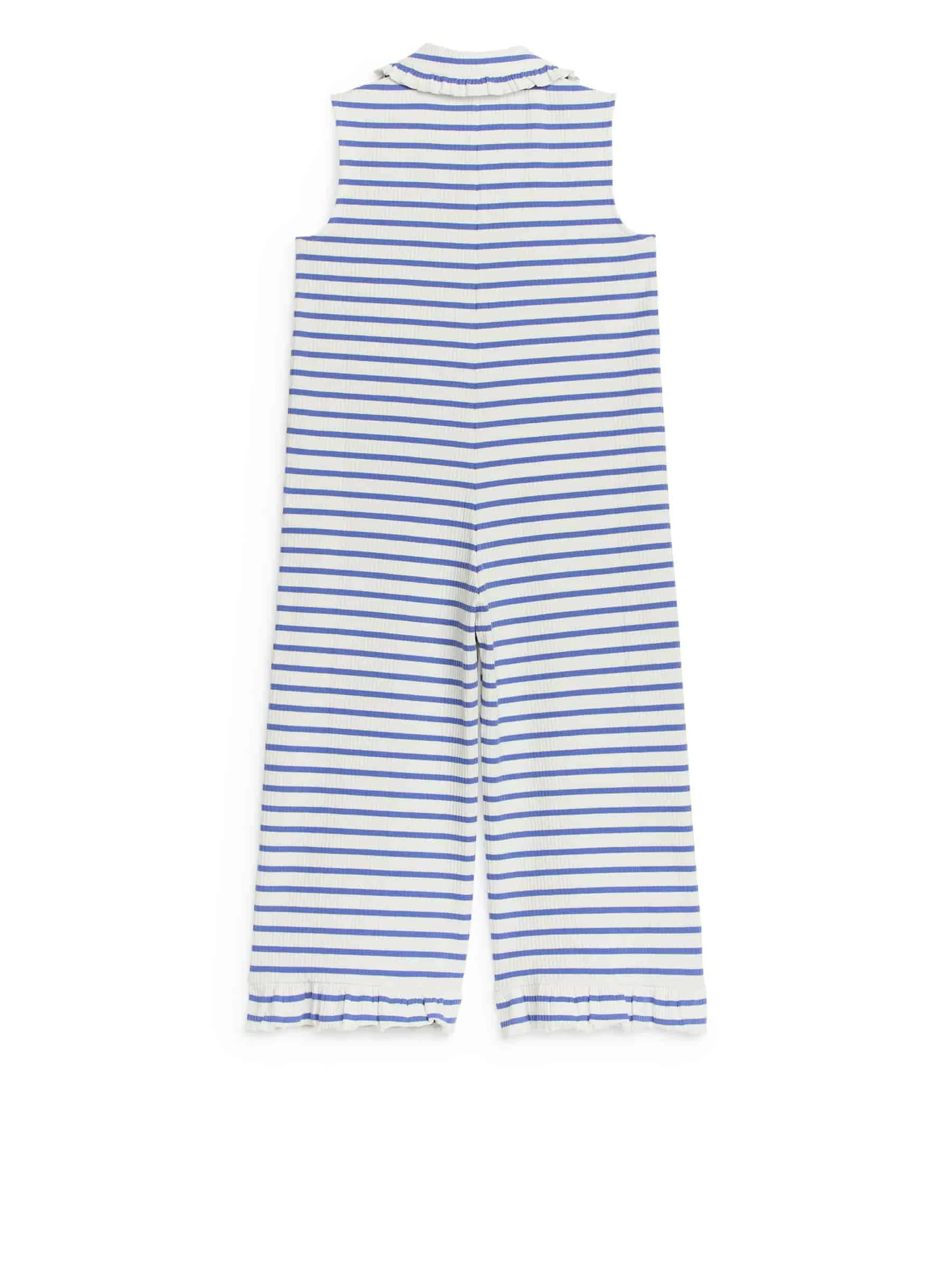Sleeveless jumpsuit with a rib-knitted texture crafted from stretchy cotton. Double-layer collar with frill, snap button closure and frill and babylock edges at bottom hem.