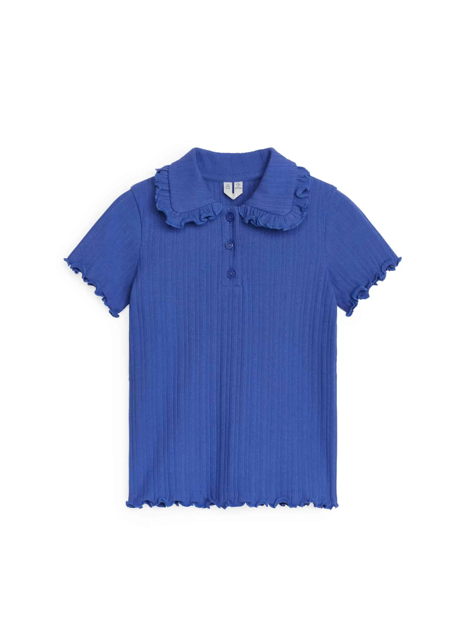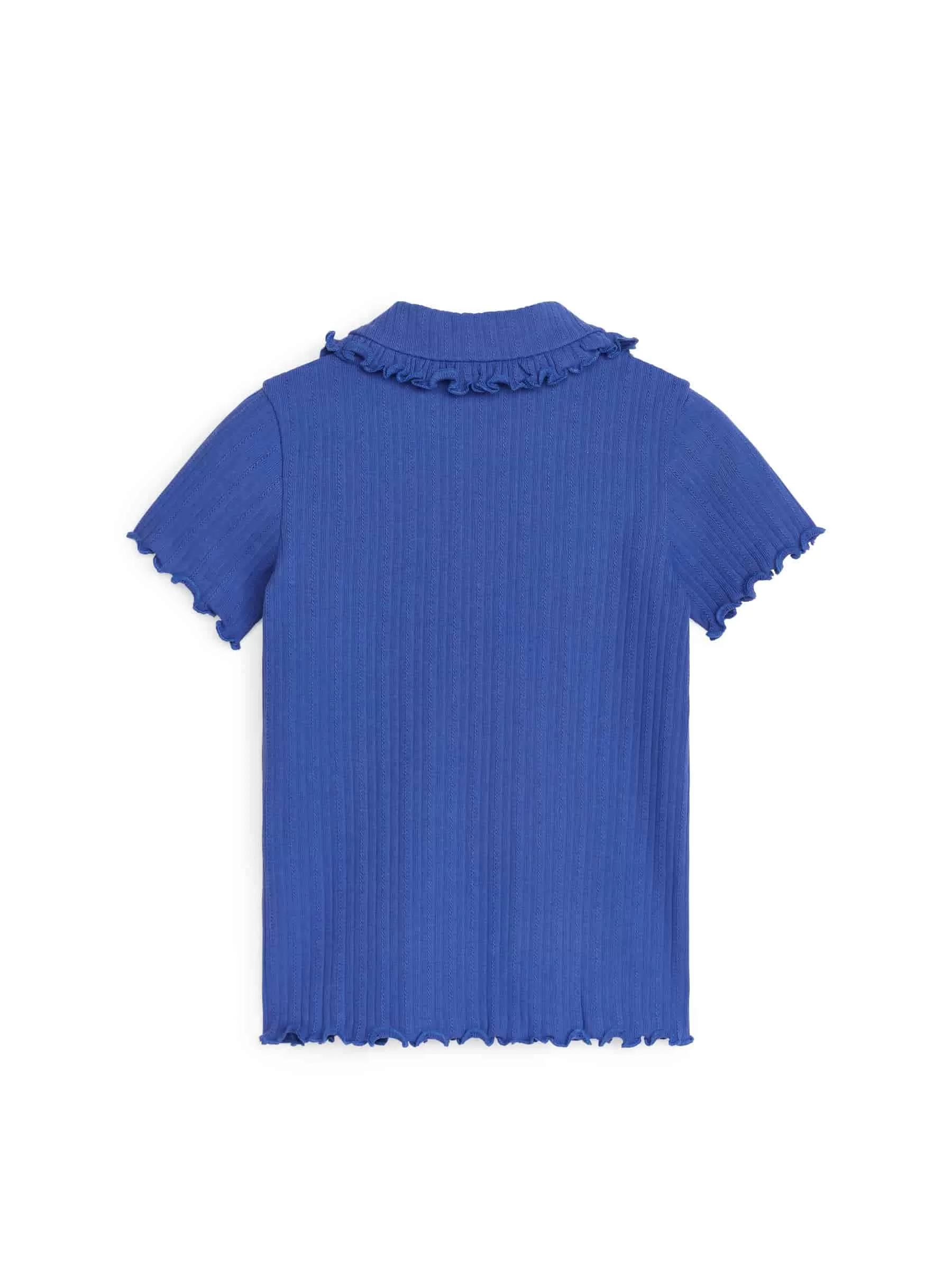 Short-sleeved T-shirt crafted from ribbed jersey. Featuring a round, frill collar with a half-button front and frilled edges.