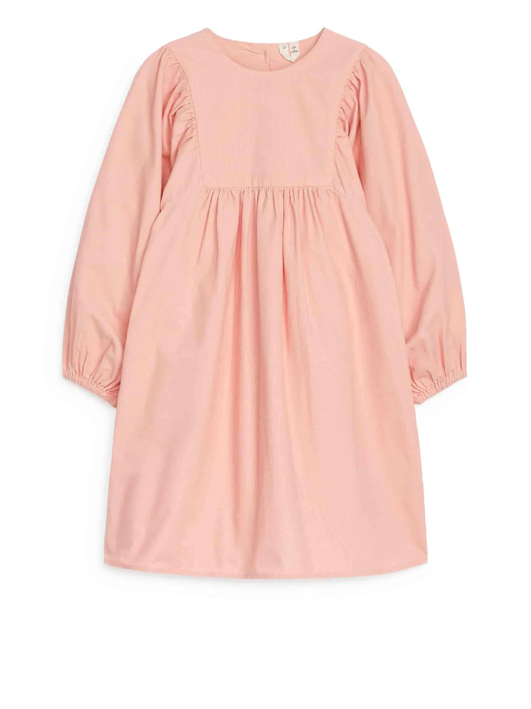 Long-sleeved cotton dress with gathers and button closure at back. Elastics at sleeve edges.