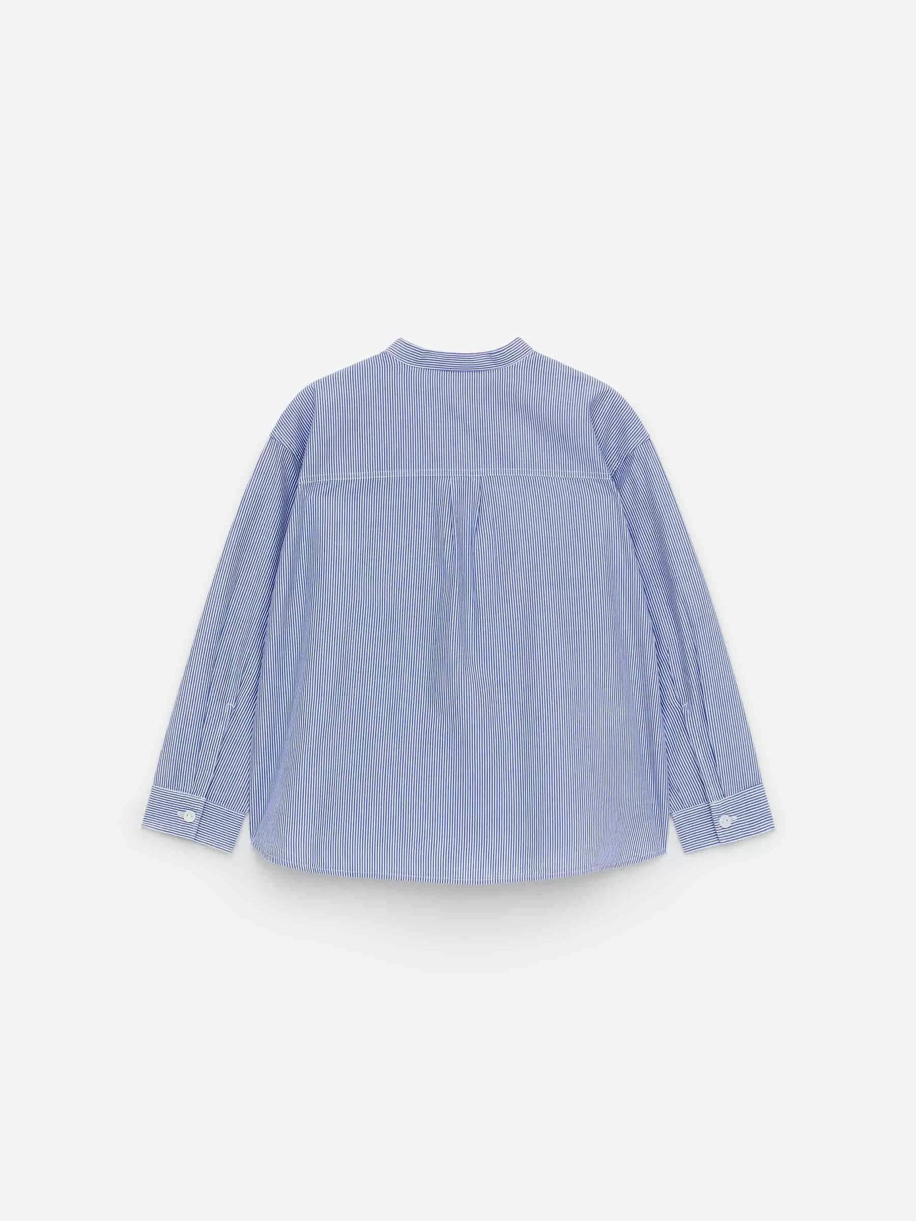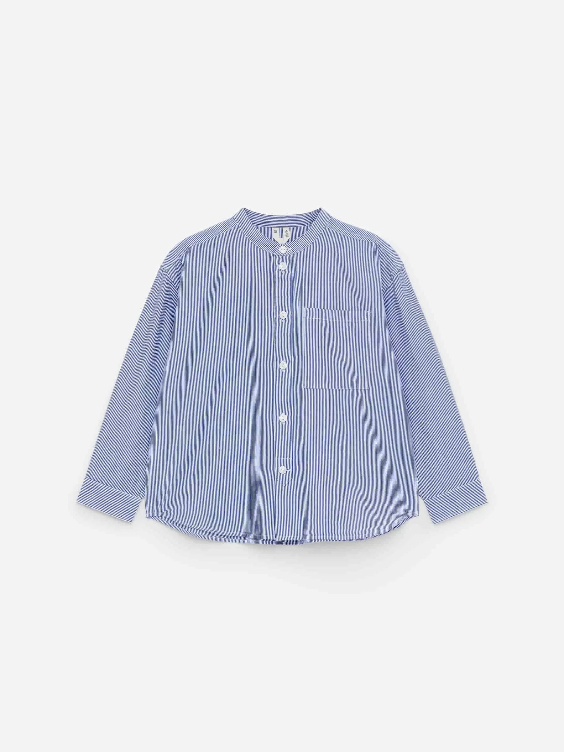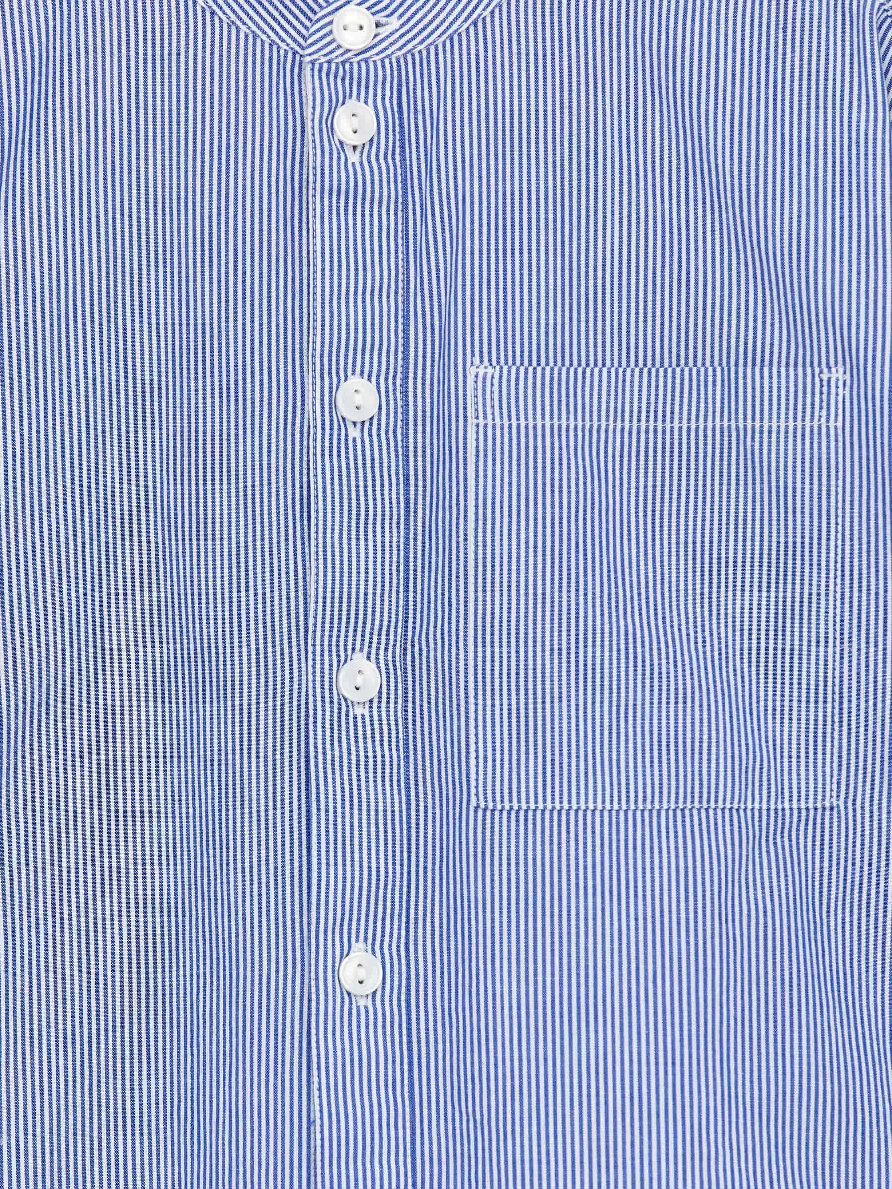 Grandpa shirt with standing collar and buttoned cuffs. Detailed with a single patch pocket at chest.