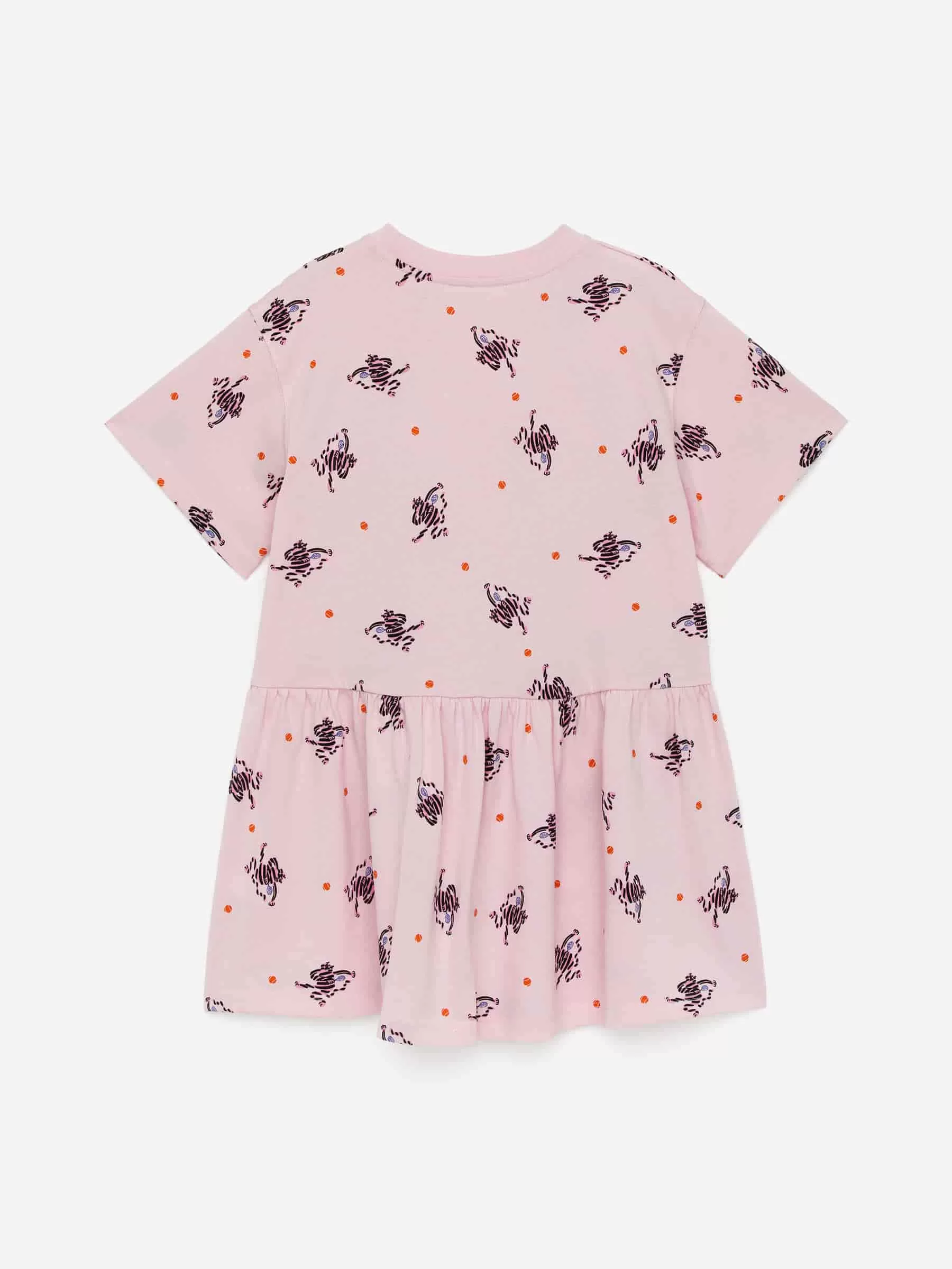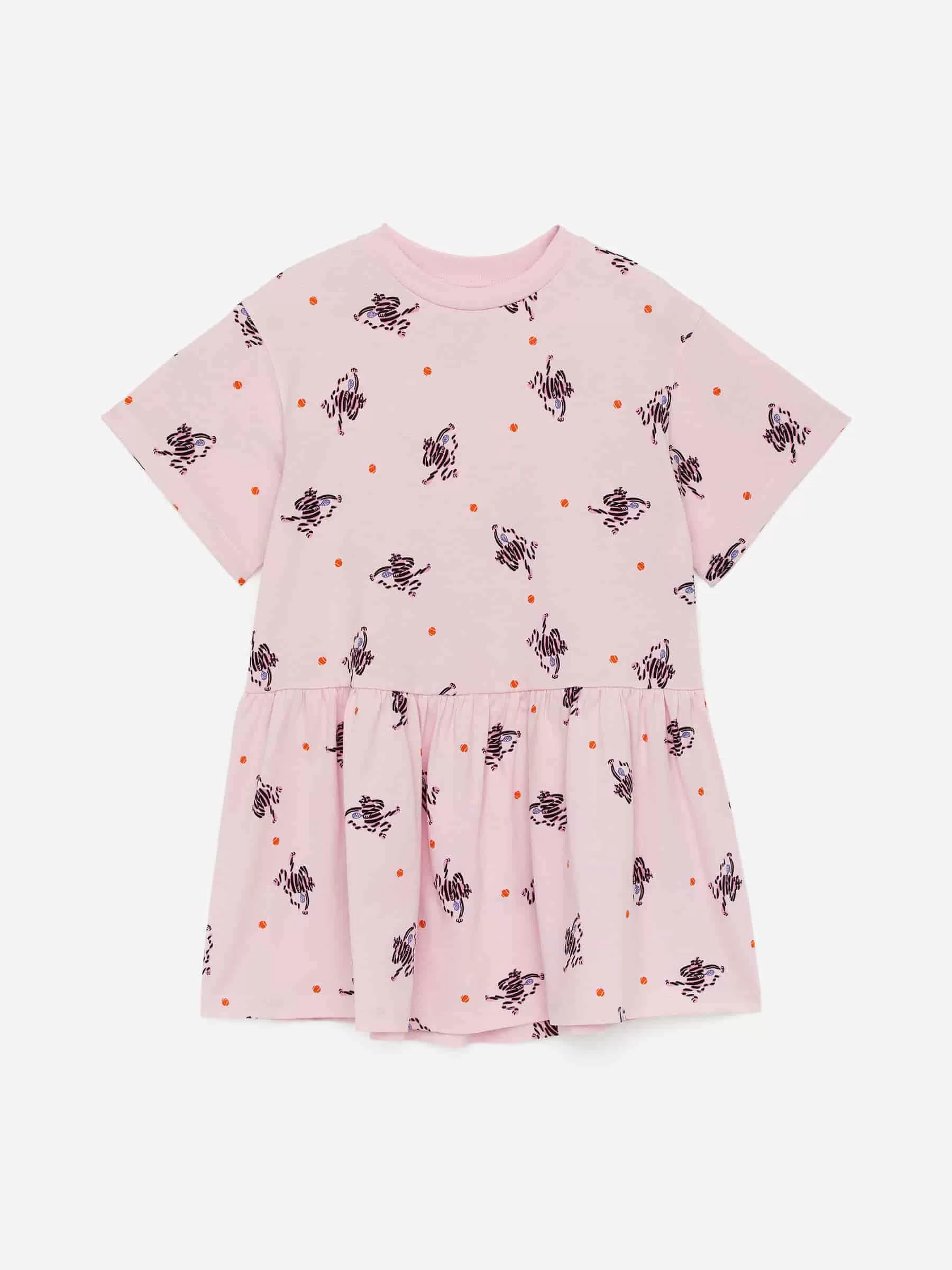 Short-sleeve frill dress crafted from a soft cotton jersey. Cut for a relaxed fit with ribbed trimming at neckline and gatherings at waist.