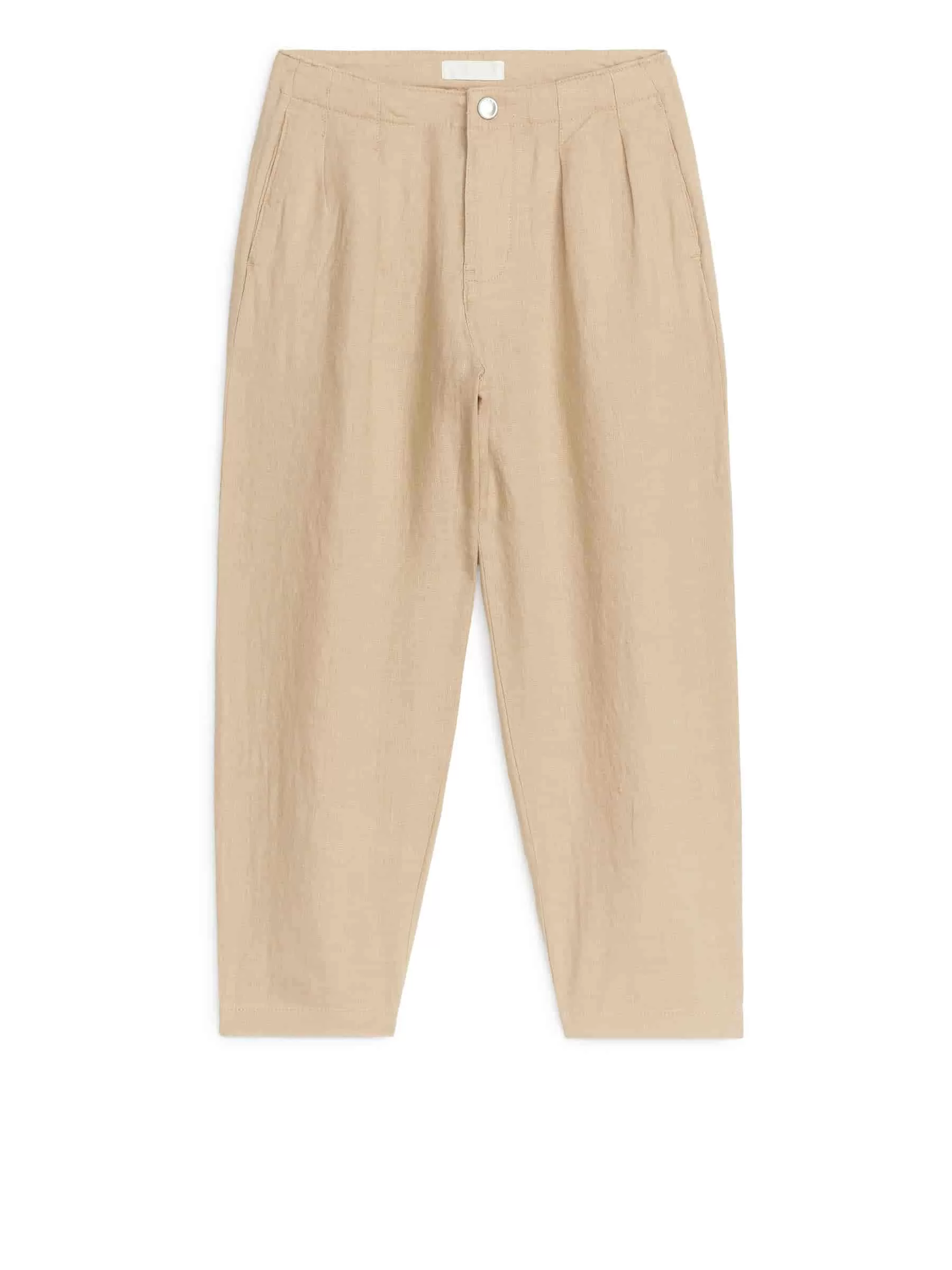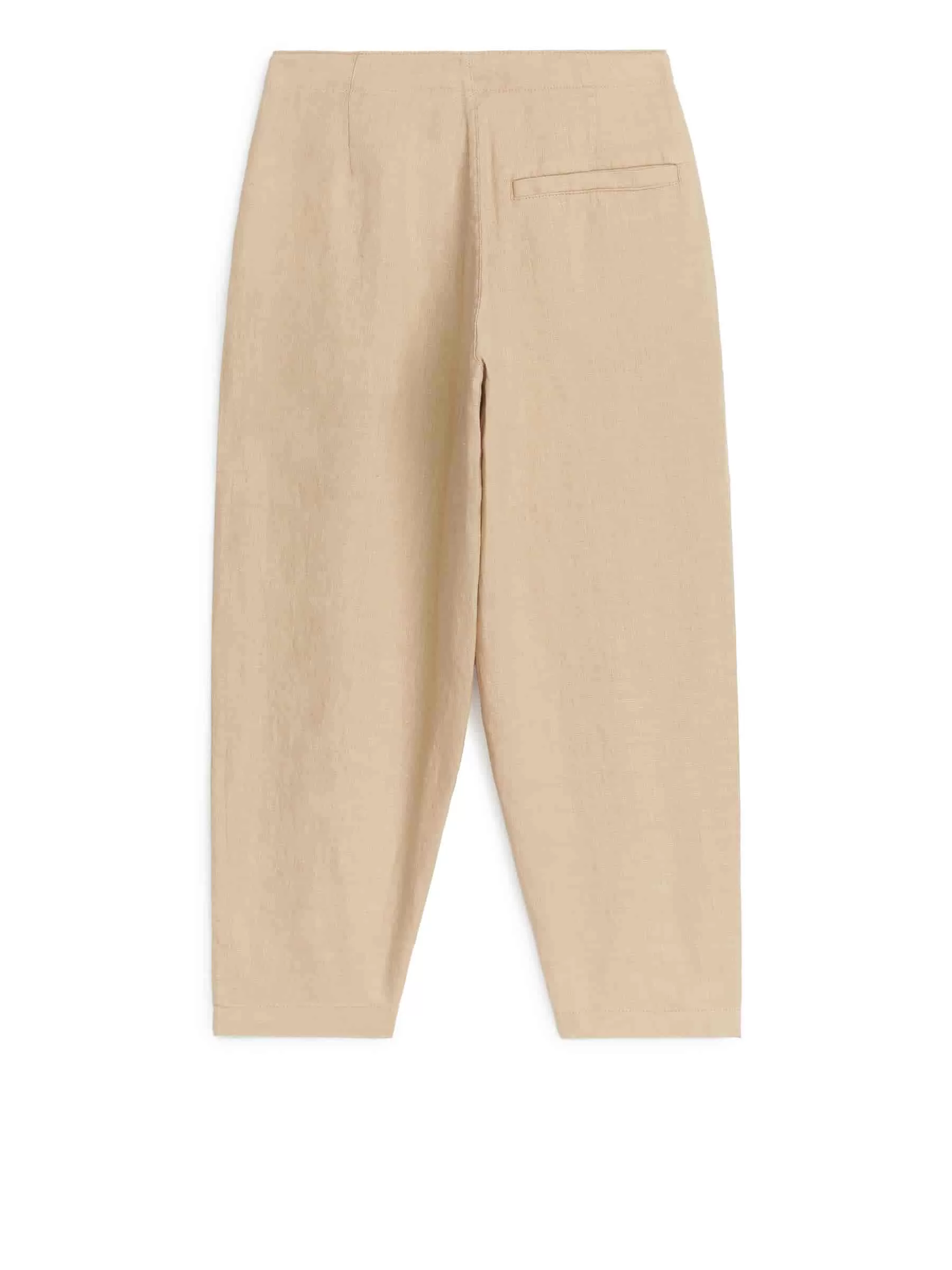 Linen trousers crafted from a soft linen weave. Detailed with adjustable elastics at waist and pleats at front. Side pockets and a single welt pocket at back.