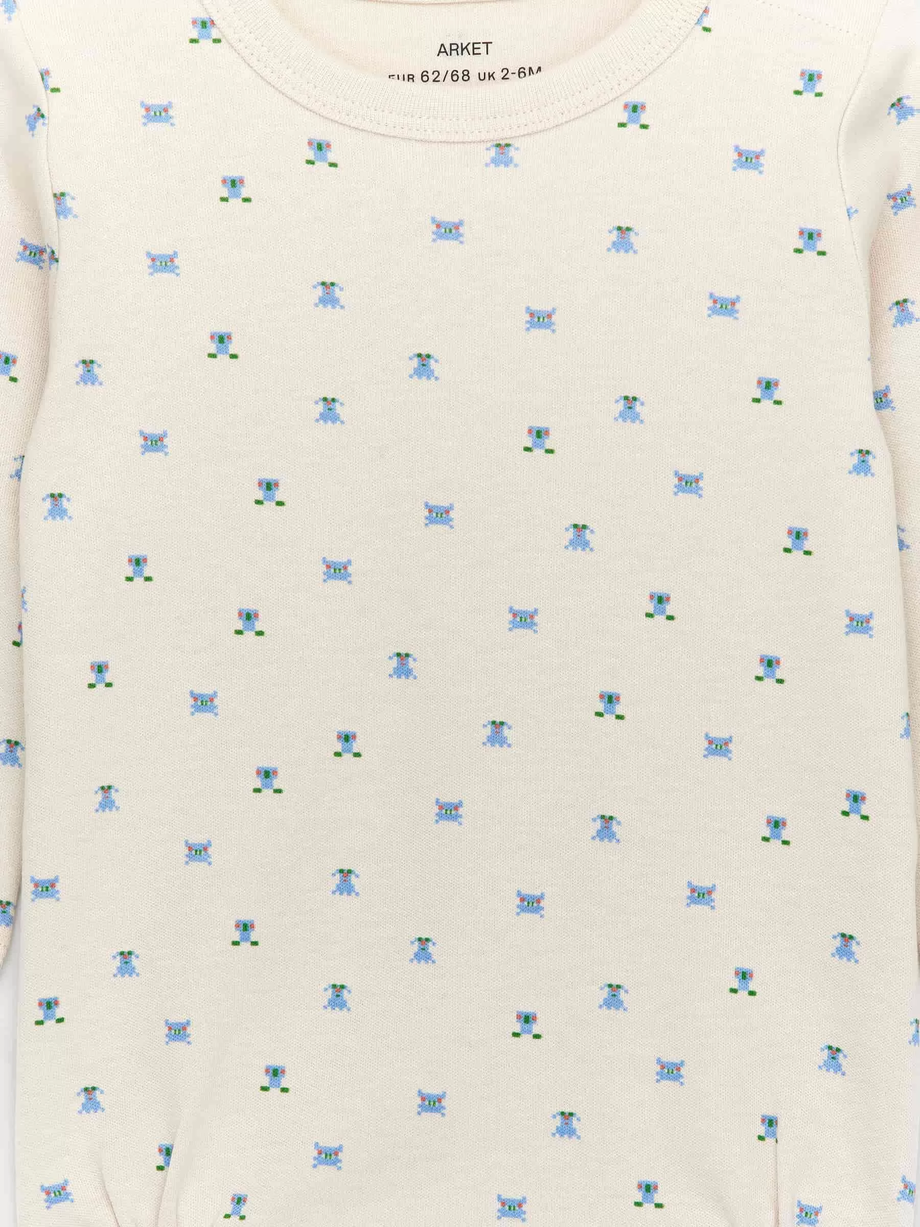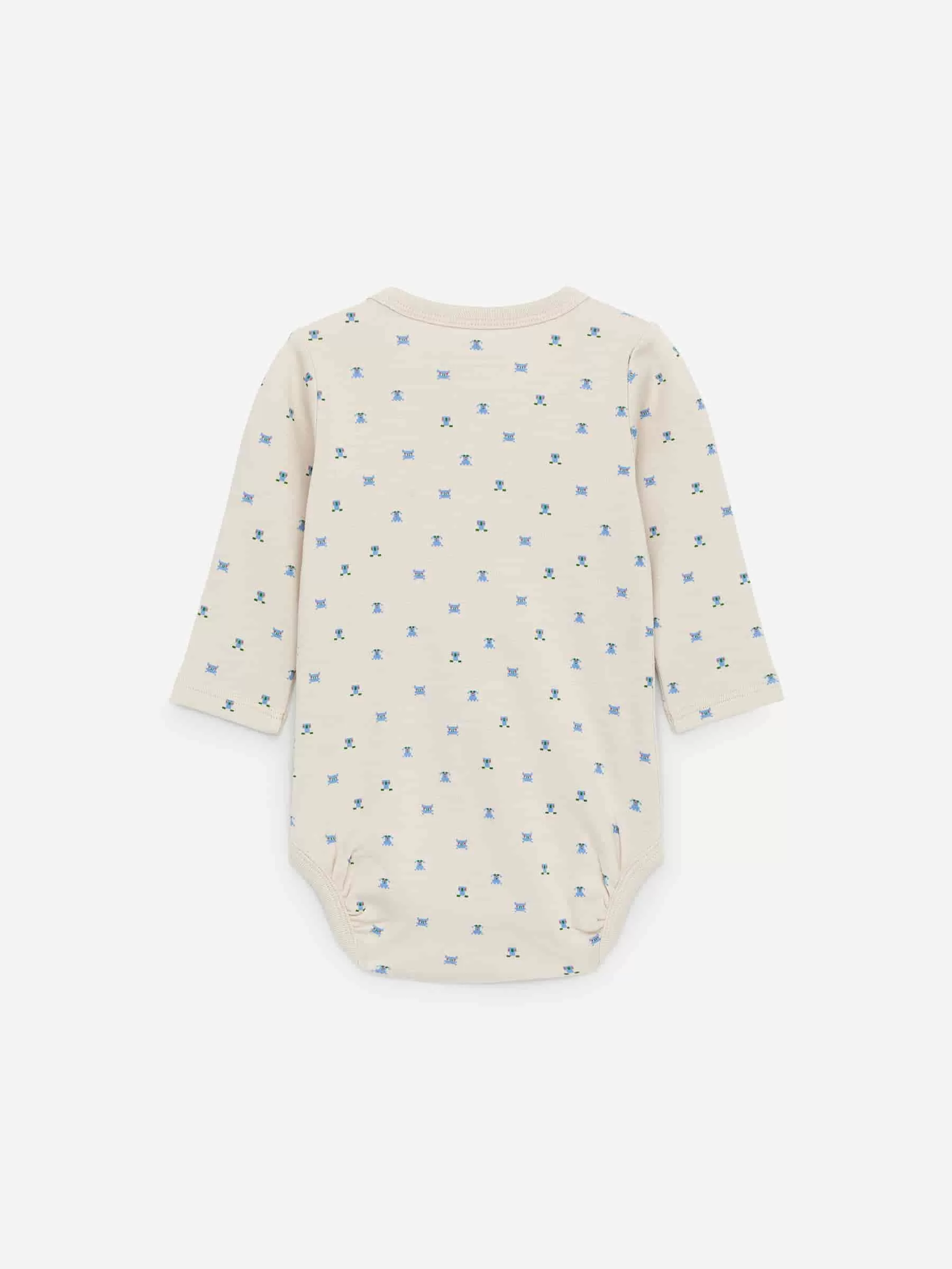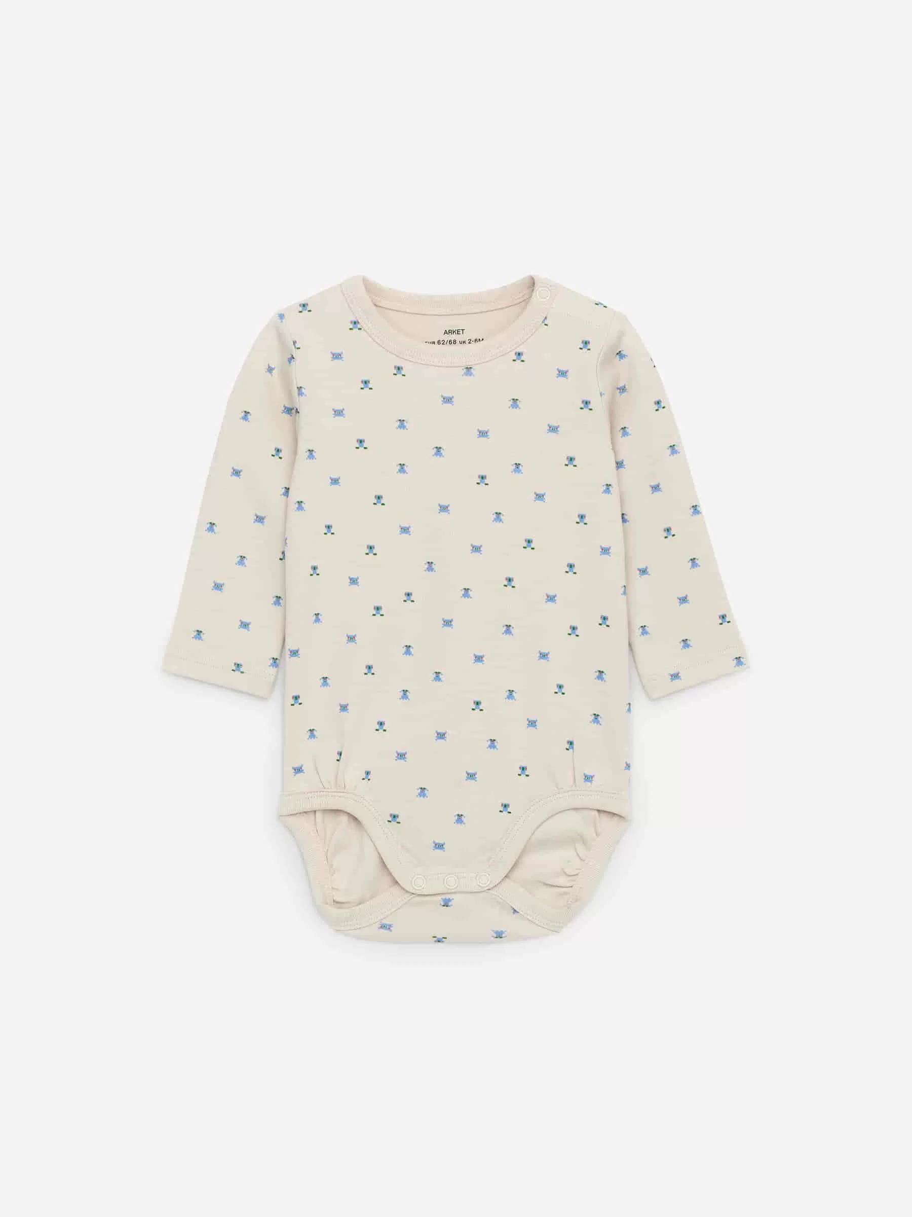 Long-sleeve bodysuit in soft cotton jersey. Snap buttons at shoulder and at crotch enable easy dressing and changing.