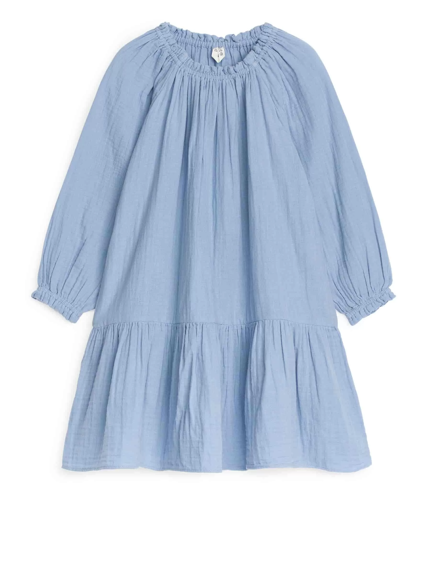Muslin dress with frill details and elastics at neckline and cuffs. Gathers at waist and raglan, 3/4-length sleeves.