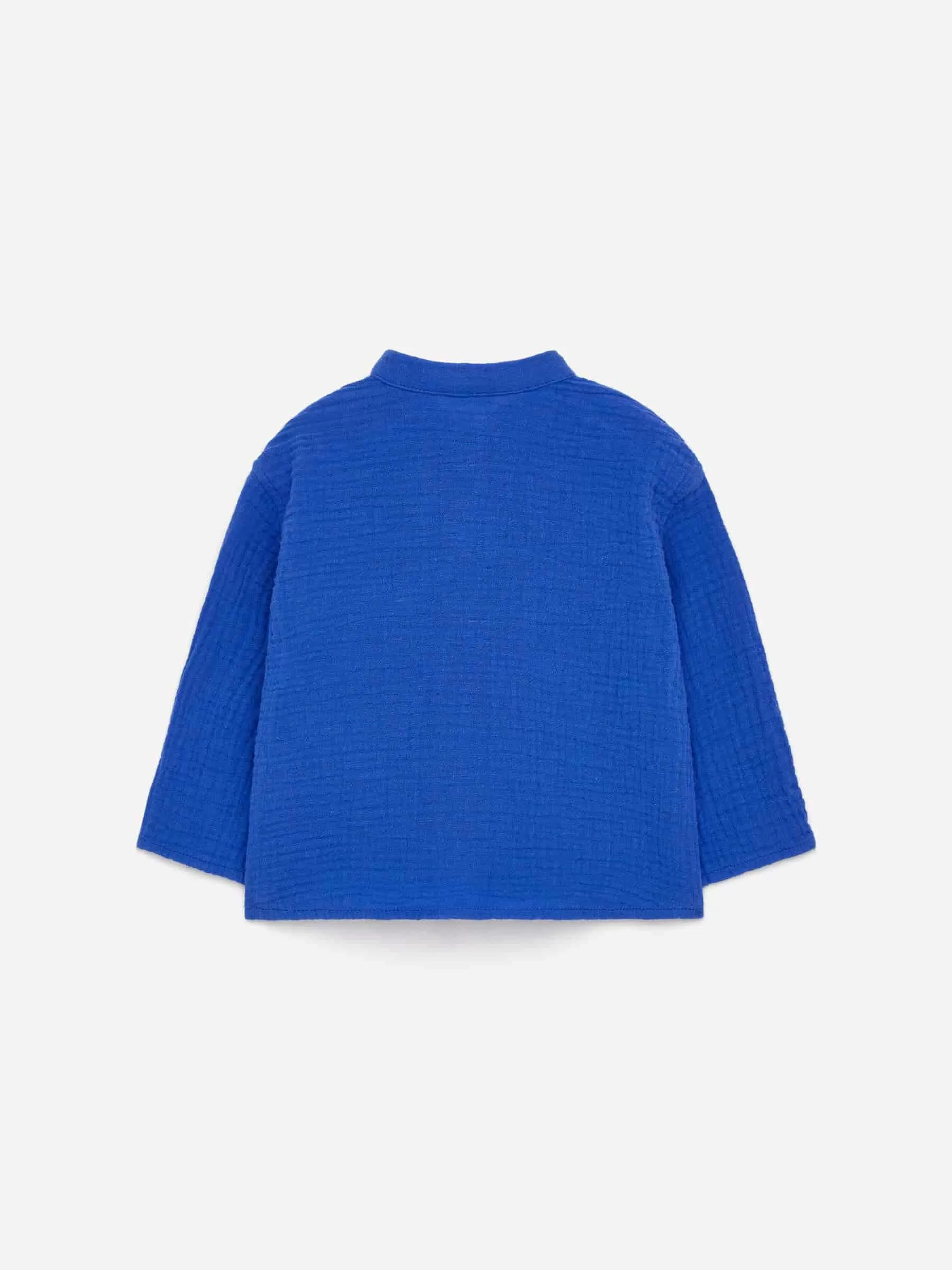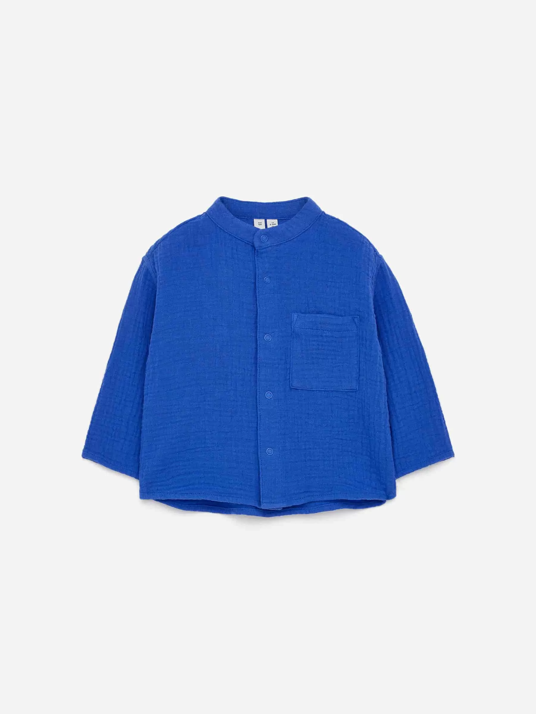 Collarless shirt crafted from cotton muslin, featuring a single chest pocket and a relaxed fit.