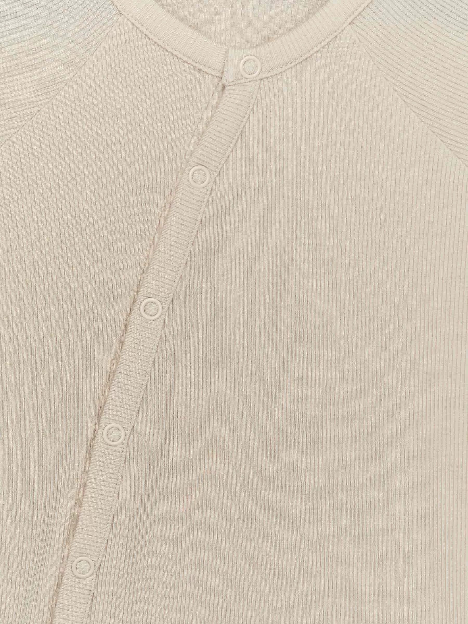 Long-sleeved pyjama for the newborn baby. Sewn from an ultra soft and lightweight ribbed jersey made of lyocell and elastane for stretch. Cuffs are foldable over hands and feet. Snap buttons at front, placed diagonally for easy dressing and changing.