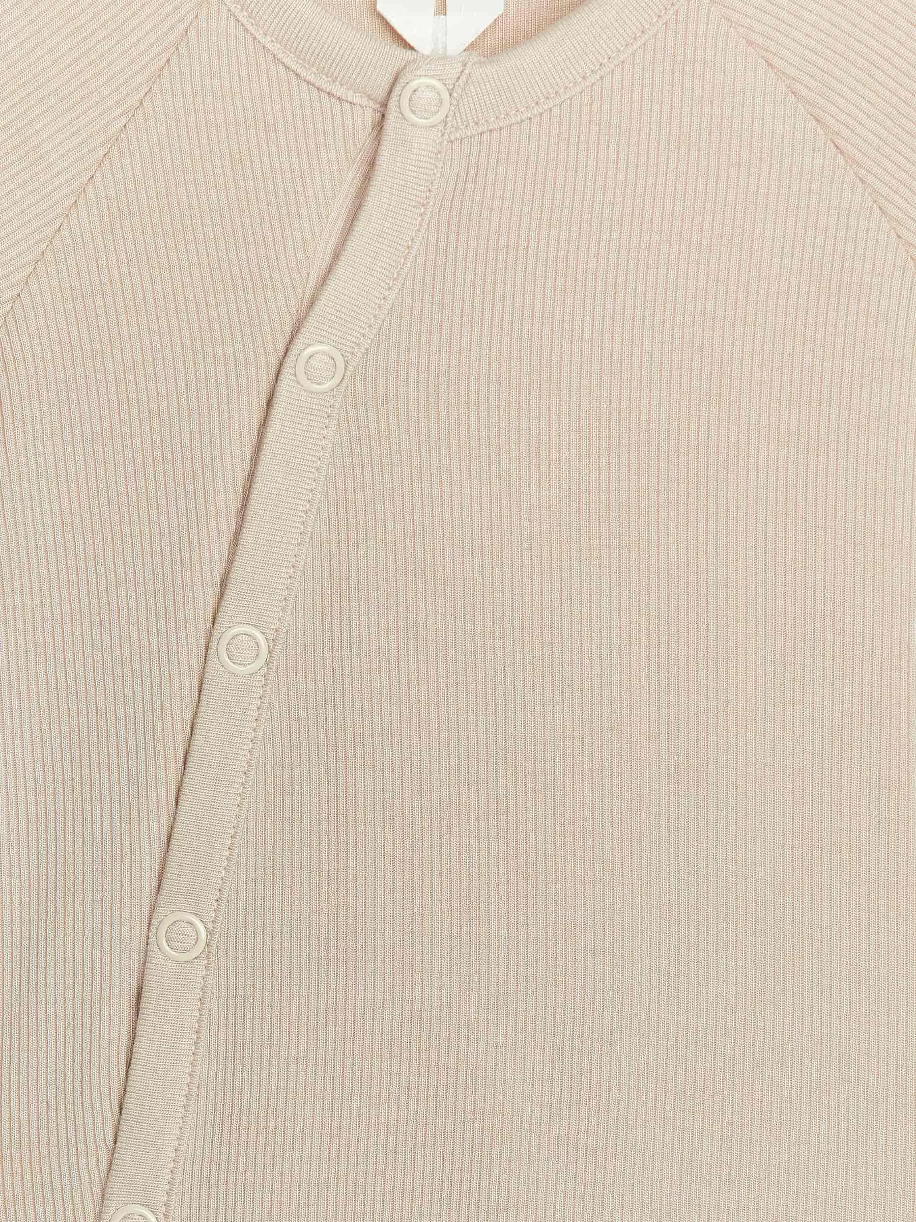 Long-sleeved pyjama for the newborn baby. Sewn from an ultra soft and lightweight ribbed jersey made of lyocell and elastane for stretch. Cuffs are foldable over hands and feet. Snap buttons at front, placed diagonally for easy dressing and changing.