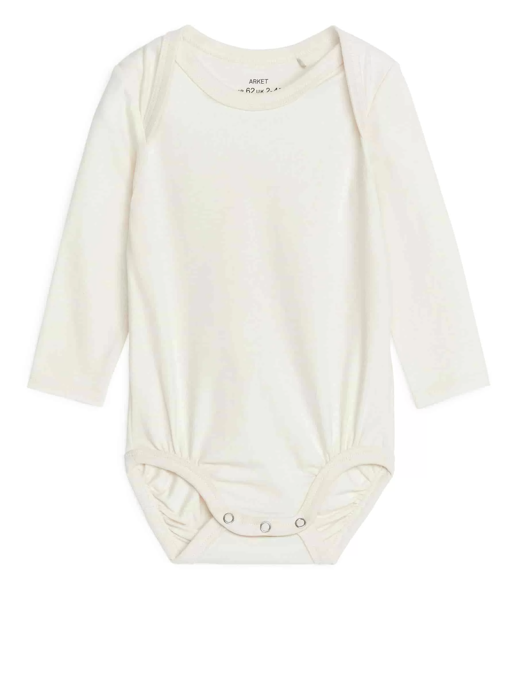 Bodysuit for the newborn baby. Crafted from an ultra soft, stretchy cotton jersey with a brushed surface for a peach-like feel. Styled with an envelope-style neckline and snap buttons in crotch for easy dressing.