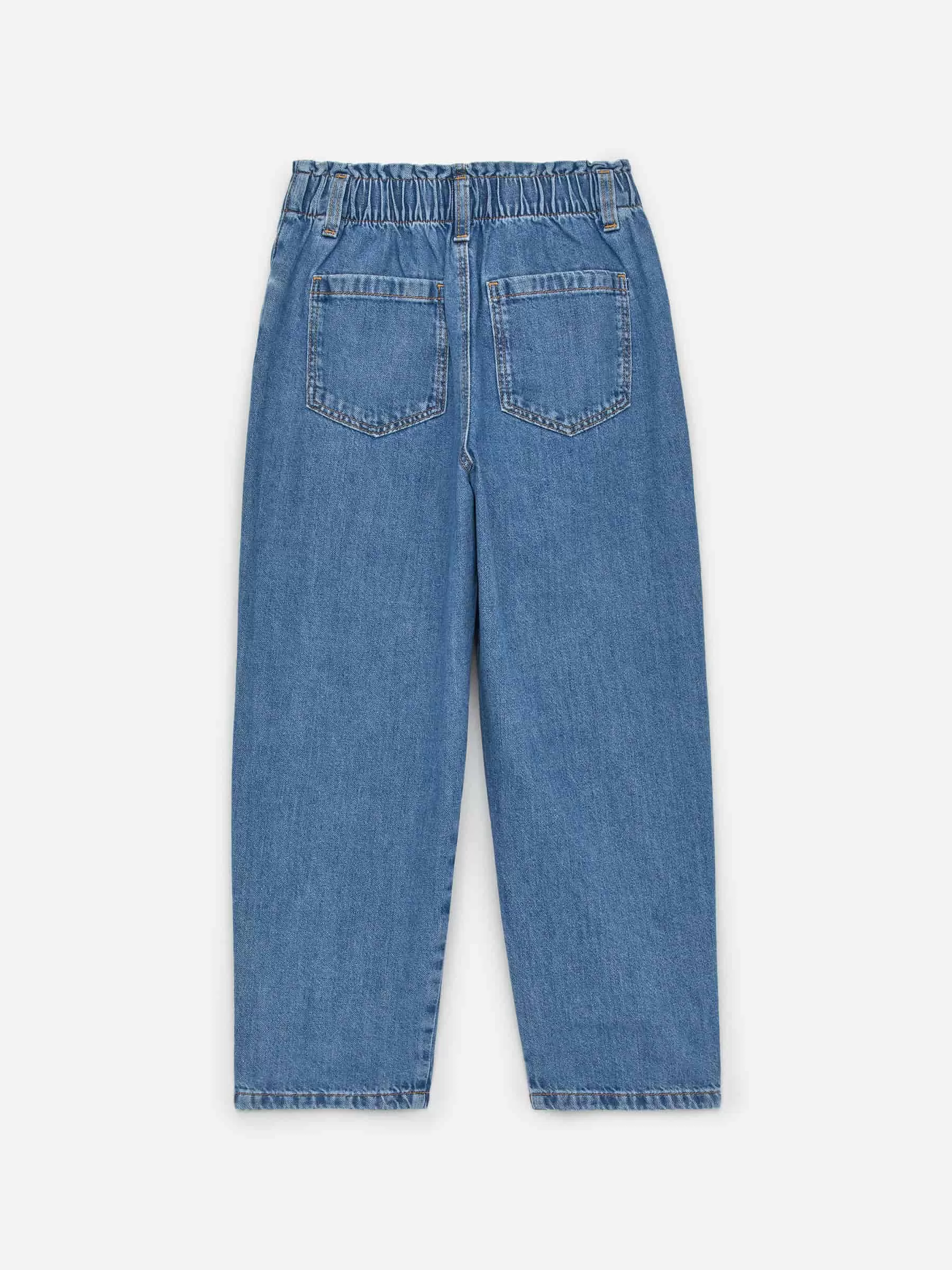 Denim trousers with a paperbag waist with elastics inside the waistband. A classic five-pocket style with a mid-rise waist and slightly tapered legs.