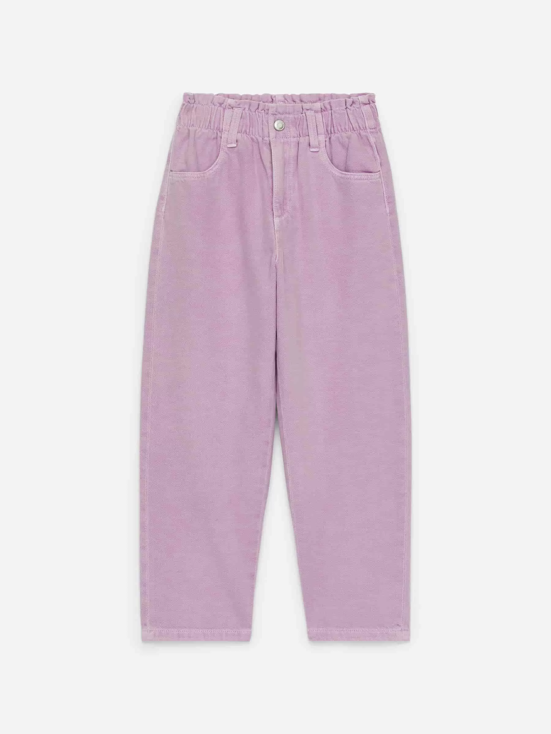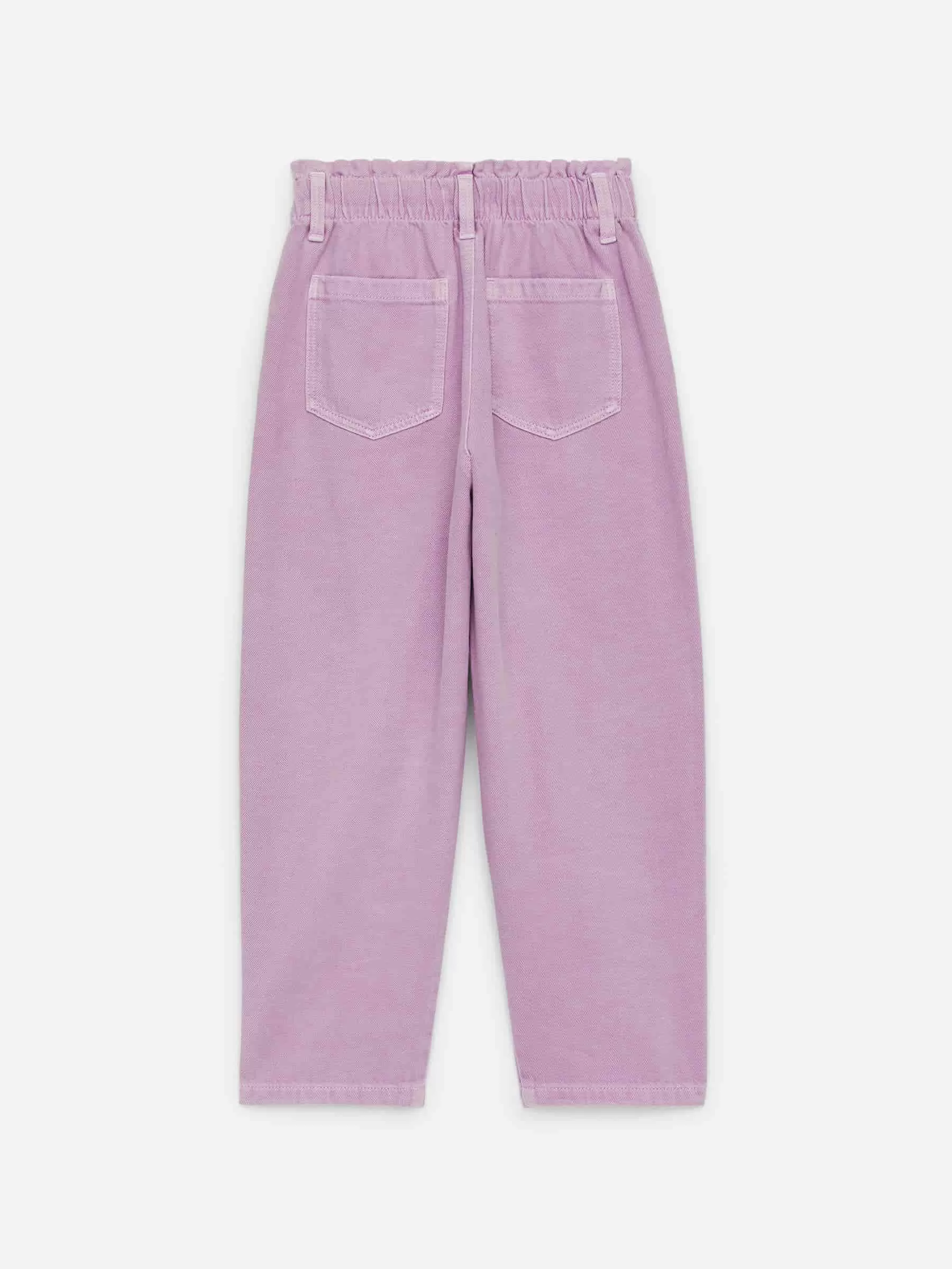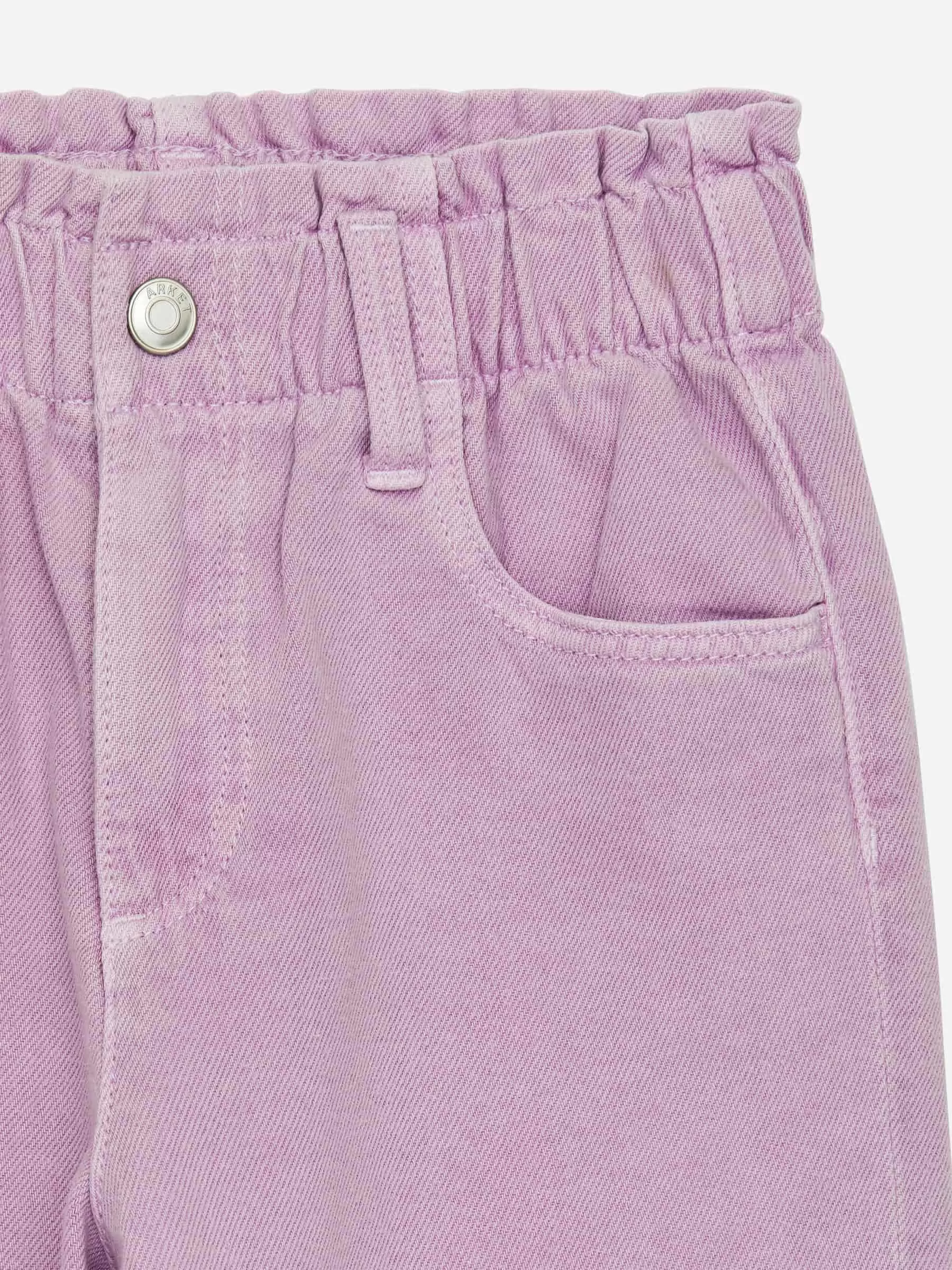 Denim trousers with a paperbag waist with elastics inside the waistband. A classic five-pocket style with a mid-rise waist and slightly tapered legs.