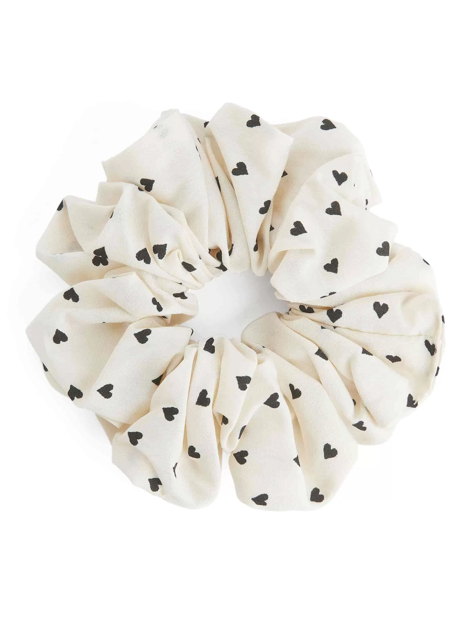 Fluffy, elasticated scrunchie made from a blend of lyocell and cotton. Adorned with an all-over print.