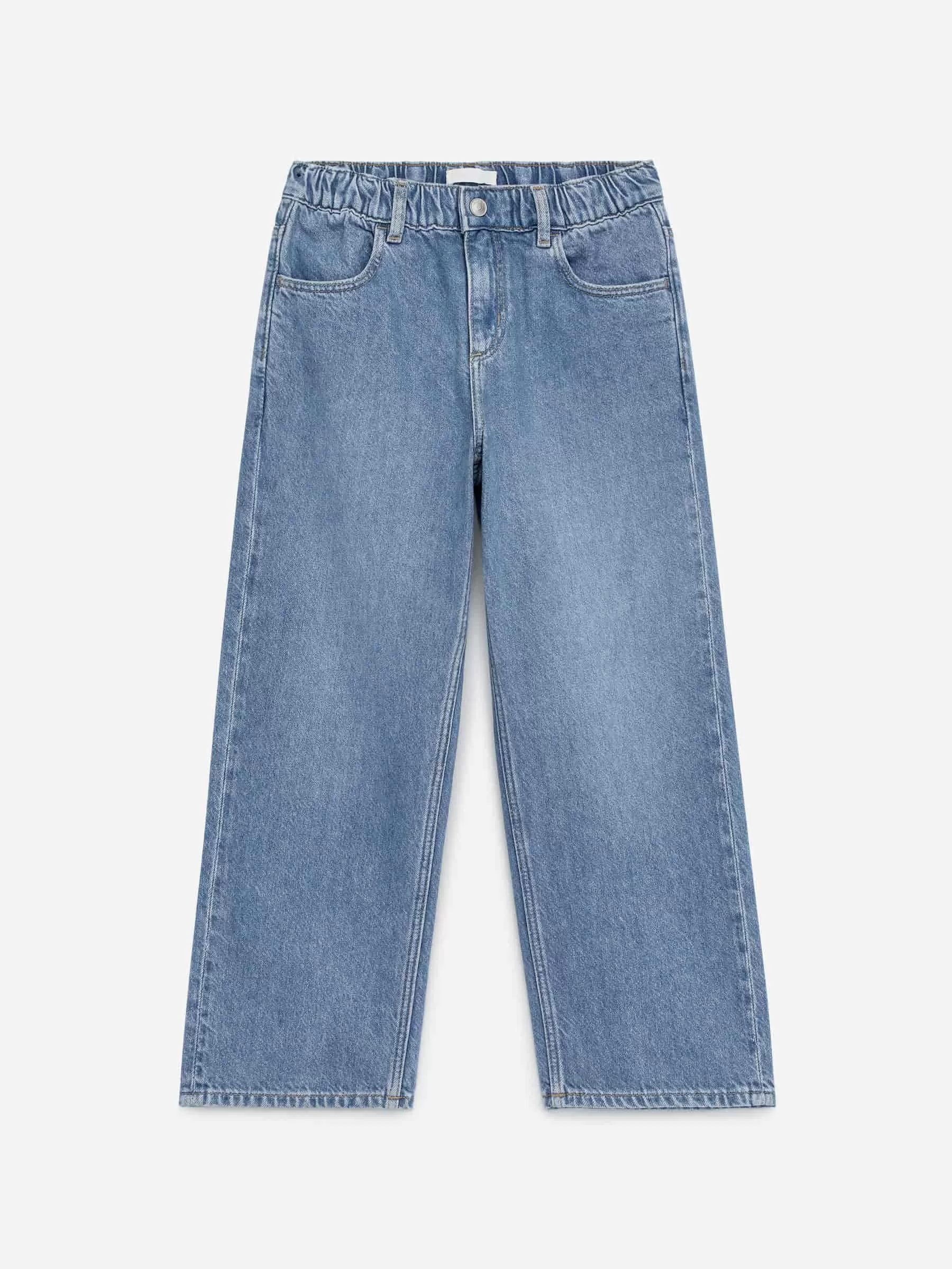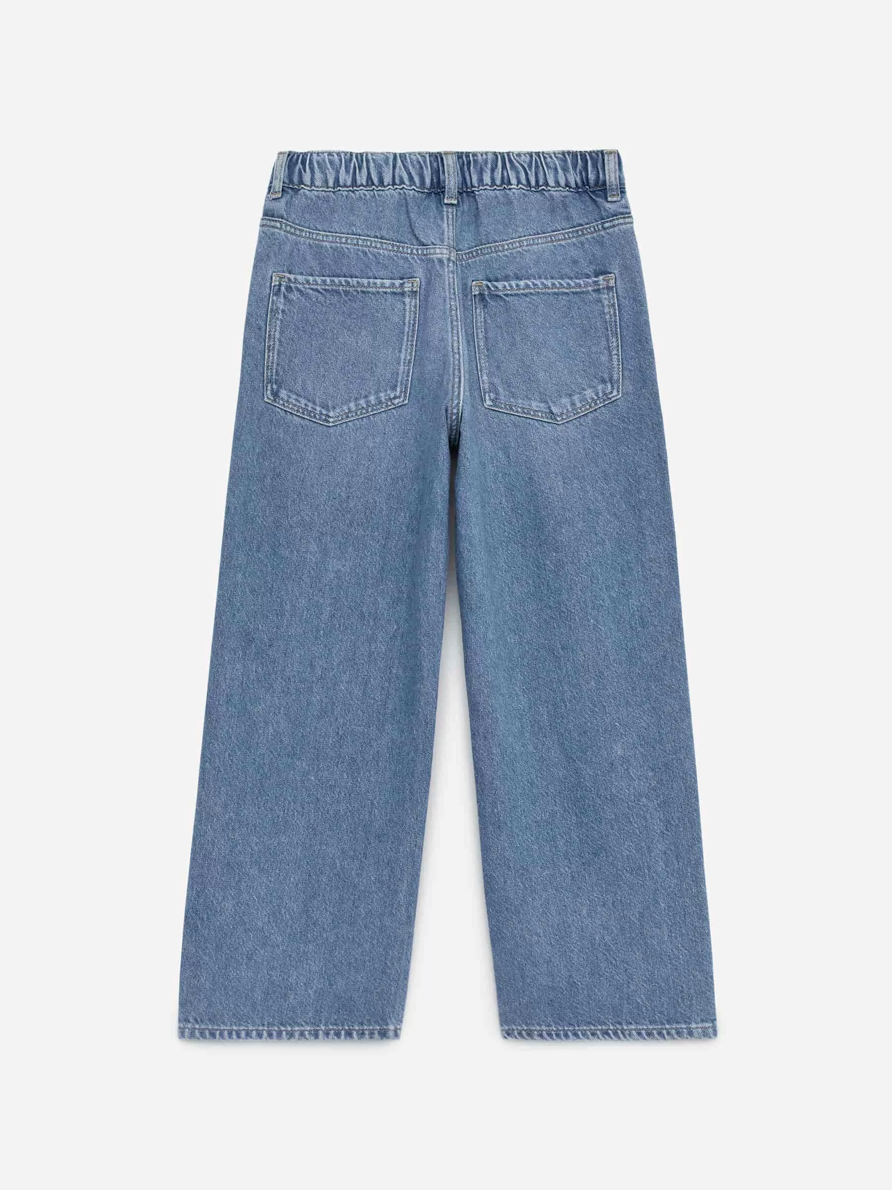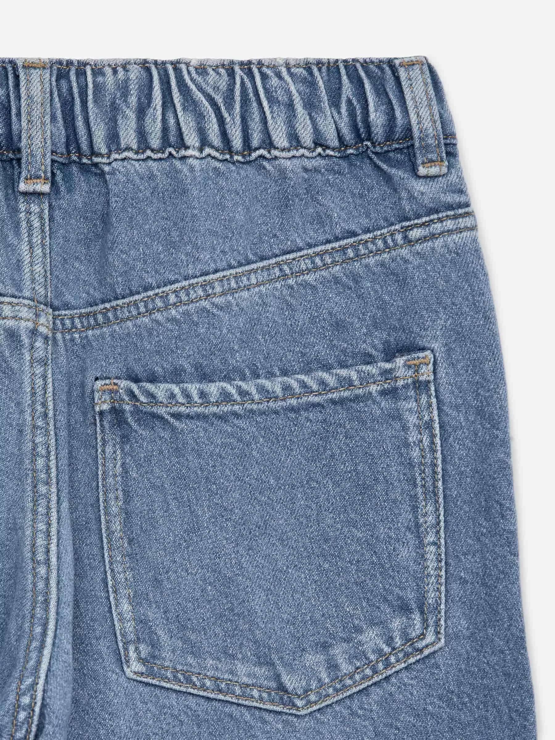 Pull-on denim trousers with adjustable elastics at waist. Detailed with press button closure and metal zipper and front and back pockets. Loose fit.