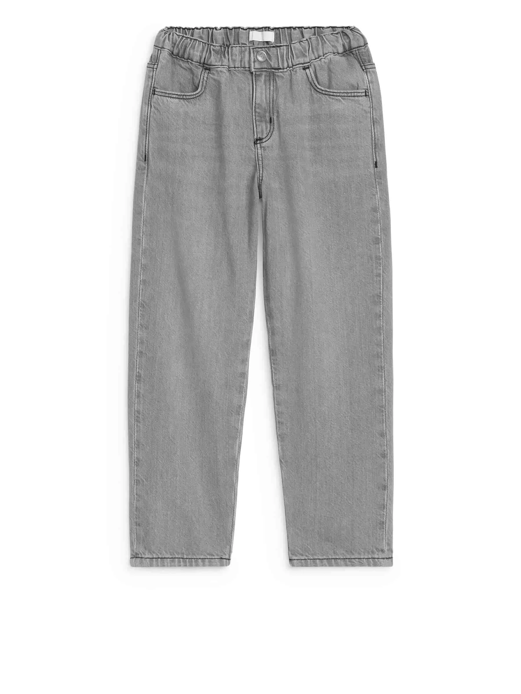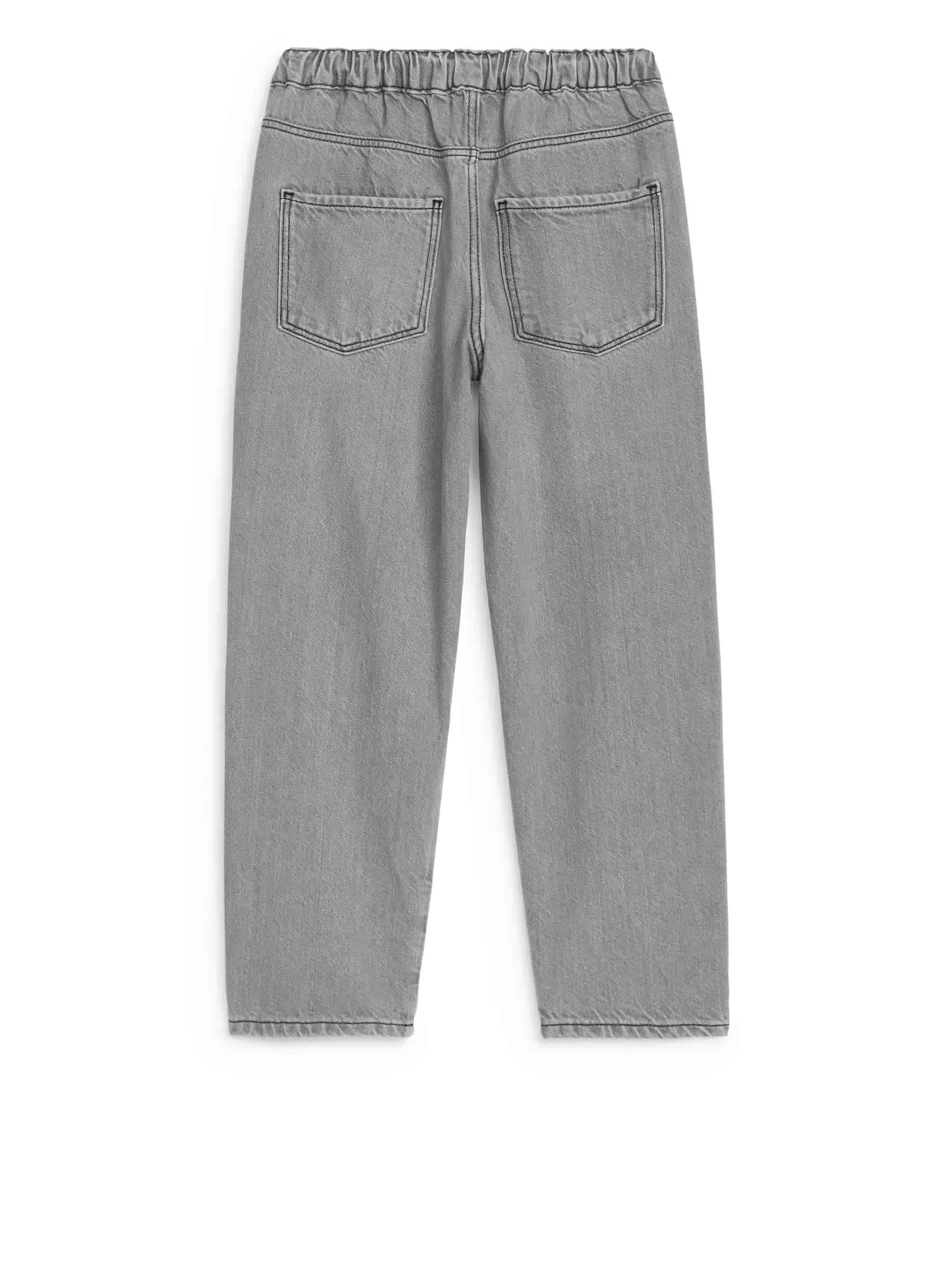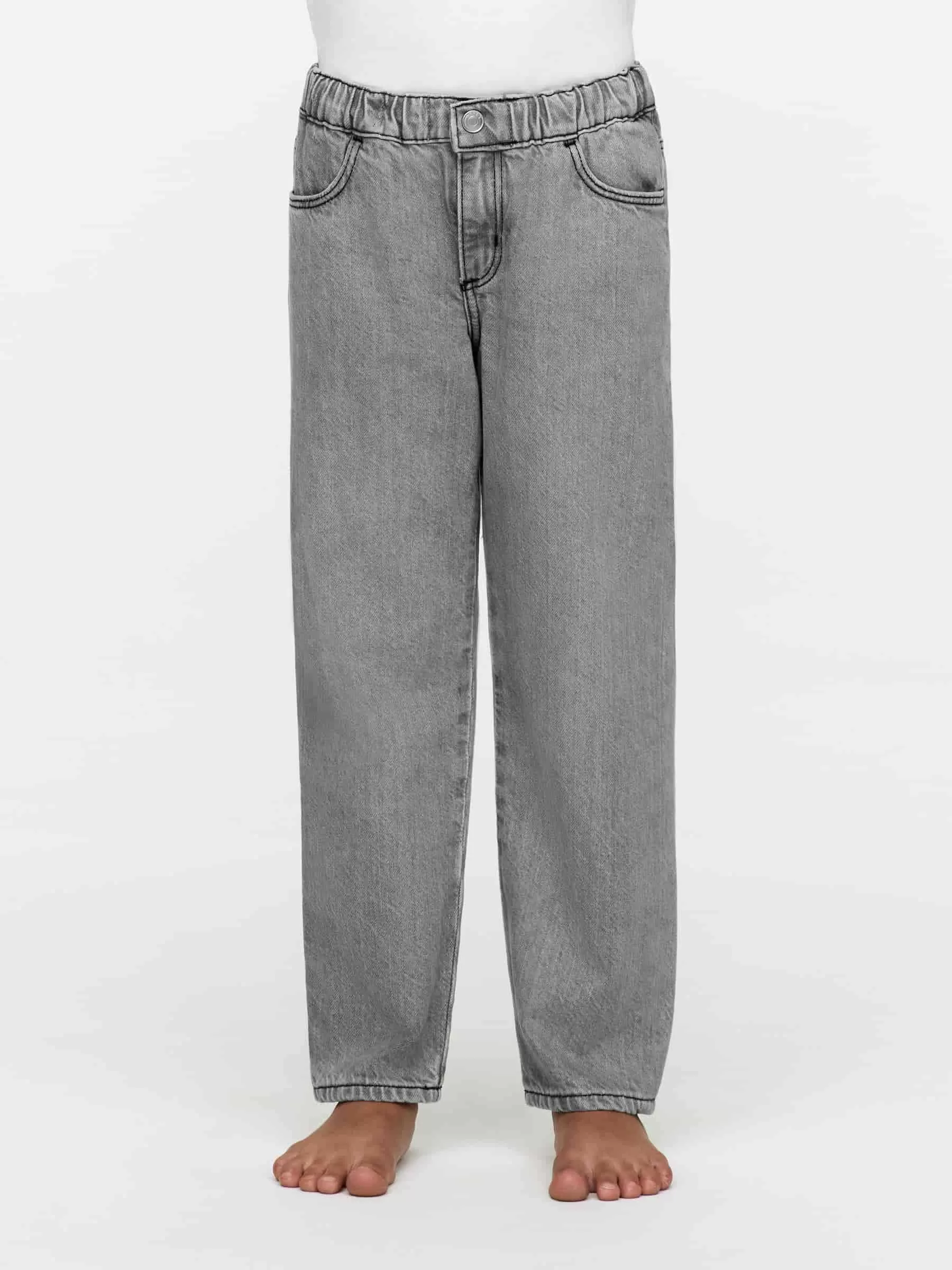 Pull-on cotton denim trousers with elastics and press button at waist. Front and back pockets. Tapered legs.