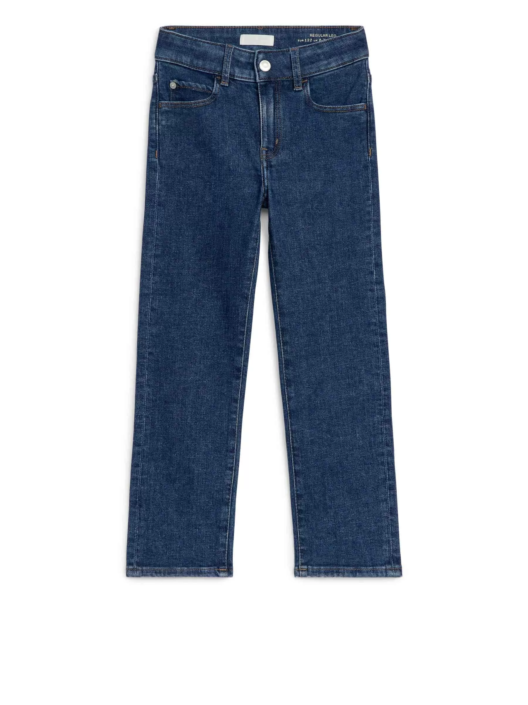 Jeans crafted from a stretchy denim fabric. A classic 5-pocket style featuring regular legs, not too slim and not too wide. Detailed with adjustable elastics on the inside of waistband. Snap button closure and zip fly. Silver-toned metal hardware.