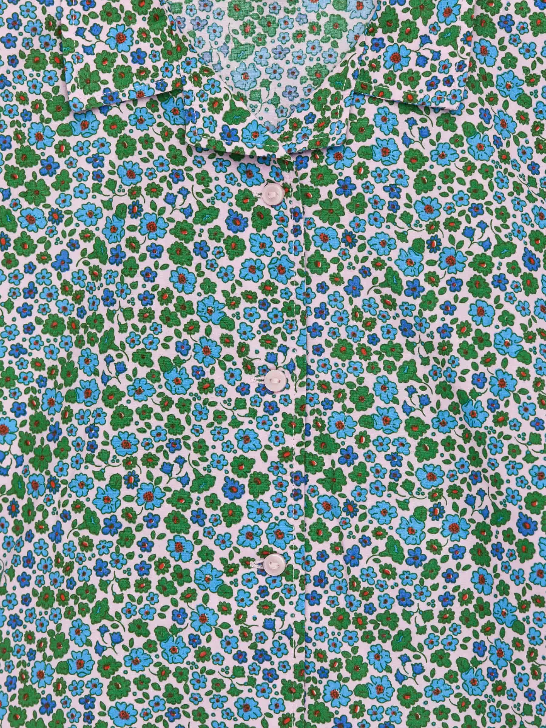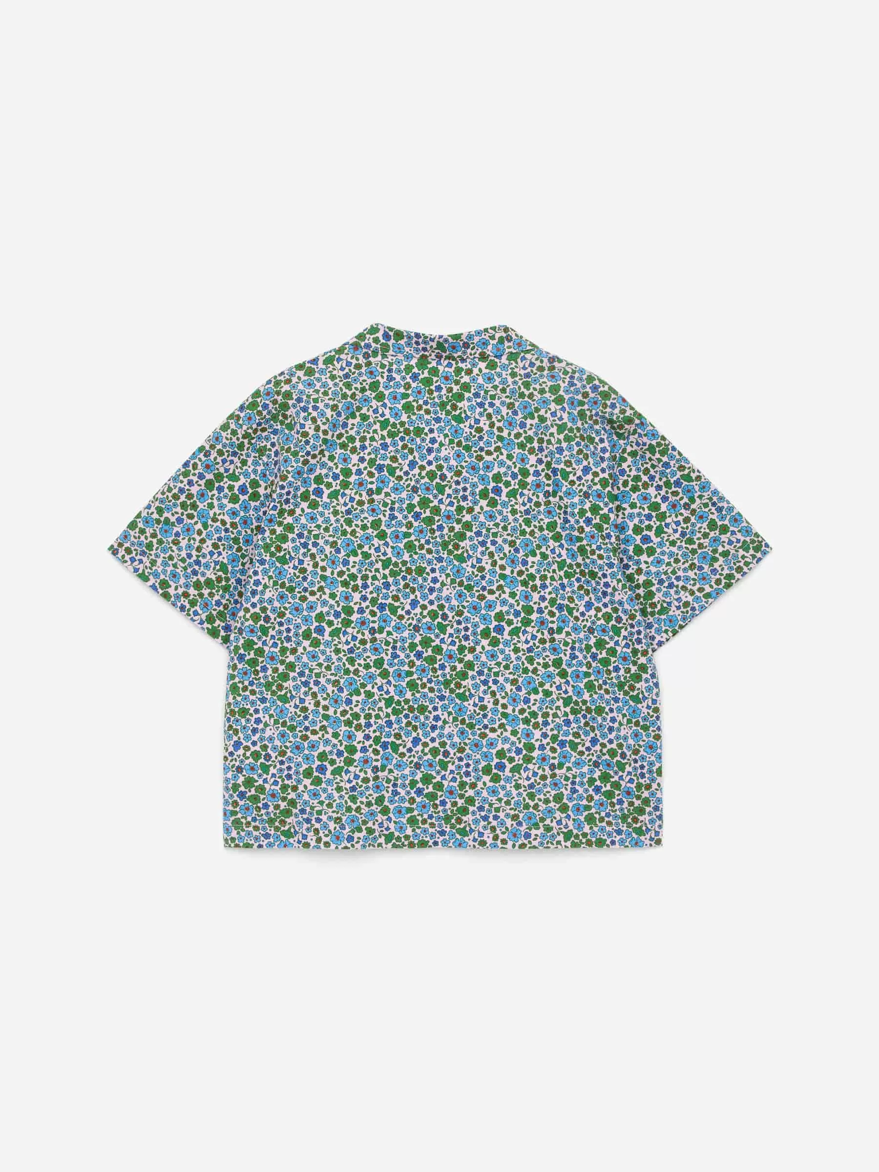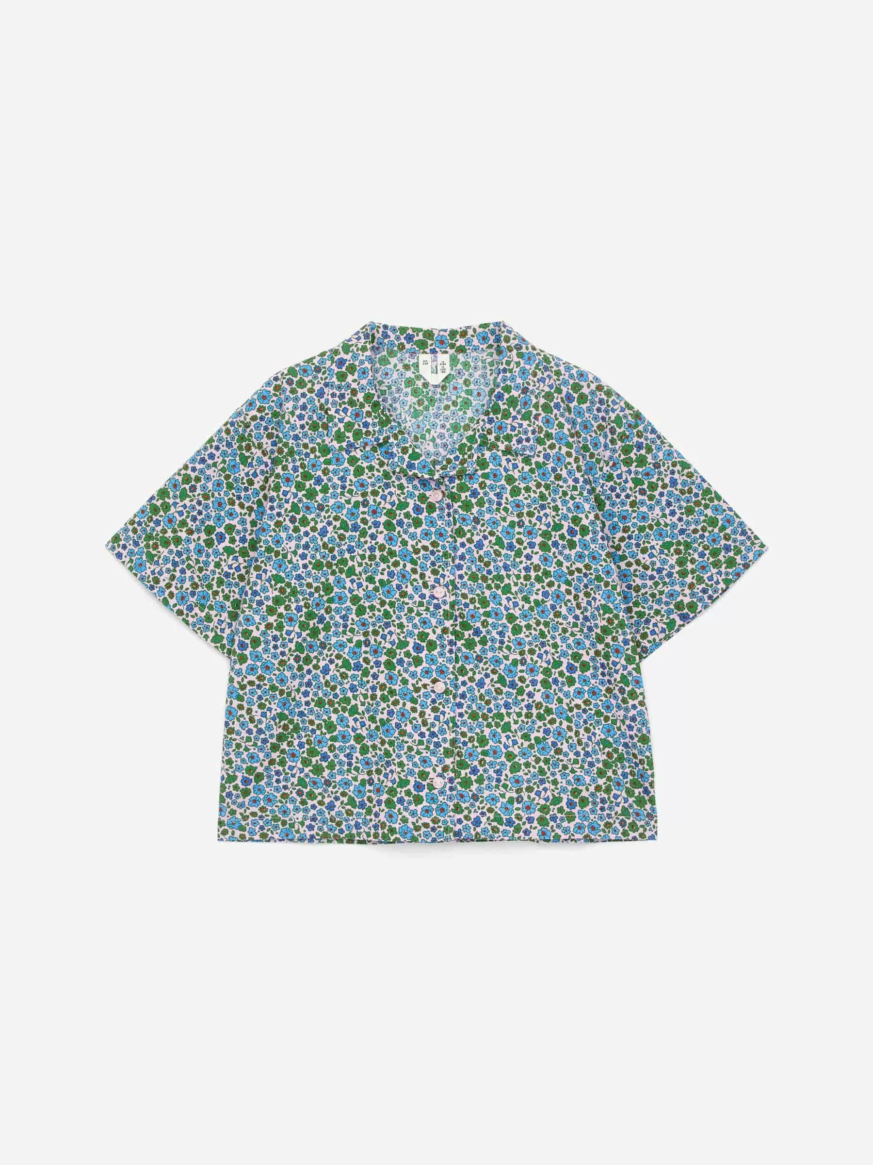 Short-sleeved shirt with a resort collar and dropped shoulders. Oversized fit.