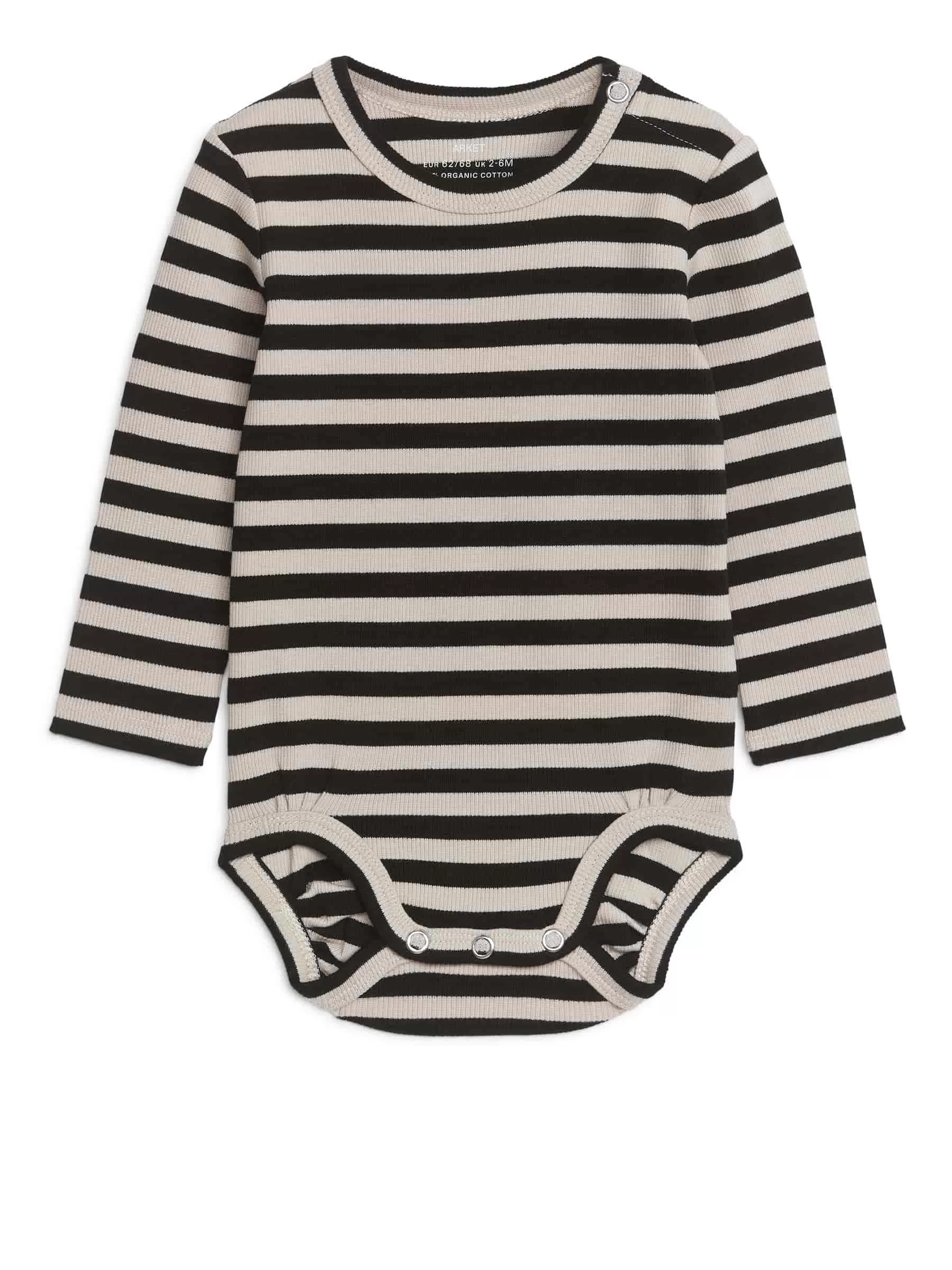 Long-sleeve bodysuit in soft cotton jersey with a naturally stretchy ribbed construction. Snap buttons at shoulder and at crotch enable easy dressing and changing.