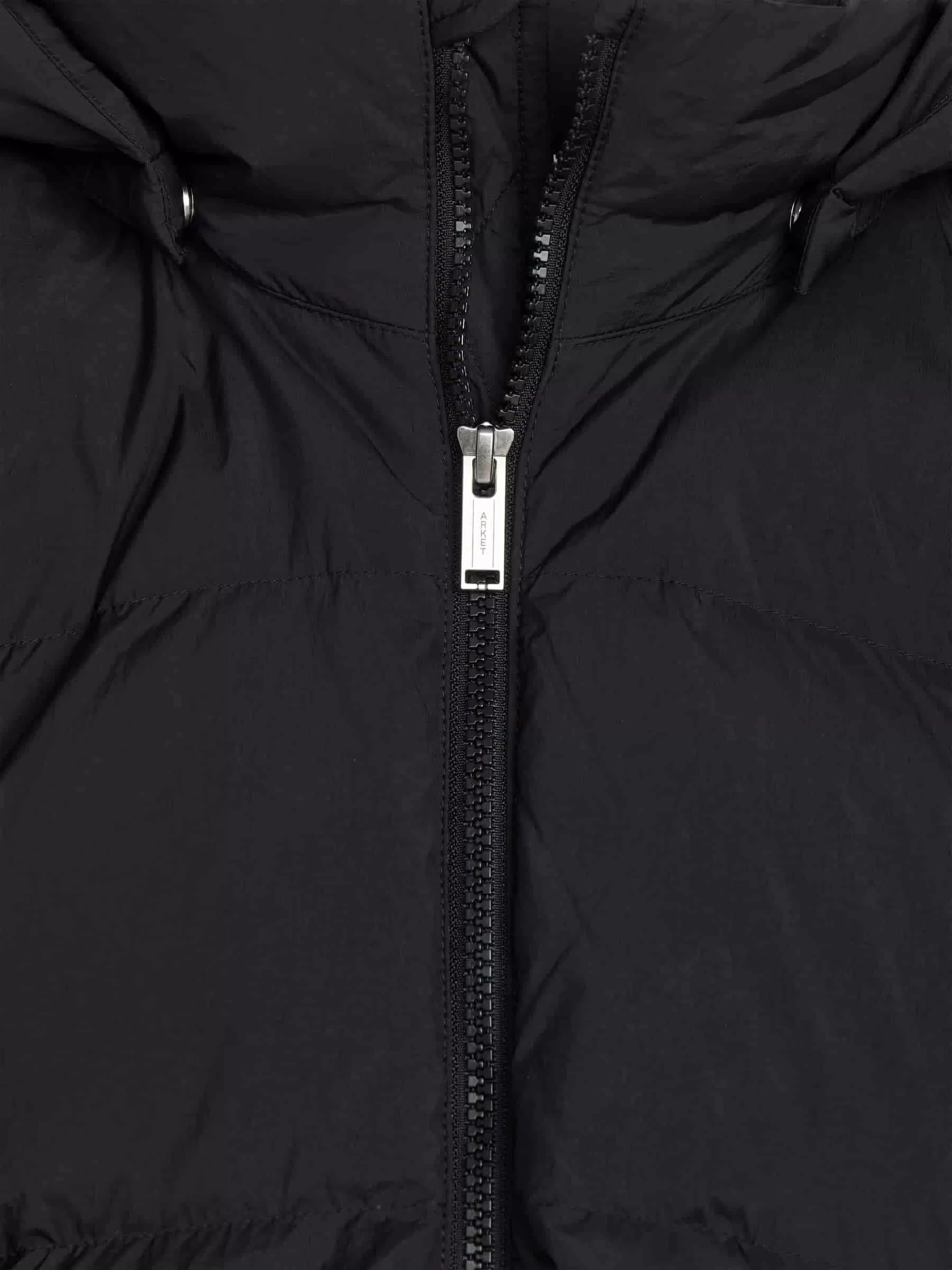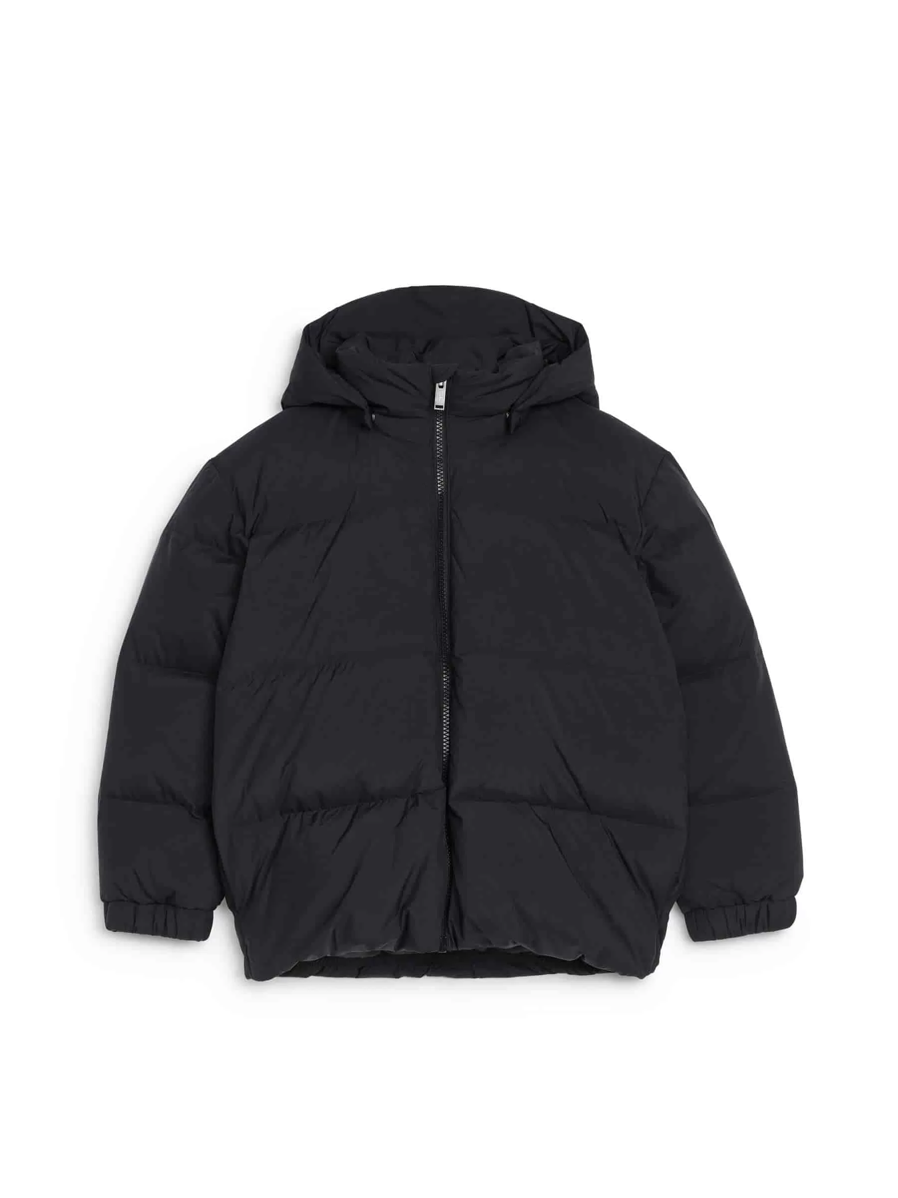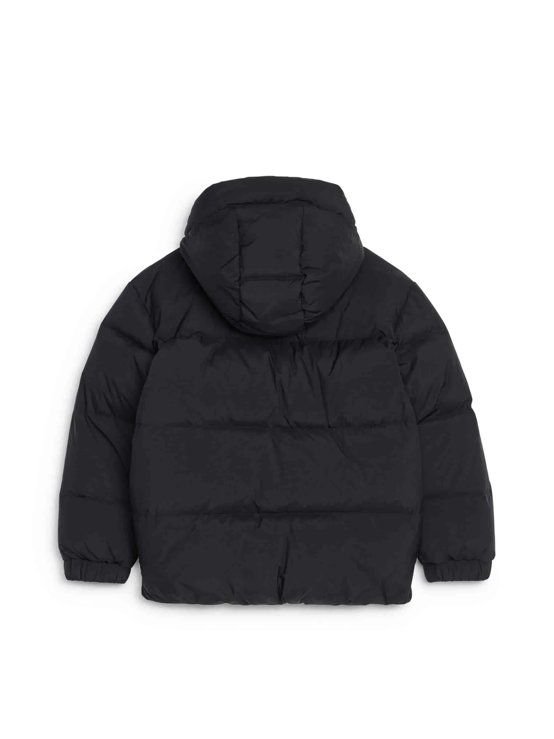 Puffer jacket with detachable hood with down and feather padding. Styled with elastics at end of sleeves and at bottom hem. Pockets in side seams. The Upcycled Down products are filled with recycled down and feathers sourced from Re:Down®. These materials, collected from used textiles, are washed and sterilised at high temperatures without the use of chemicals.