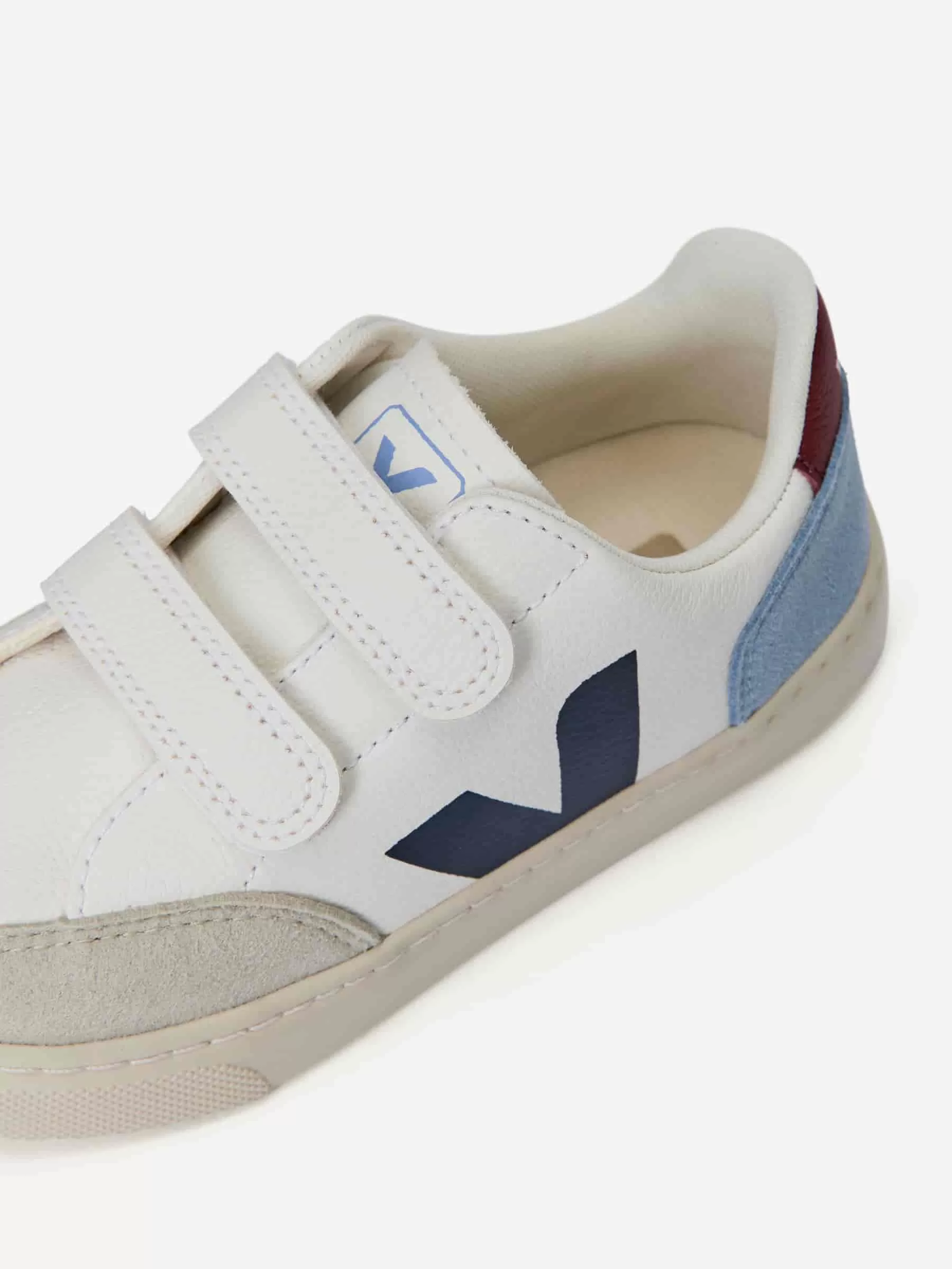 Veja V-12 trainers for children are made from ethically sourced and fairly traded leather and wild rubber. This iteration is inspired by the iconic adult style and features a reinforced sole, a built-up toe and two hook-and-loop fasteners for easy slip-on comfort. Available in other sizes.