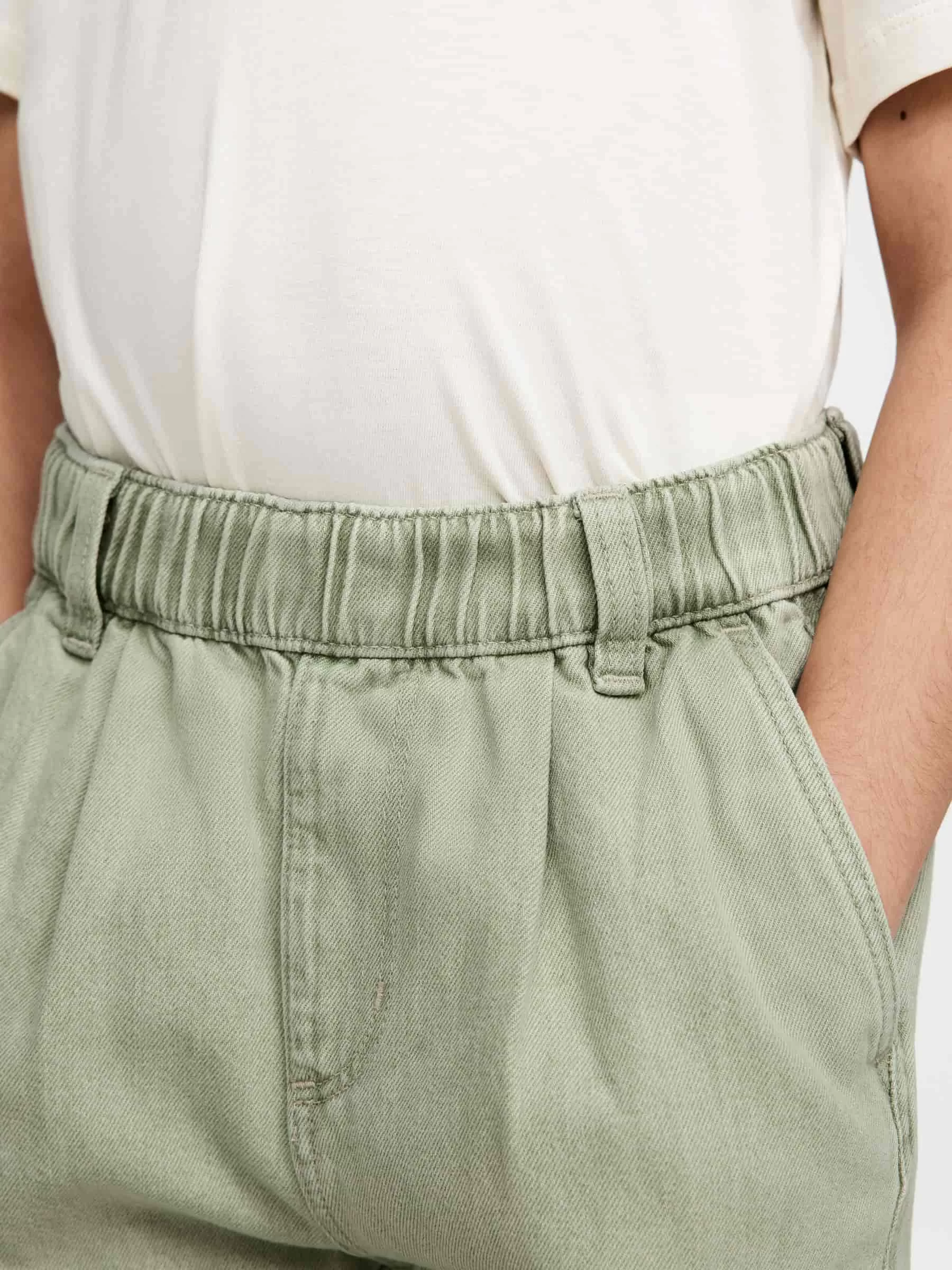 Trousers crafted from a slightly heavier denim quality with a washed finish. Elastics at waist and fake fly. Slanted side pockets and patch pockets at back. Part of set.