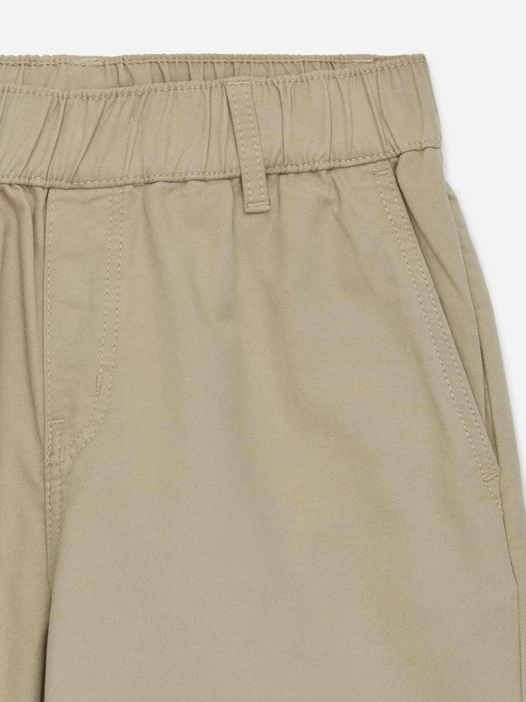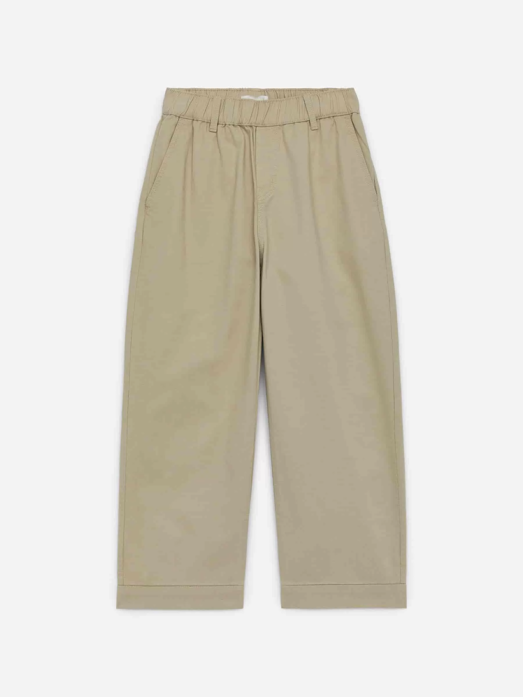Chinos with a wide fit and elastics at waist. Slanted side pockets and a single welt pocket at back. Fake fly.