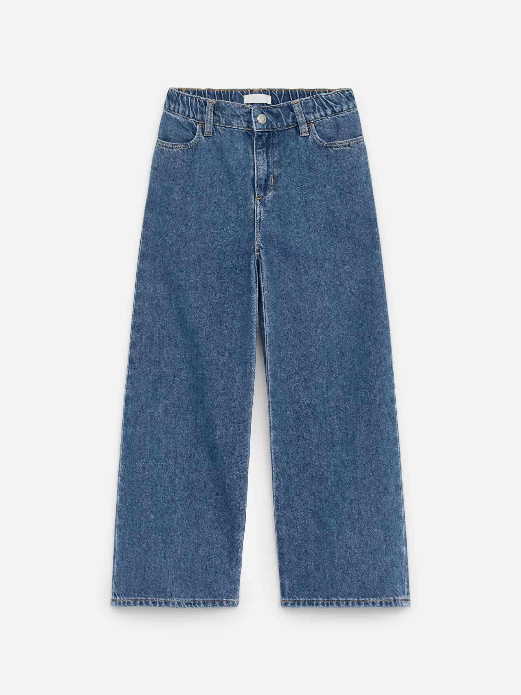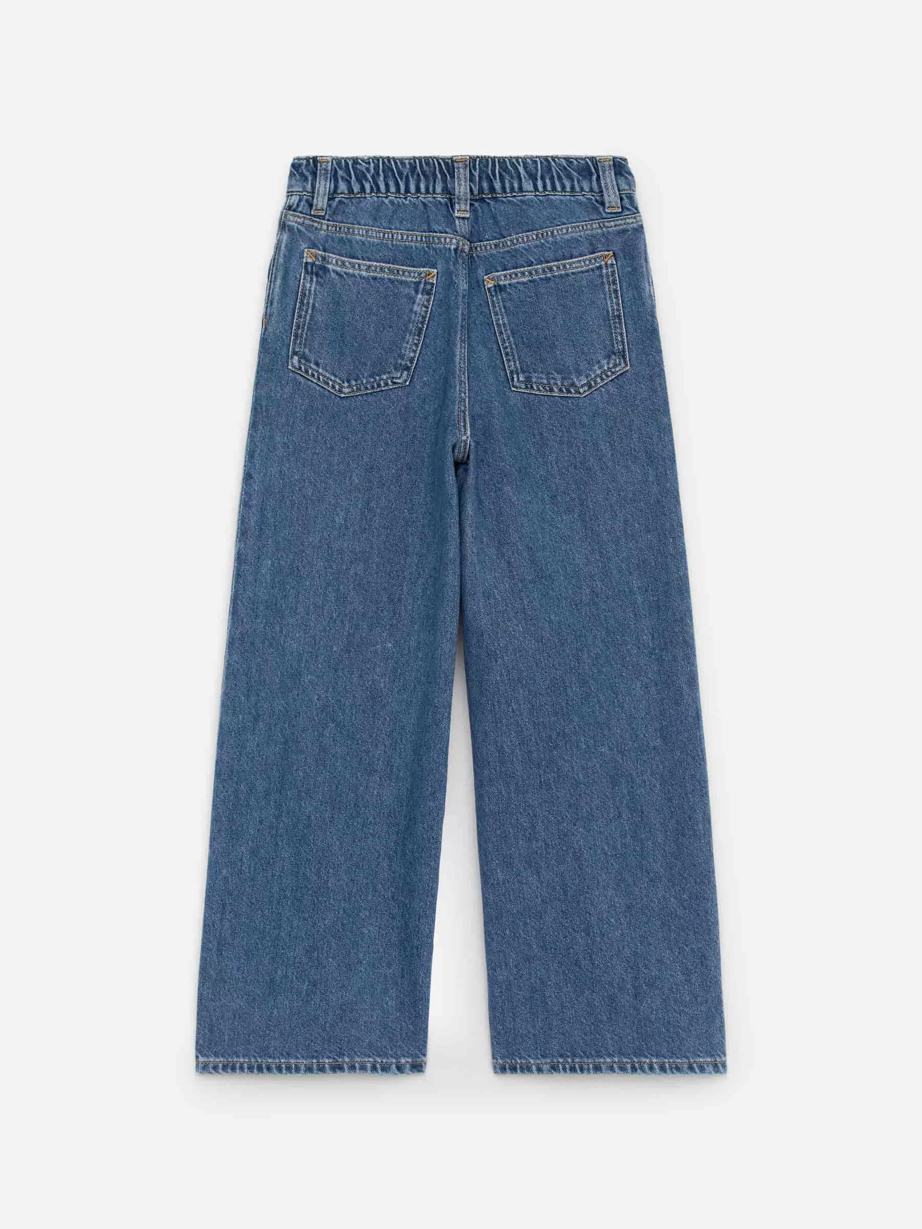 Wide jeans in a washed cotton fabric. Adjustable elastics at waist. Pockets at front and back and belt loops.