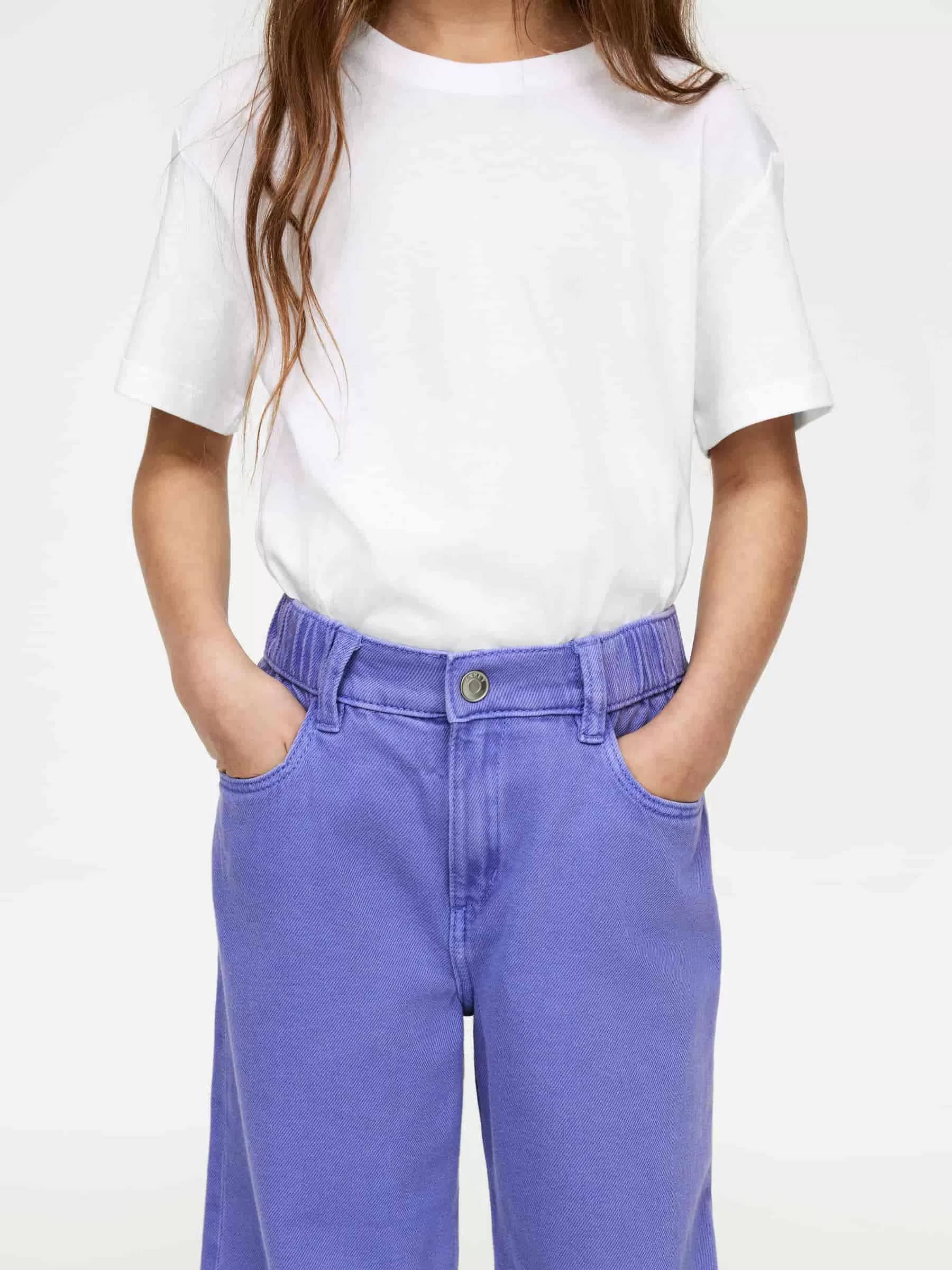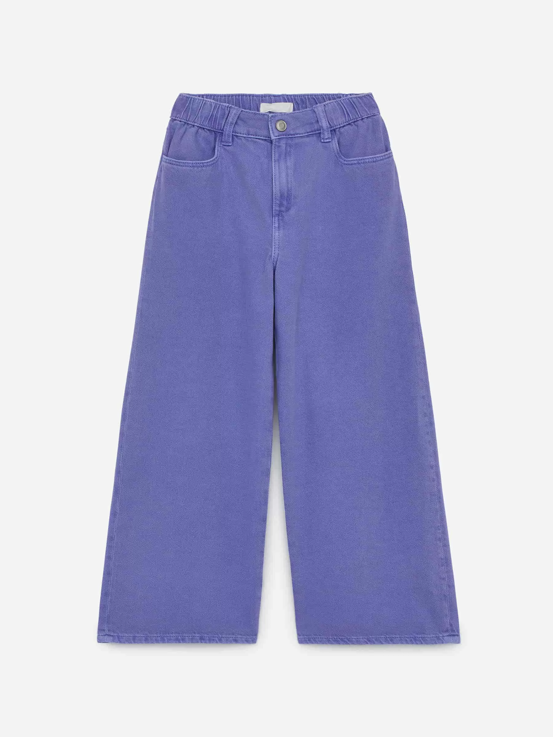 Wide jeans in a washed cotton fabric. Adjustable elastics at waist. Pockets at front and back and belt loops.