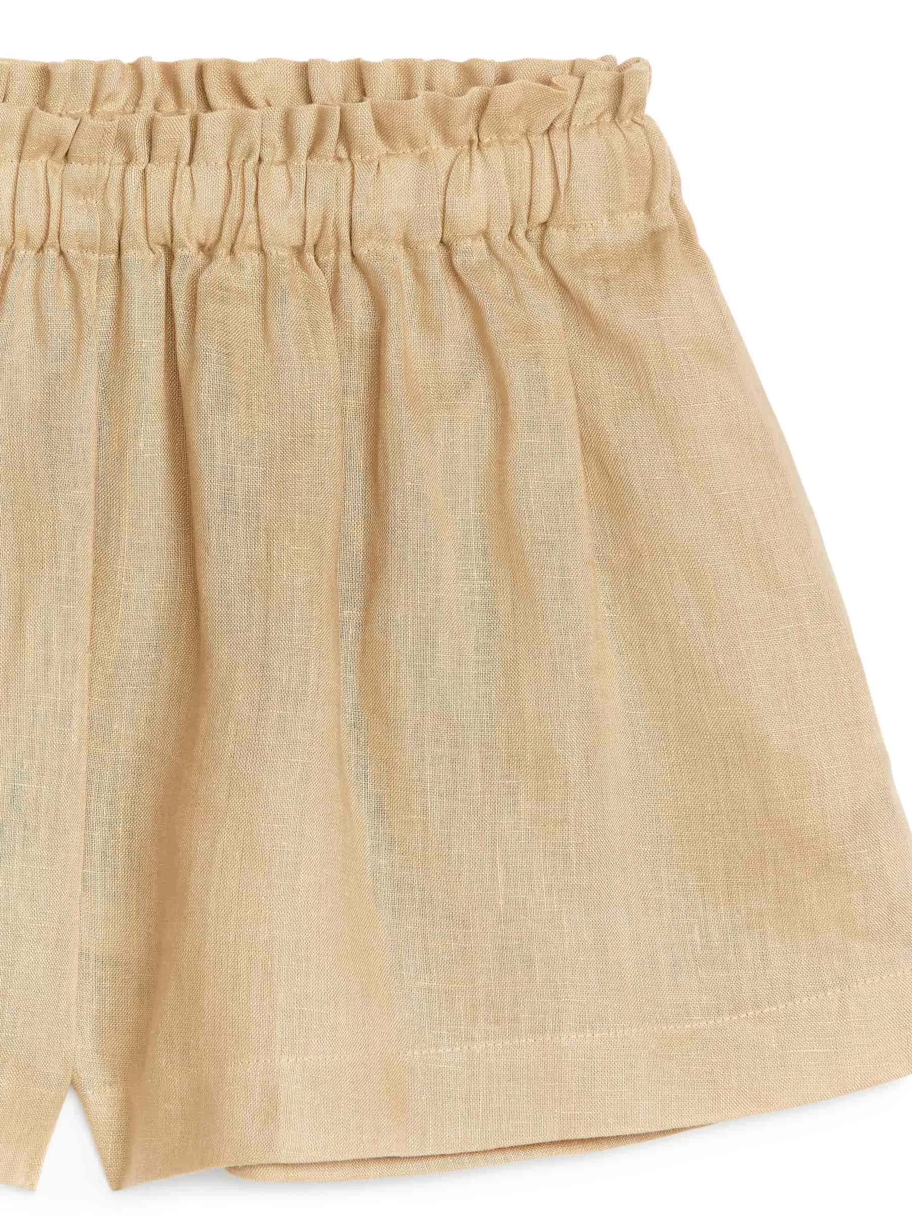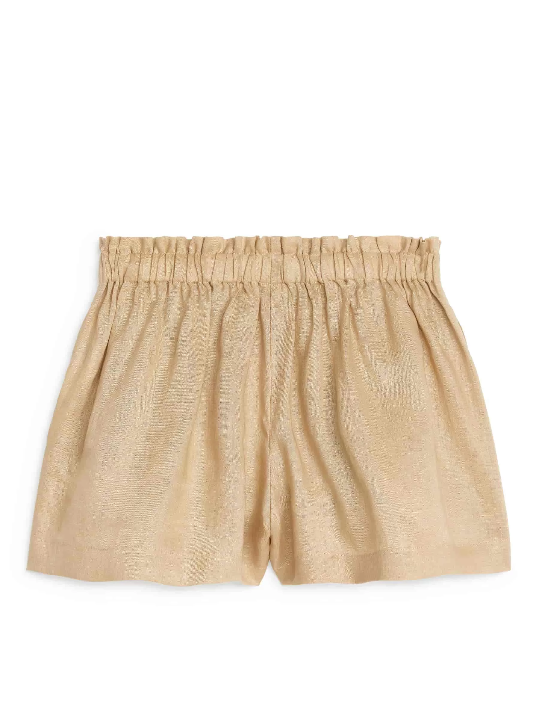 Wide linen shorts with a paperbag waist and pockets in side seams.