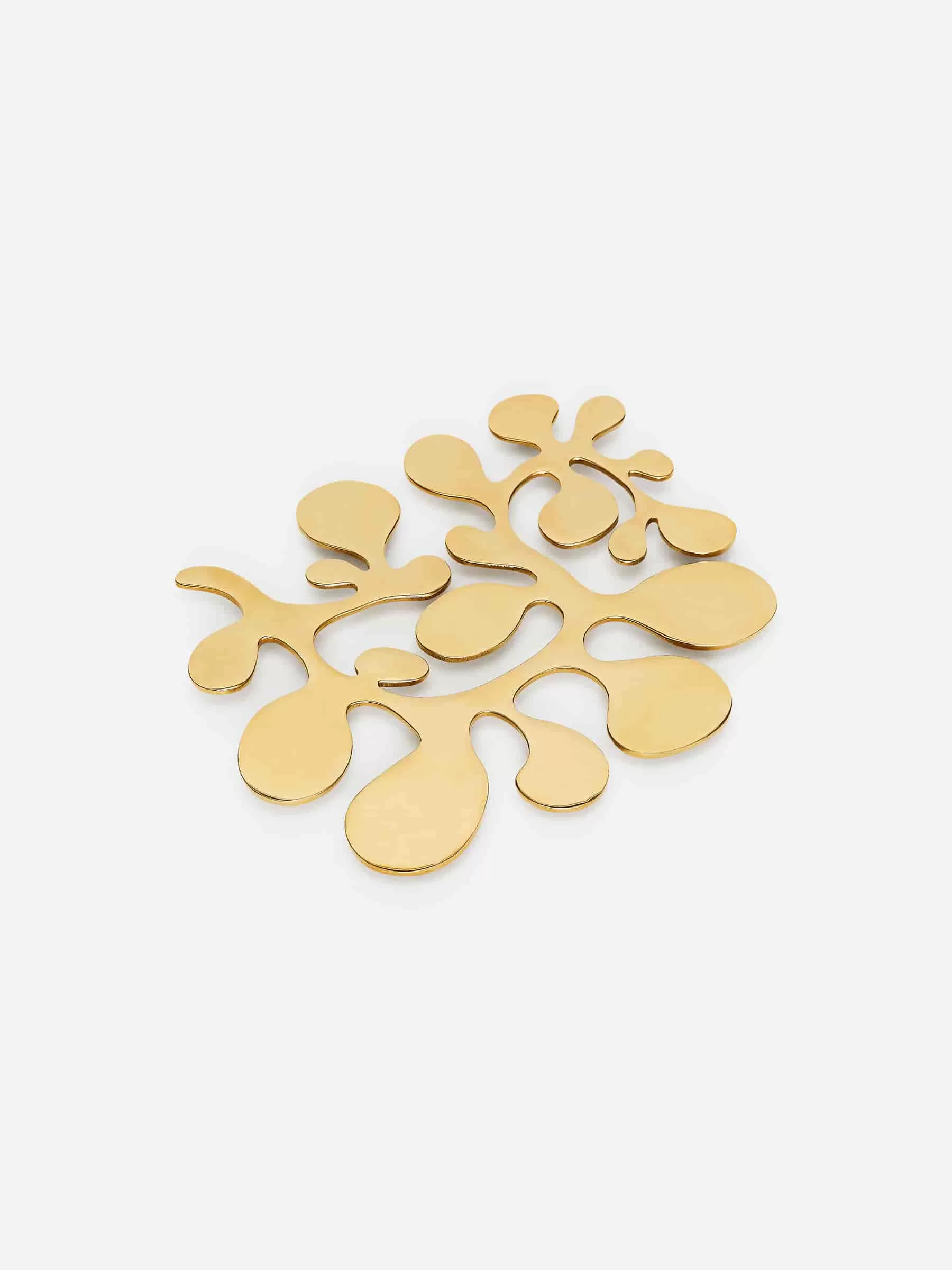 Trivet for pots and pans made of brass. Length 20.3 cm. Width 16.7 cm. Height 0.6 cm.