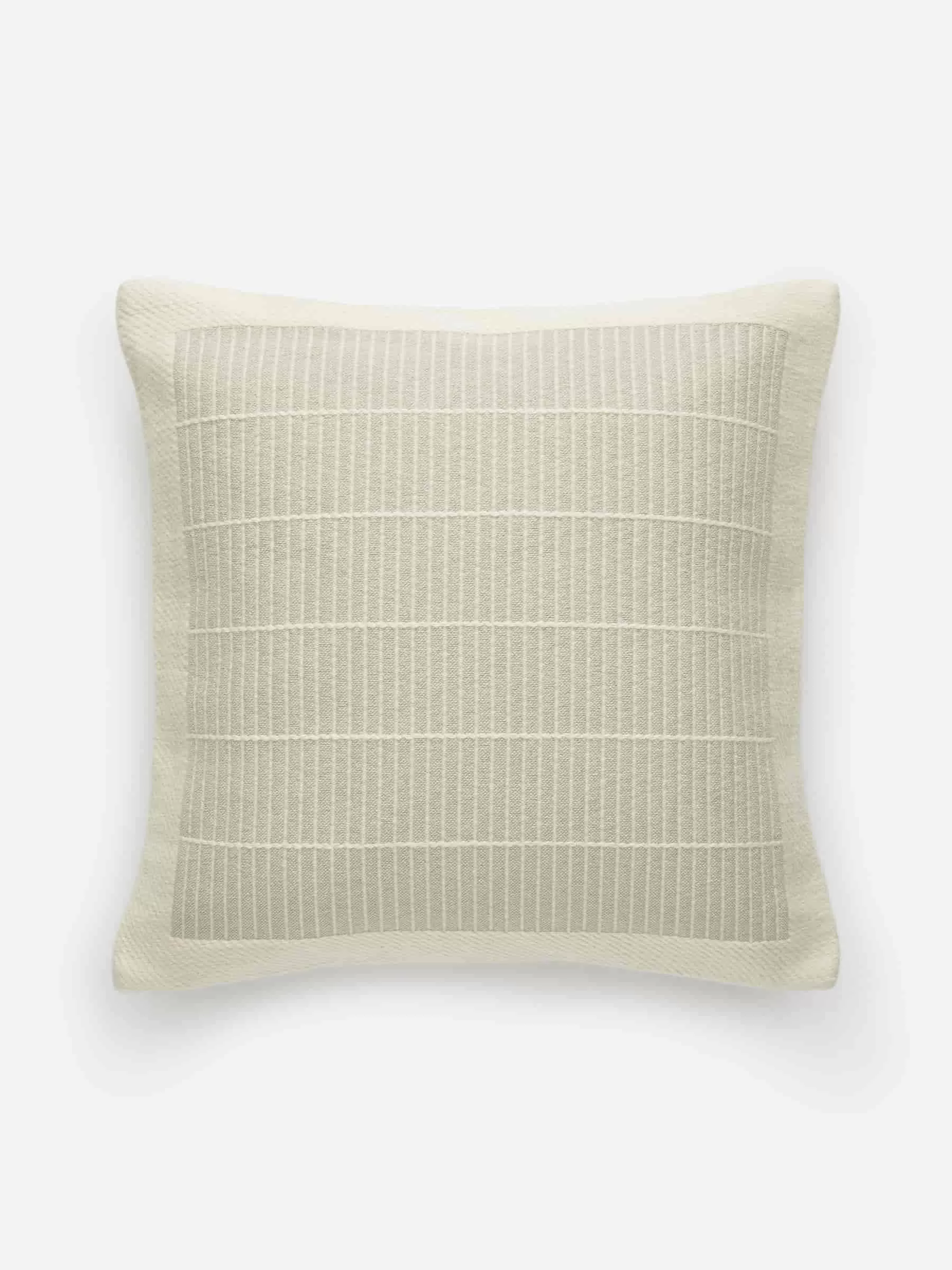 Cushion cover made from a cotton wool blend. Adorned with a woven pattern at both front and back. Concealed zip. Measurements 50 cm x 50 cm. Inner cushion is sold separately. The product contains 43% RWS wool (TE-00047206). Products certified to the Responsible Wool Standard (RWS) contain wool fiber from farms independently certified to animal welfare and land management requirements.