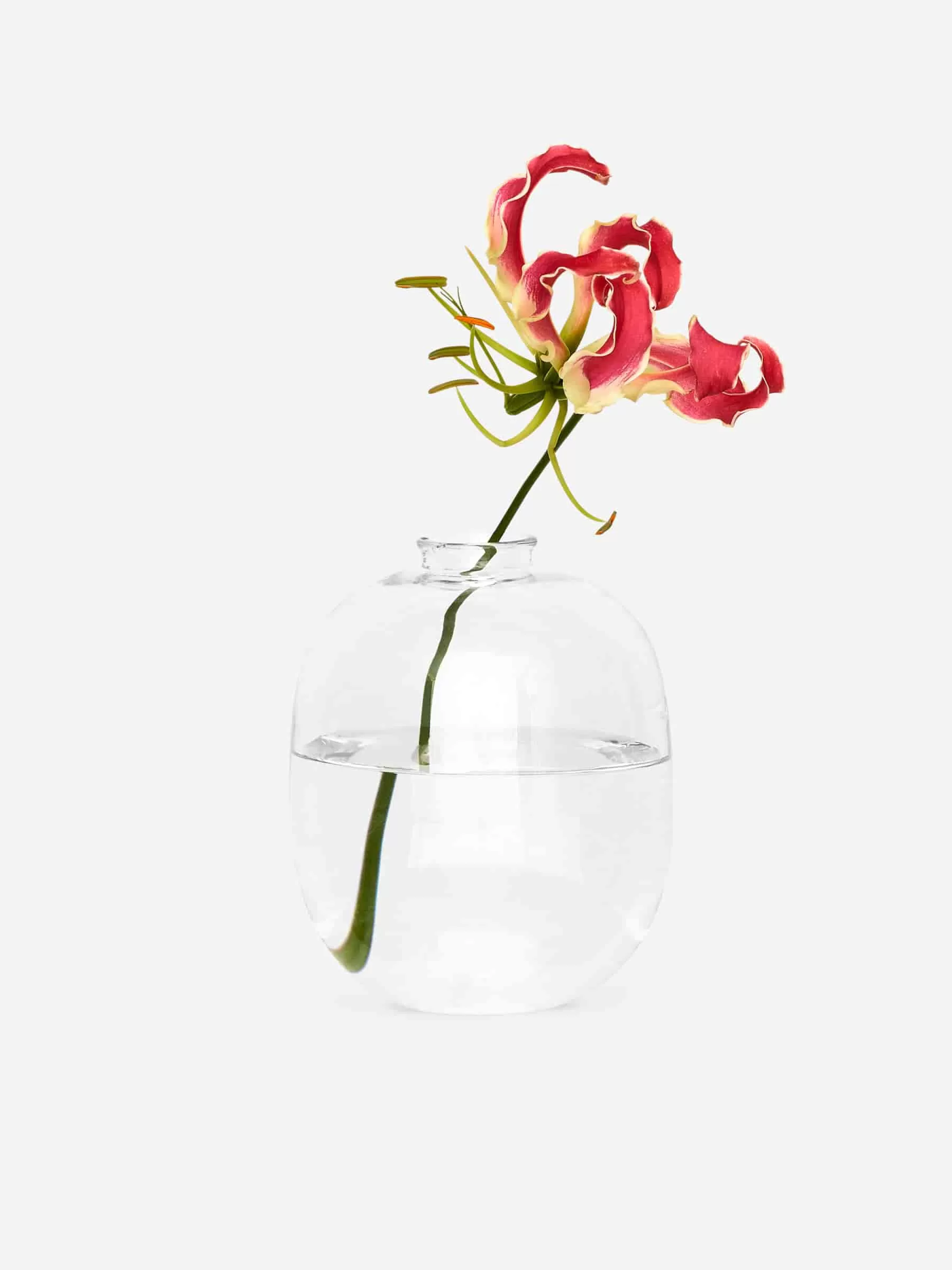 Small glass vase with an organic round shape and an edged brim that lends itself to placing single twigs or cuttings. Diameter 10 cm. Height 12.3 cm.