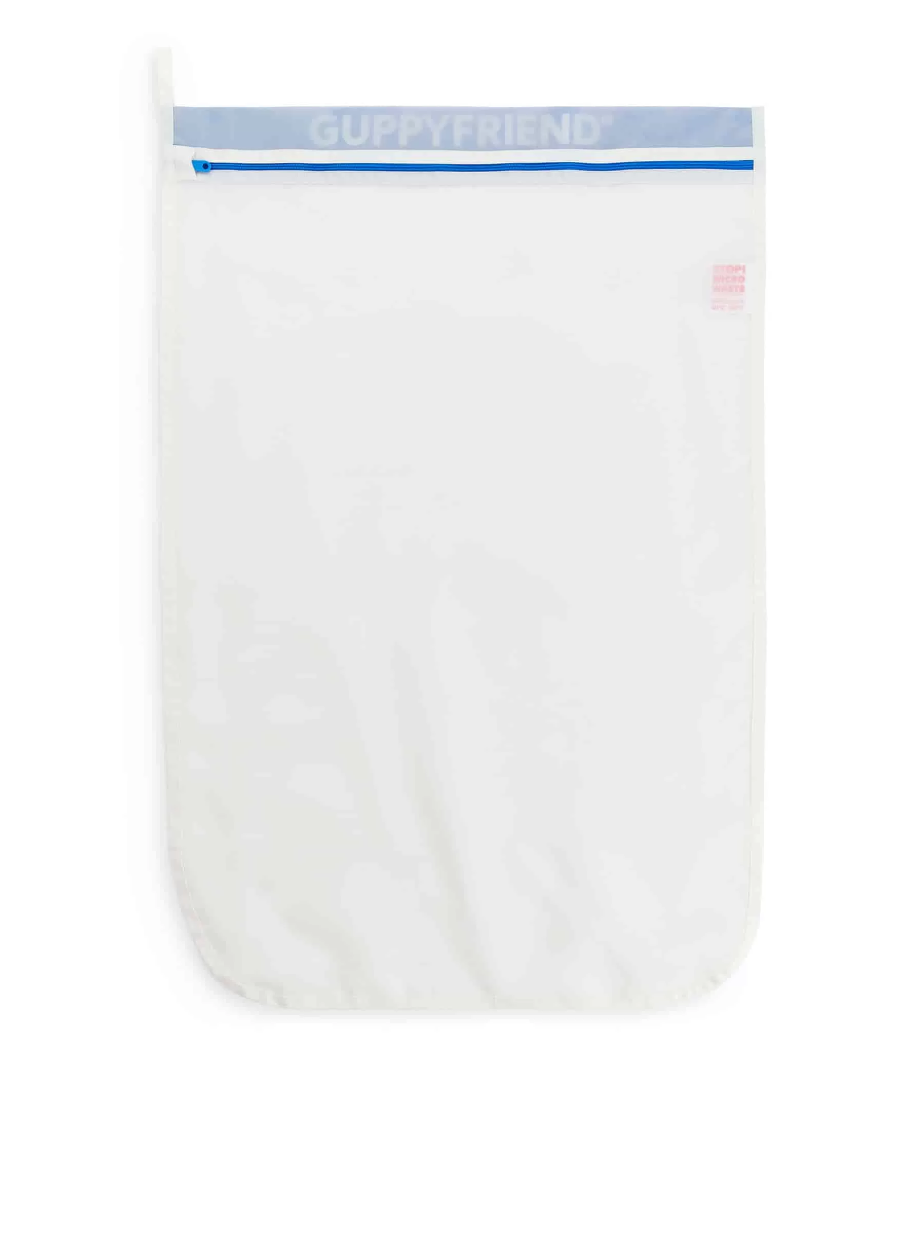 The Guppyfriend washing bag is a filtering solution that prevents synthetic microfibre pollution during the laundry. Created by German non-profit organisation STOP! Micro Waste, the bag collects shredded fibres from synthetic textiles during machine washing, keeping them from being rinsed down the drain. It also reduces friction, preventing the shredding of fibres and extending the life span of clothing. Measurements: 50 cm x 74 cm. HOW TO USE: 1. Put synthetic textiles in the Guppyfriend bag. For optimal washing, the bag should only be half full. 2. Close the bag and wash as usual. 3. After washing, take out the wet textiles from the bag. 4. The released microfibres will have accumulated at the hems and corners in the interior of the bag. Collect them and dispose them properly.