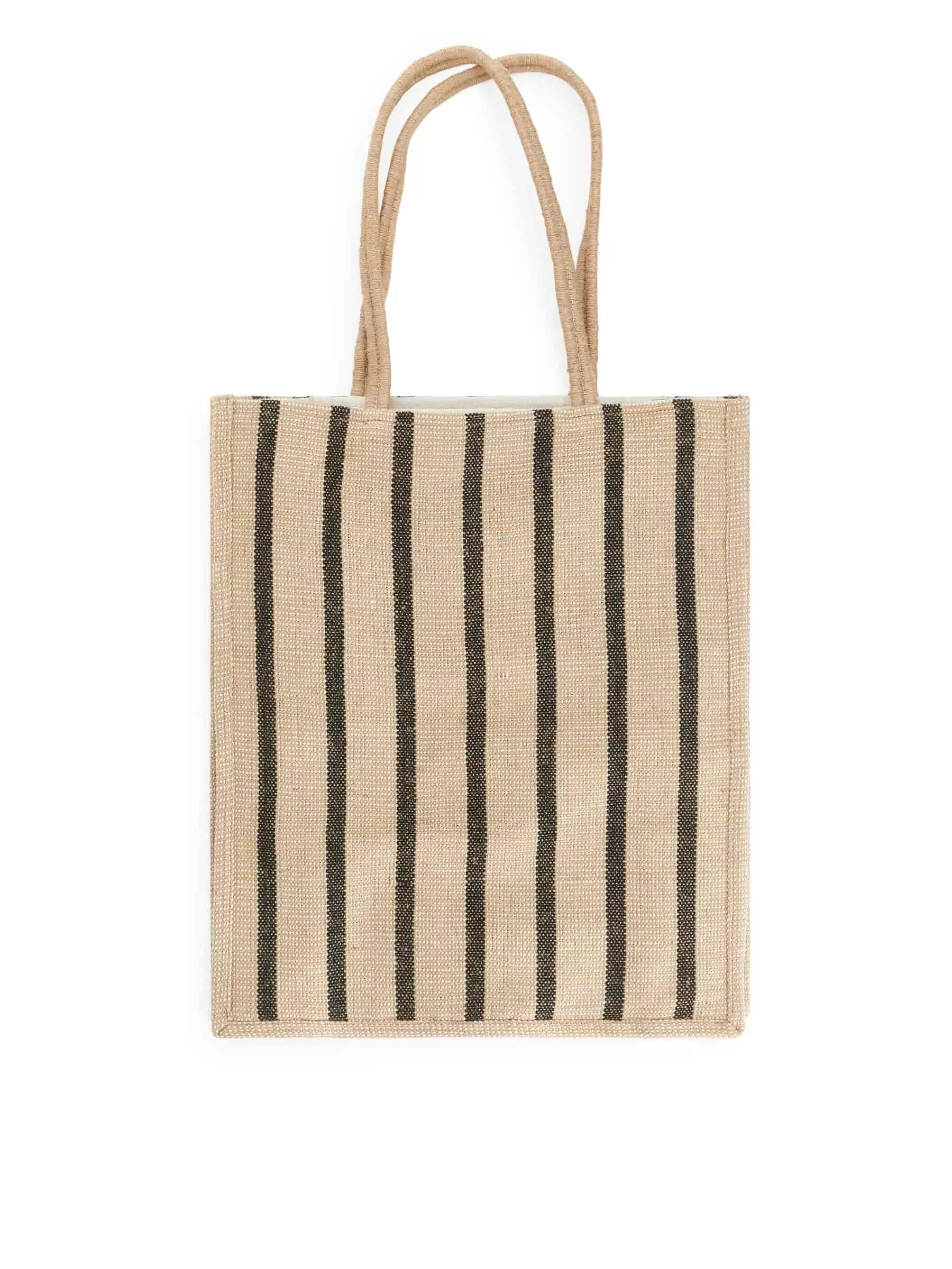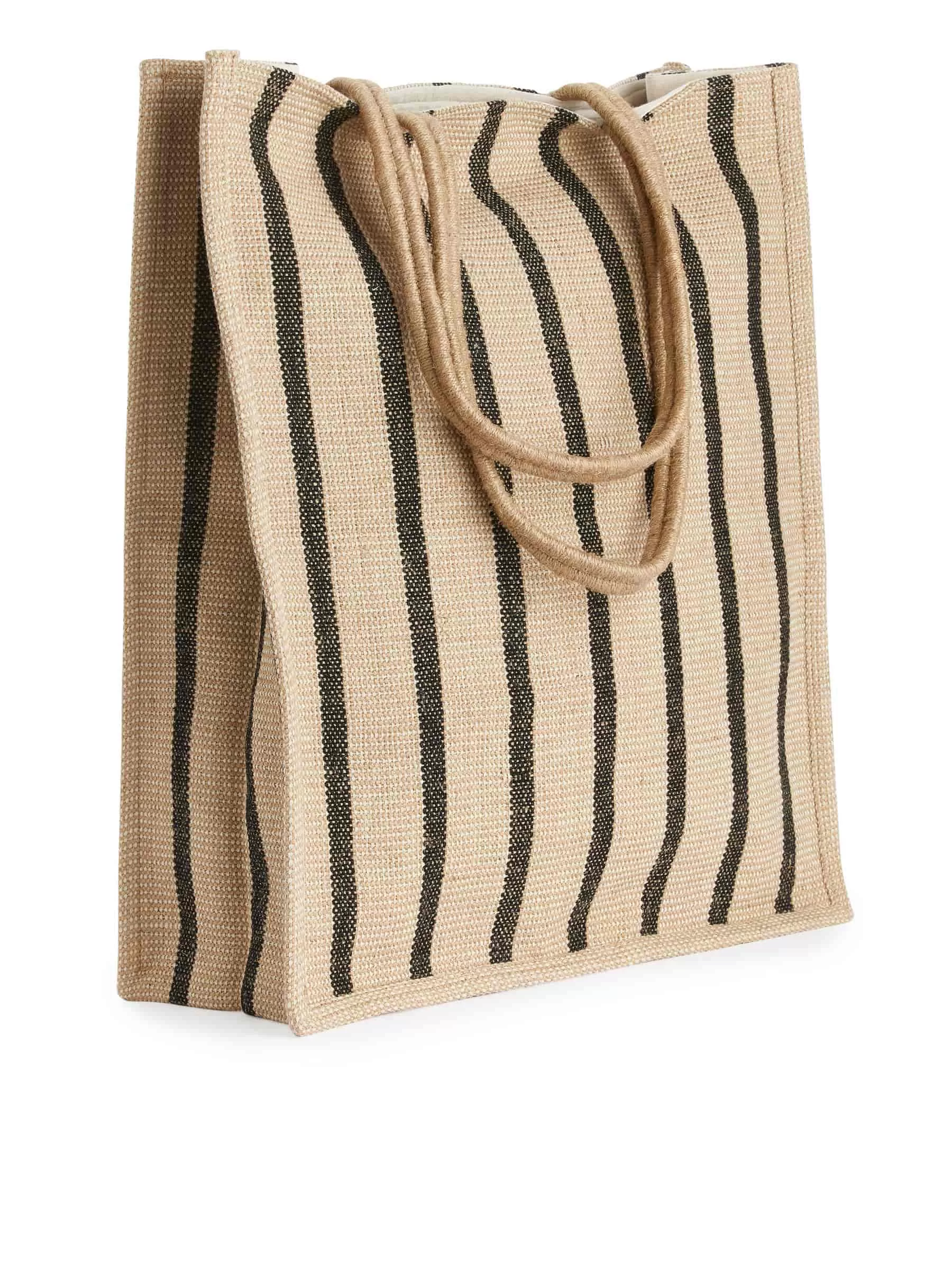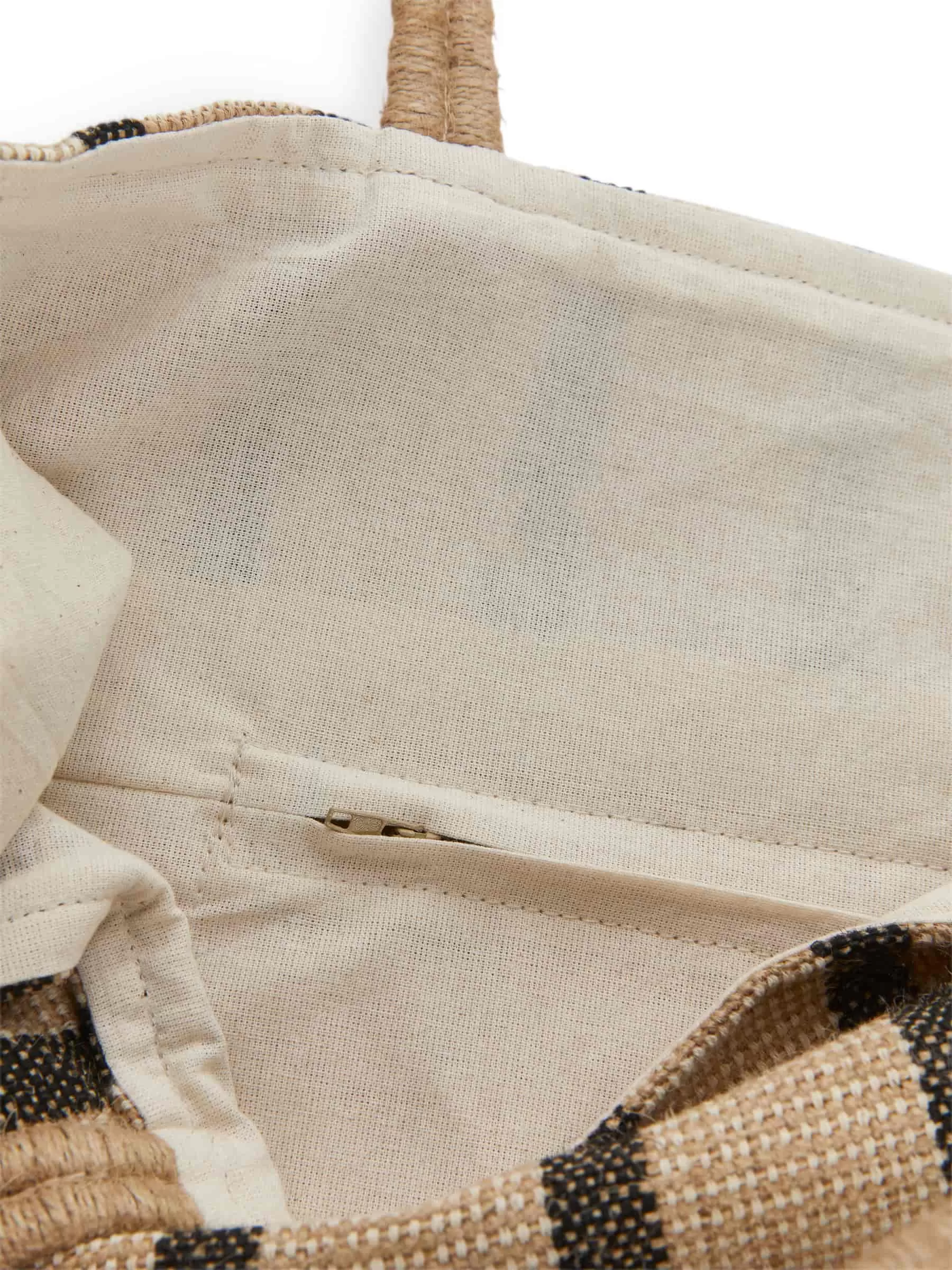 Woven tote bag made of jute. Styled with double handles and a striped pattern. Cottin lining and a small inner pocket with zip closure. Dimensions 48 cm x 40 cm.