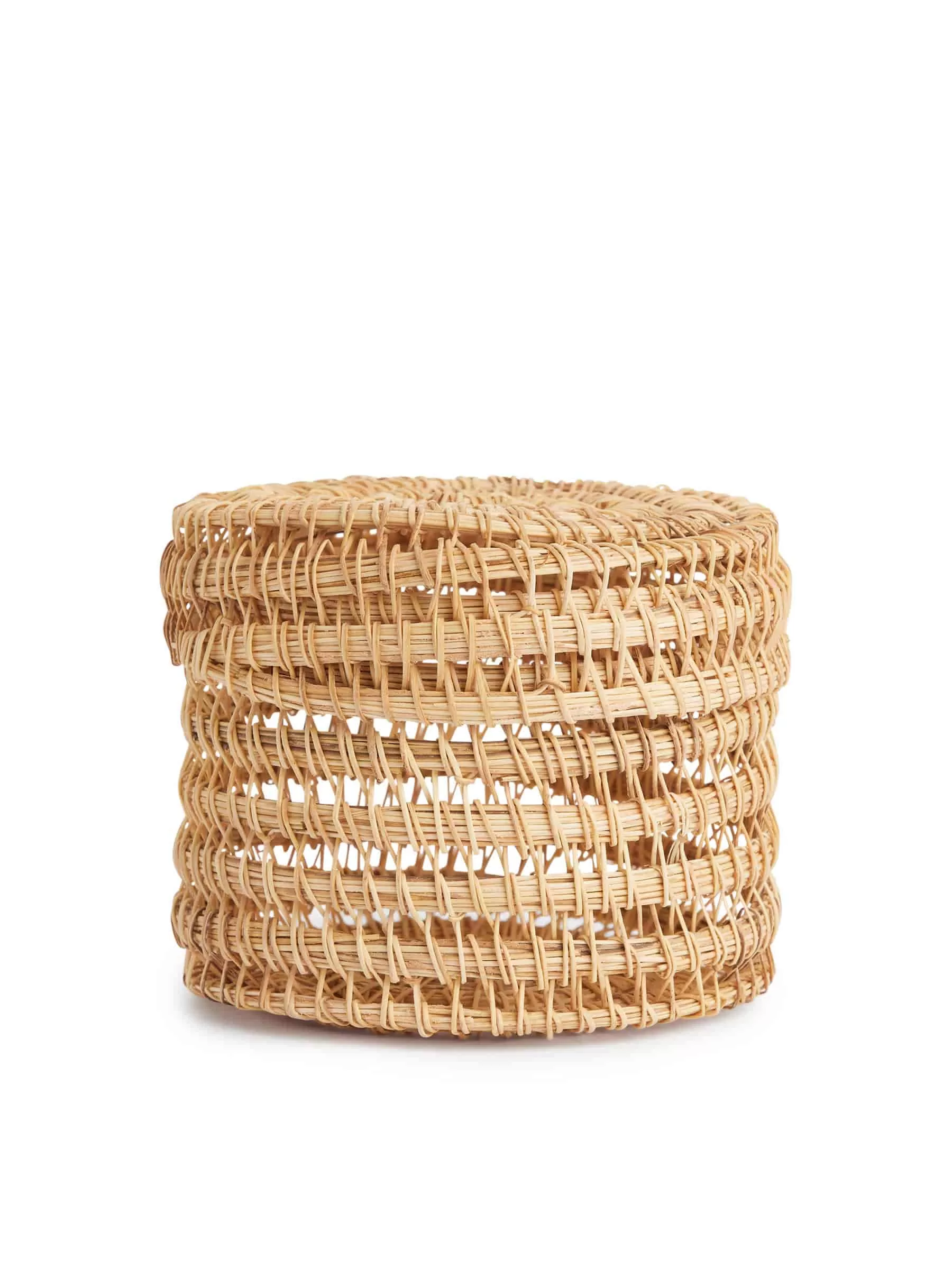 Storage box with lid woven from palm fibre. Width 10.5 cm, height 8 cm.