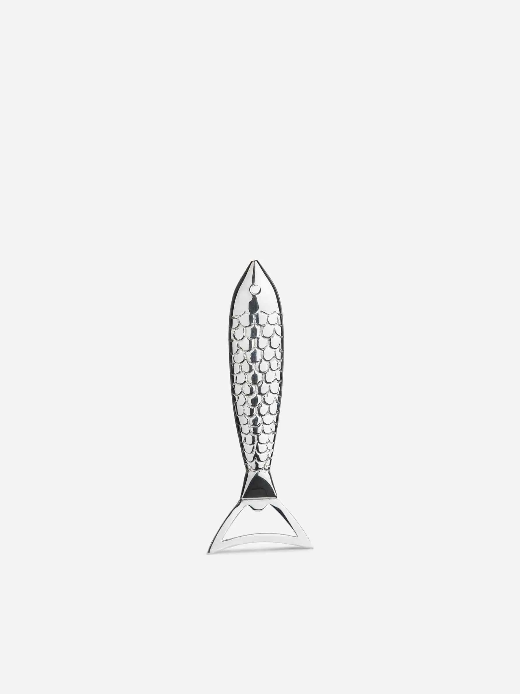 Fish-shaped bottle opener handmade from brass with a silver plated finish. Length 14.5 cm.