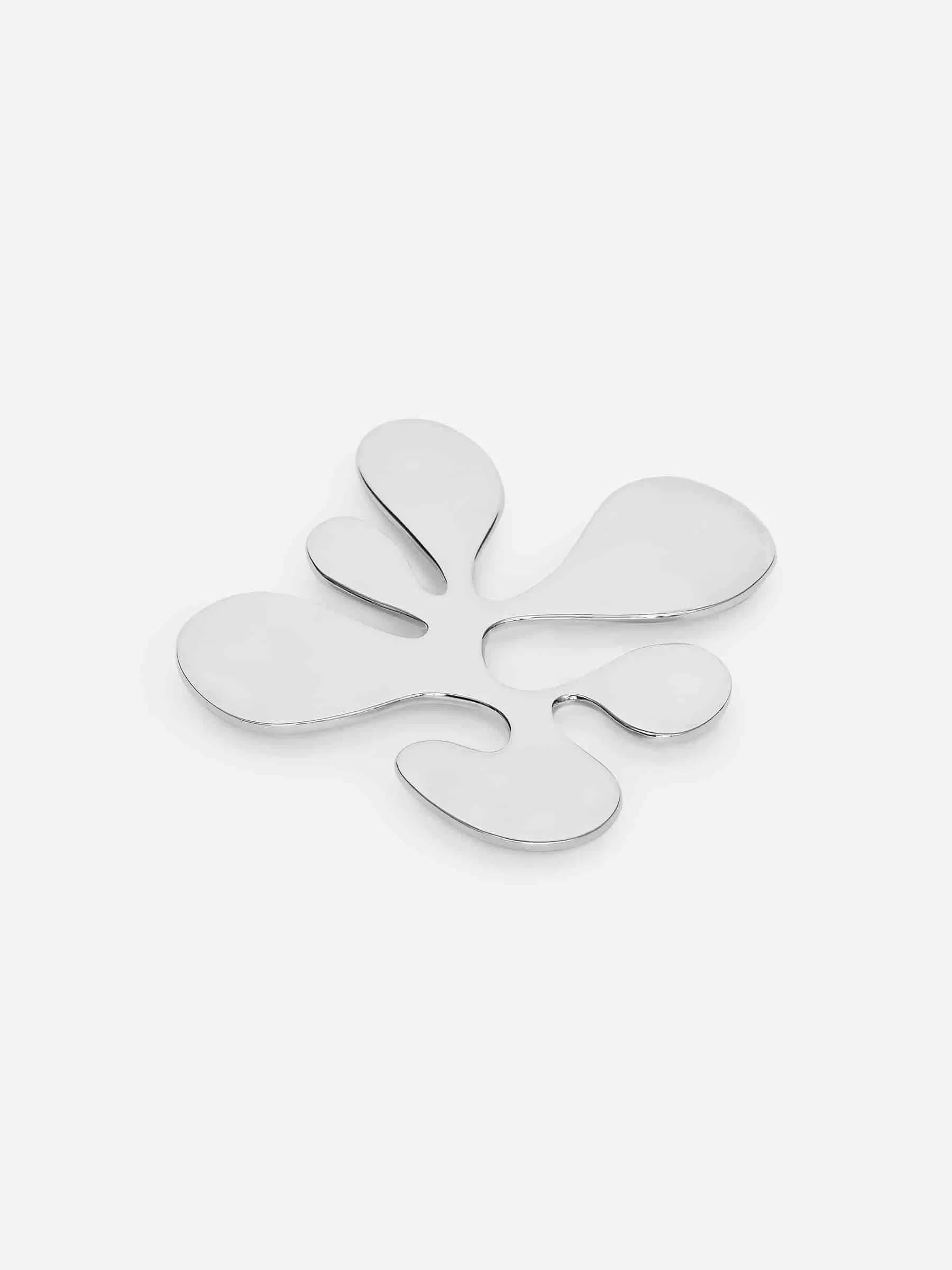 Trivet crafted from silver-plated brass. A weighty piece for placing hot pots and pans. Feet with silicone to protect the table. Measurements 12.3 cm x 11.7 cm x 0.6 cm.