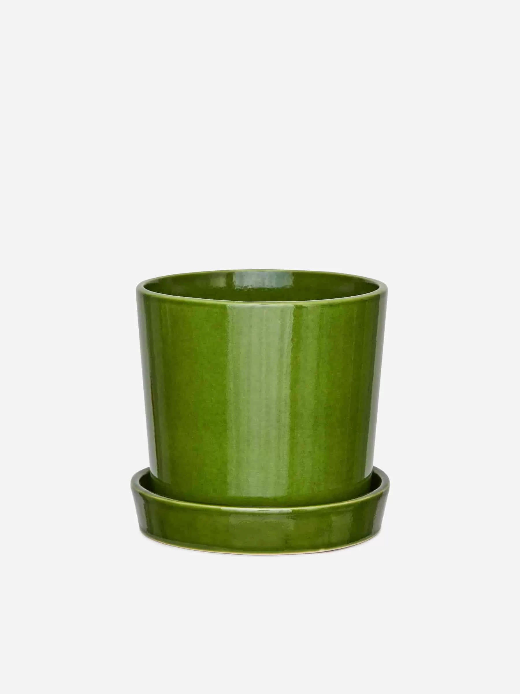 A flower pot made from glazed stoneware with a matching saucer. Hole in bottom and a high-rim saucer that collects excess water. Pot: height 170 mm, diameter 180 mm. Saucer: height 35 mm, diameter 185 mm.