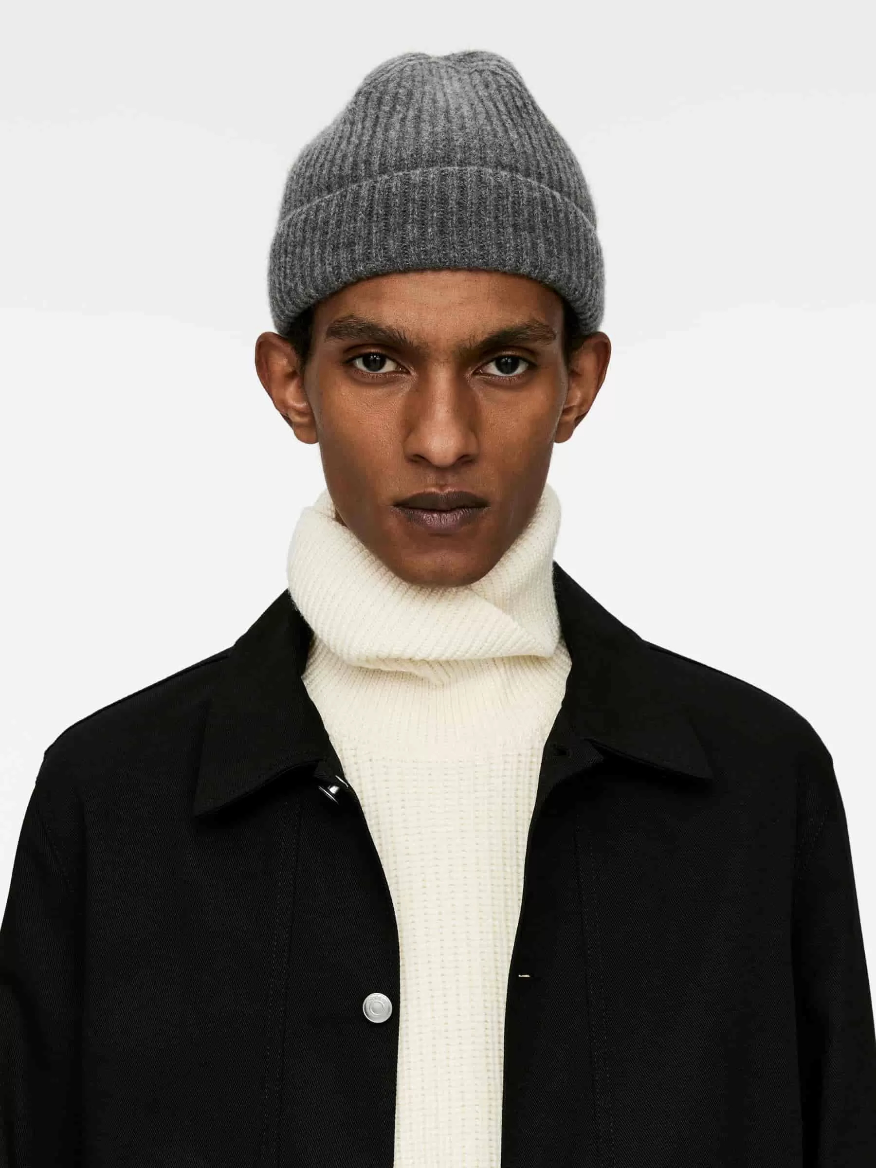 Beanie knitted in a full cardigan stitch made from a soft, warming blend of cashmere and merino wool. Styled with a 6 cm fold up.