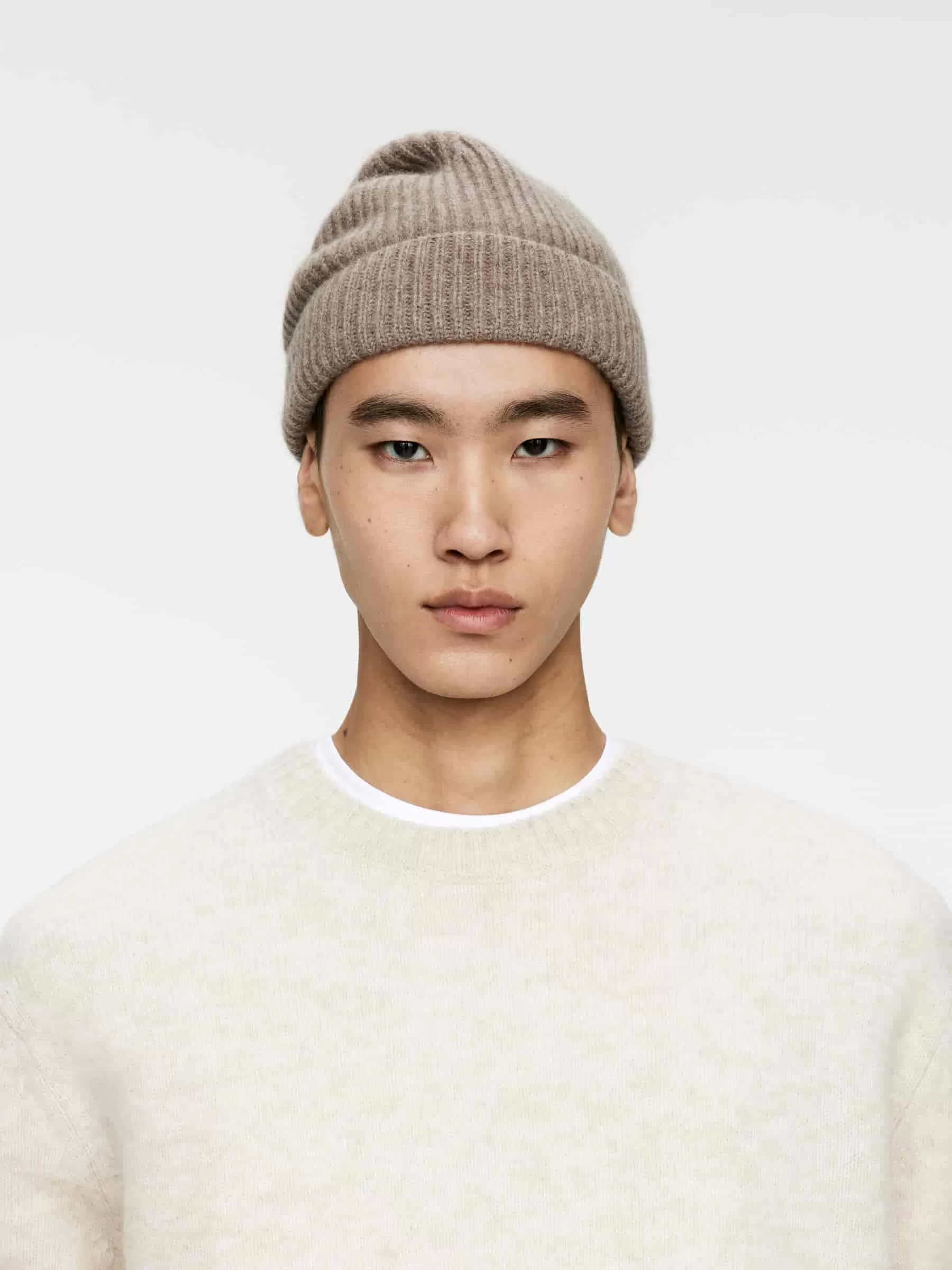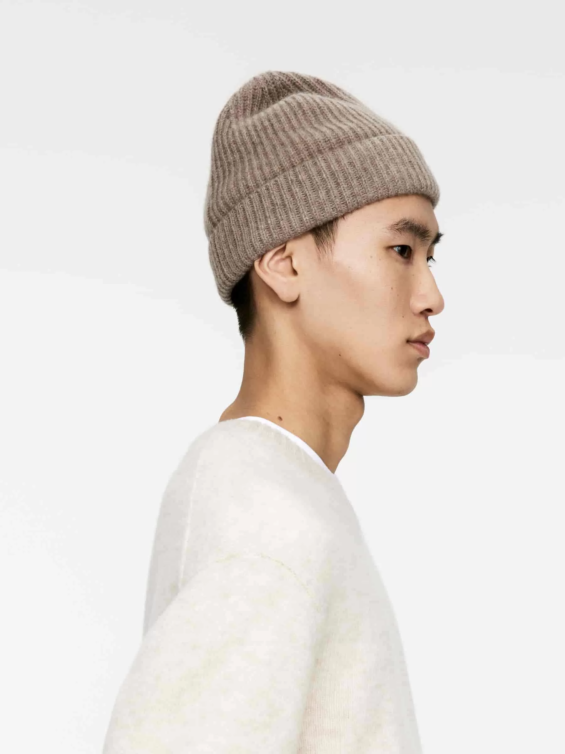Beanie knitted in a full cardigan stitch made from a soft, warming blend of cashmere and merino wool. Styled with a 6 cm fold up.
