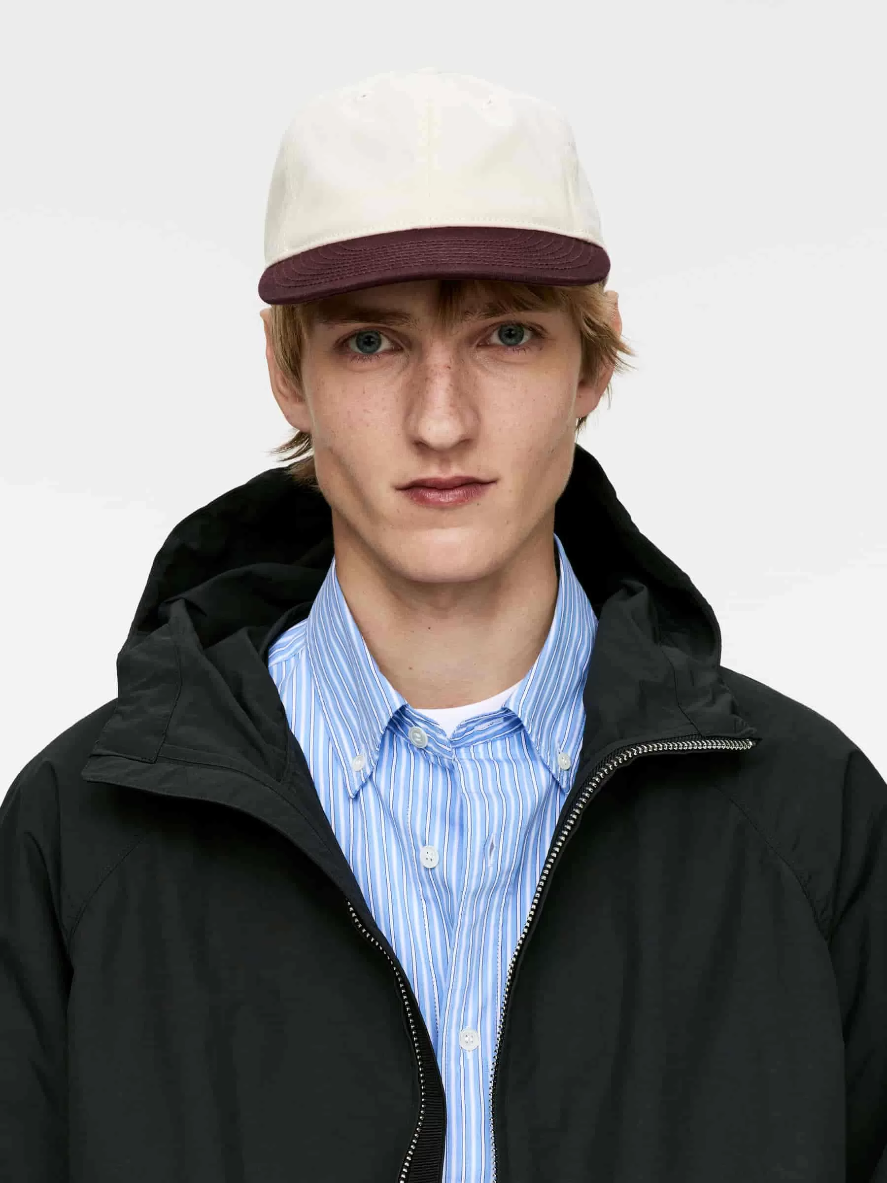 Clean-cut baseball-style cap. Metal buckle at the back to adjust the fit.