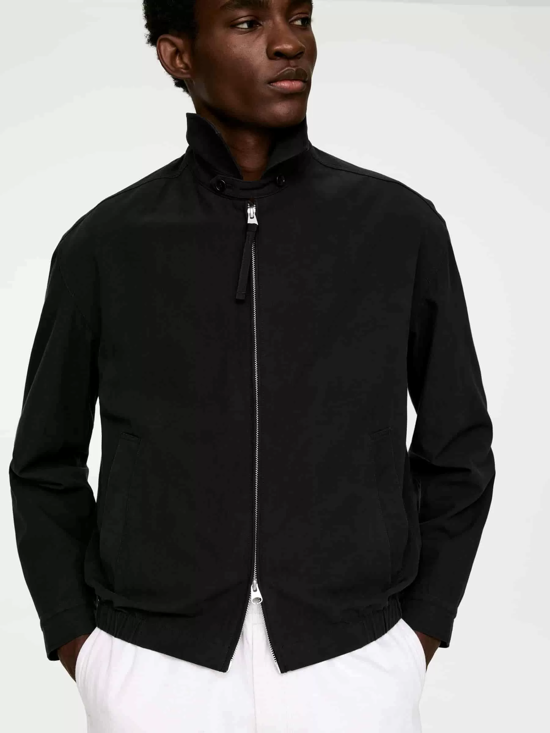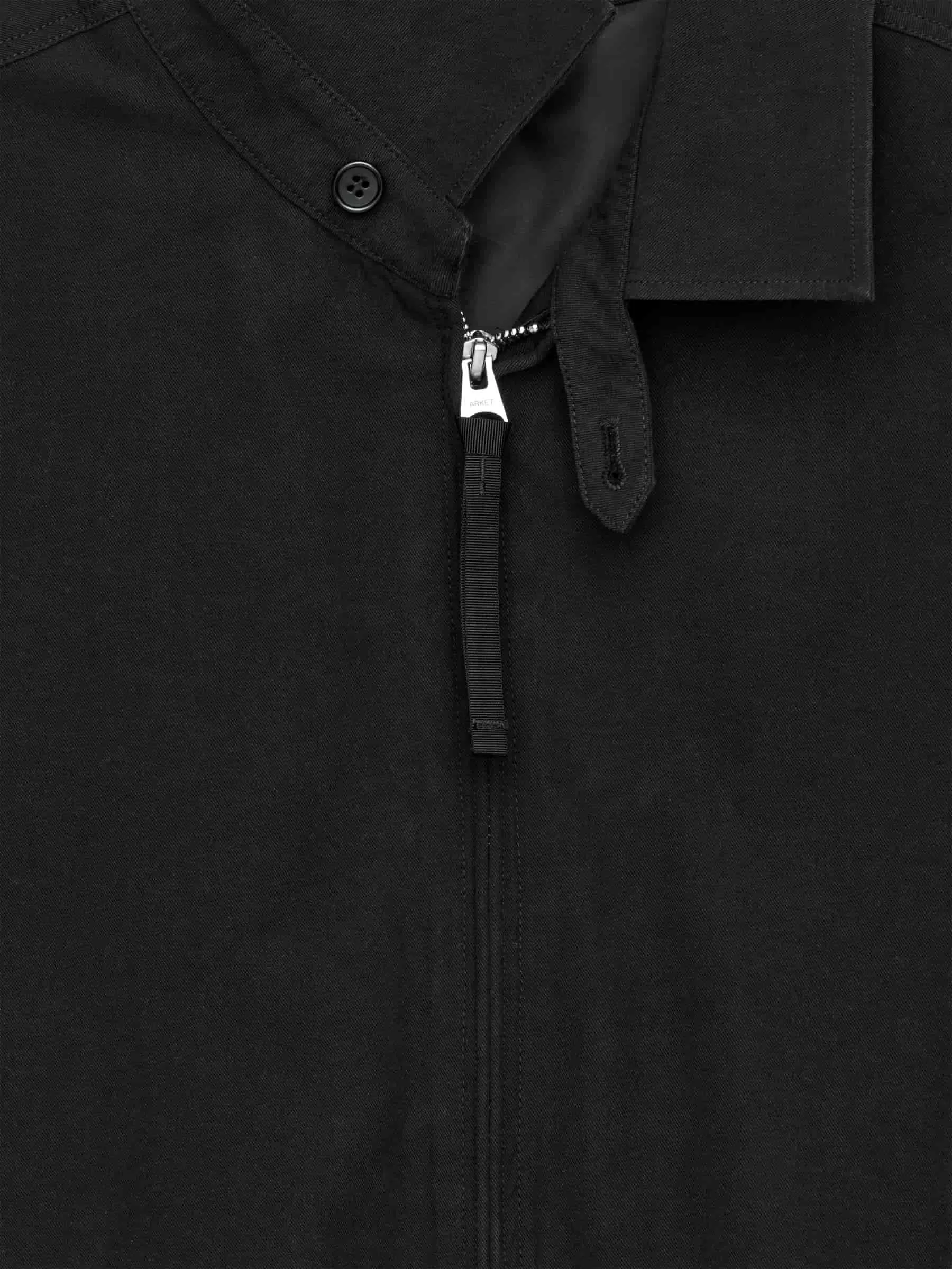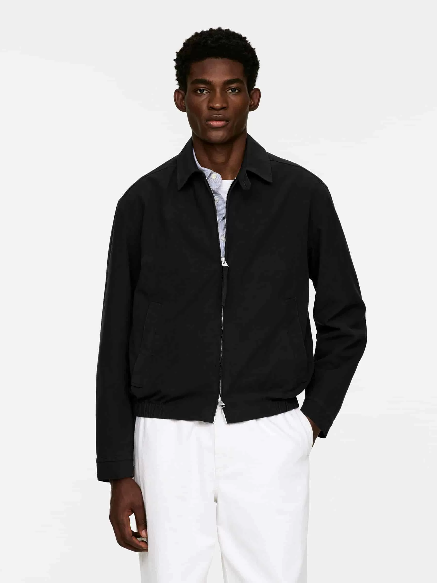 Blouson in cotton twill. Cut for a regular fit with elastics at bottom hem. The jacket is styled with a regular collar, a two-way zip at front and slanted welt pockets with hidden snap buttoning. Buttoned cuffs. Two inner pockets. Fully lined.