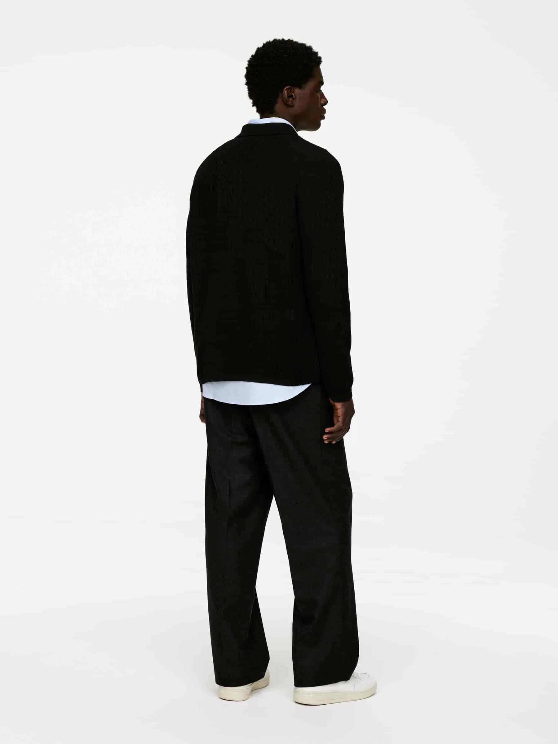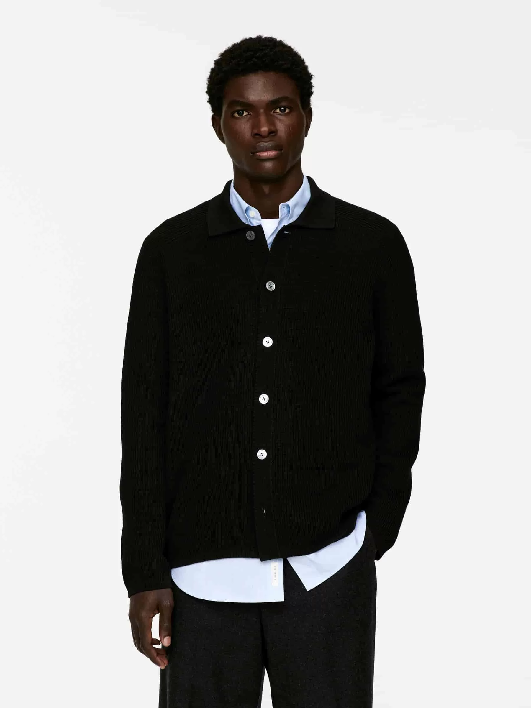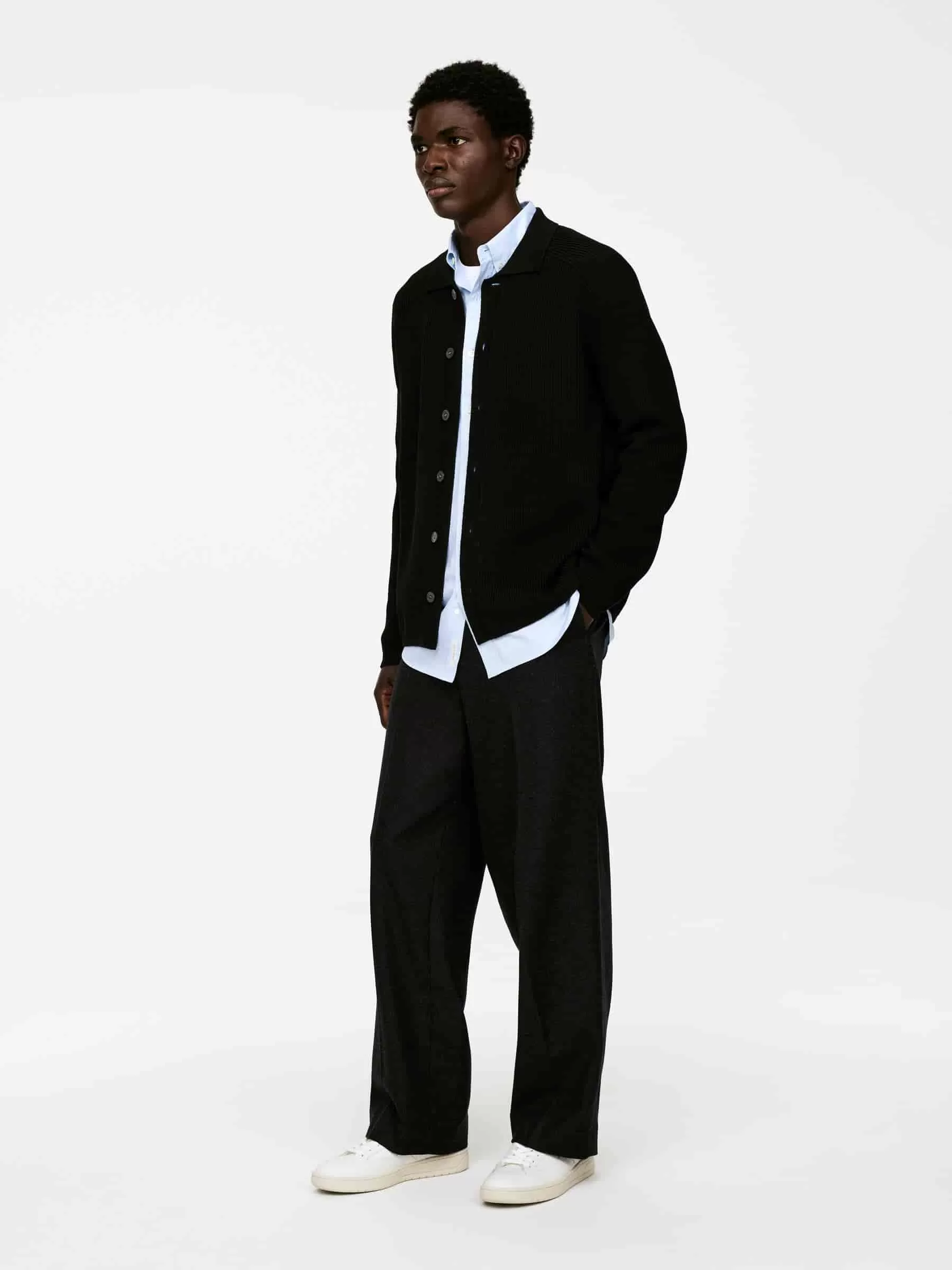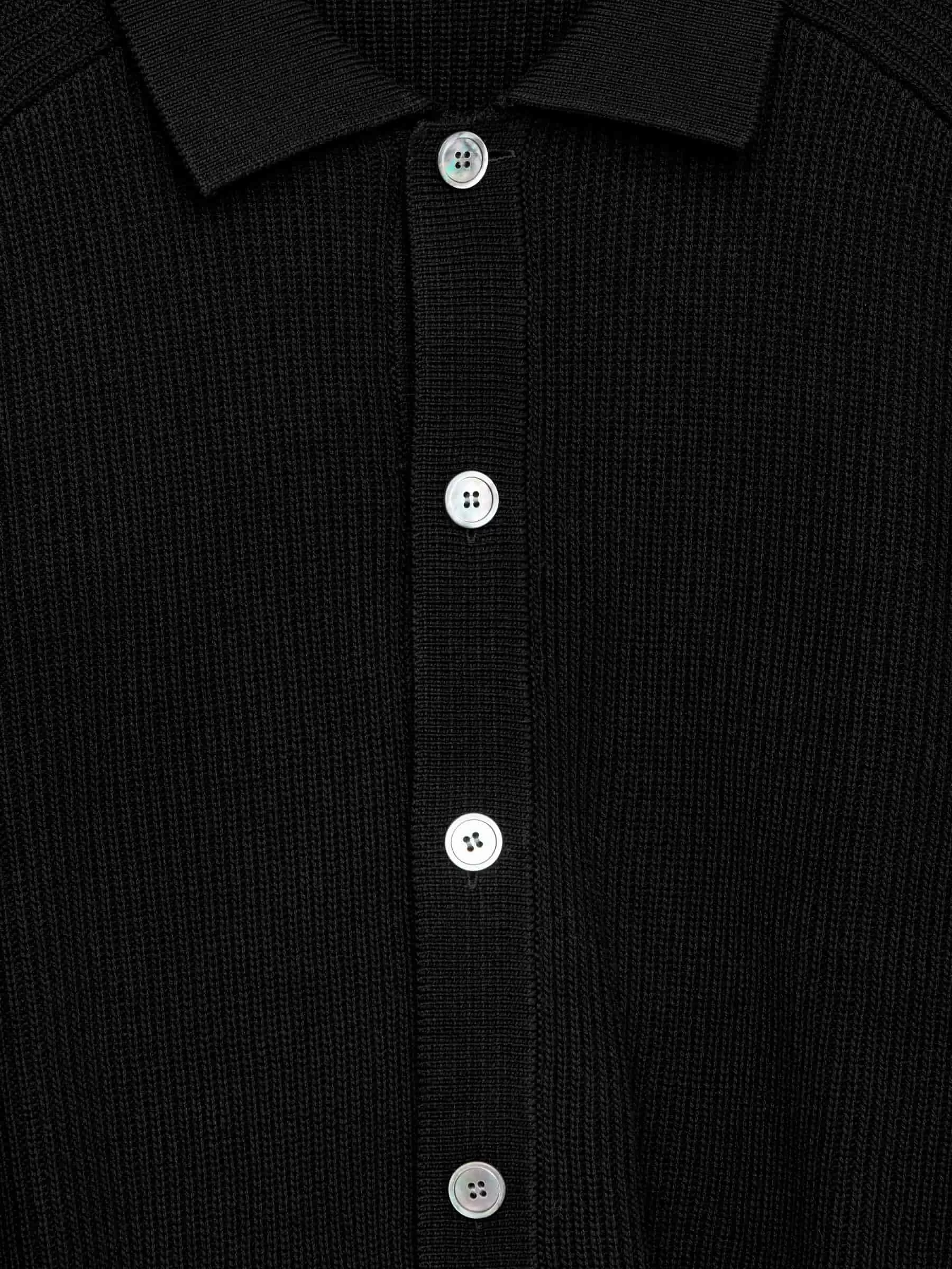 Cotton cardigan knitted in a half-cardigan stitch. A straight-cut style with a collar, a front placket with buttoning, and raglan-cut sleeves.