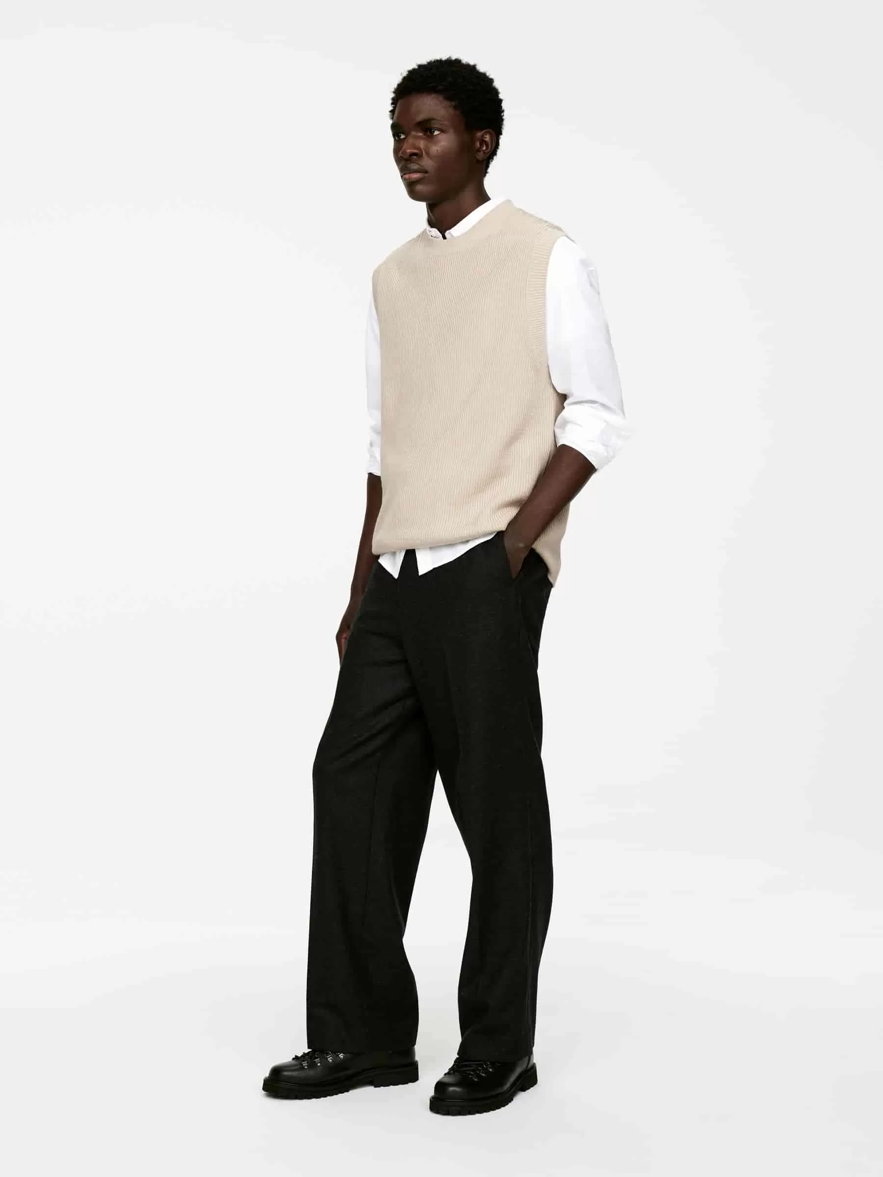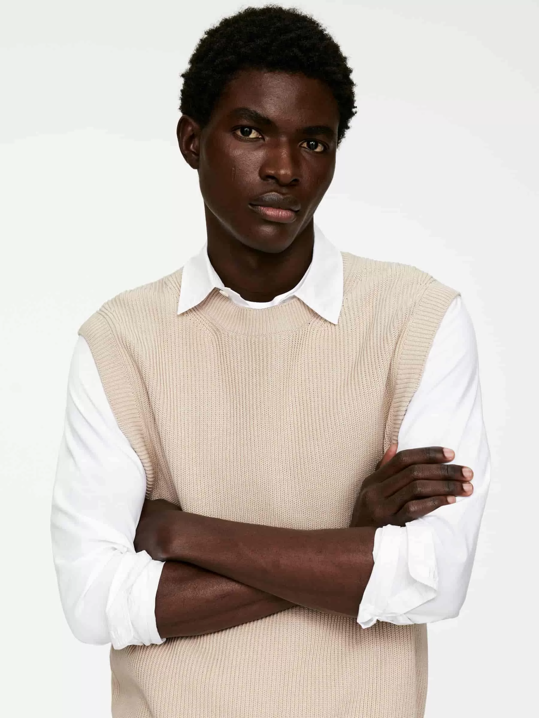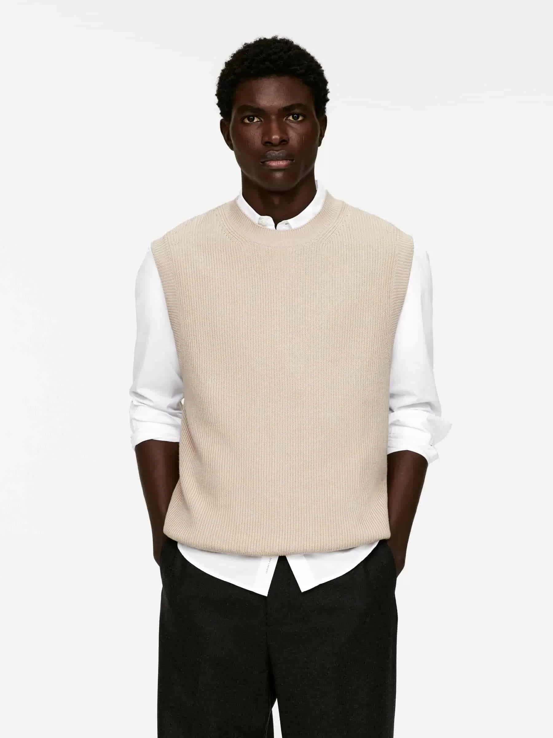 Cotton vest knitted in a half cardigan stitch. Styled with ribbed trims and a relaxed fit.